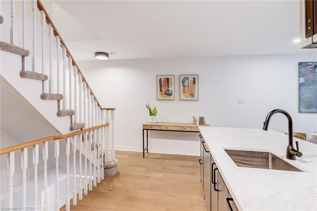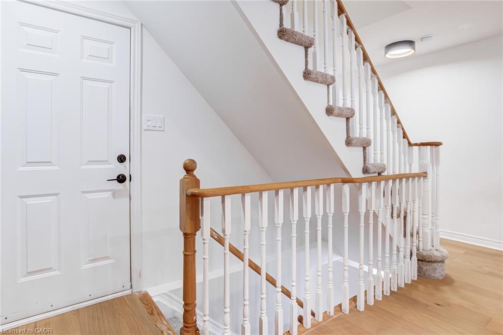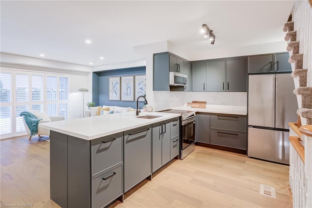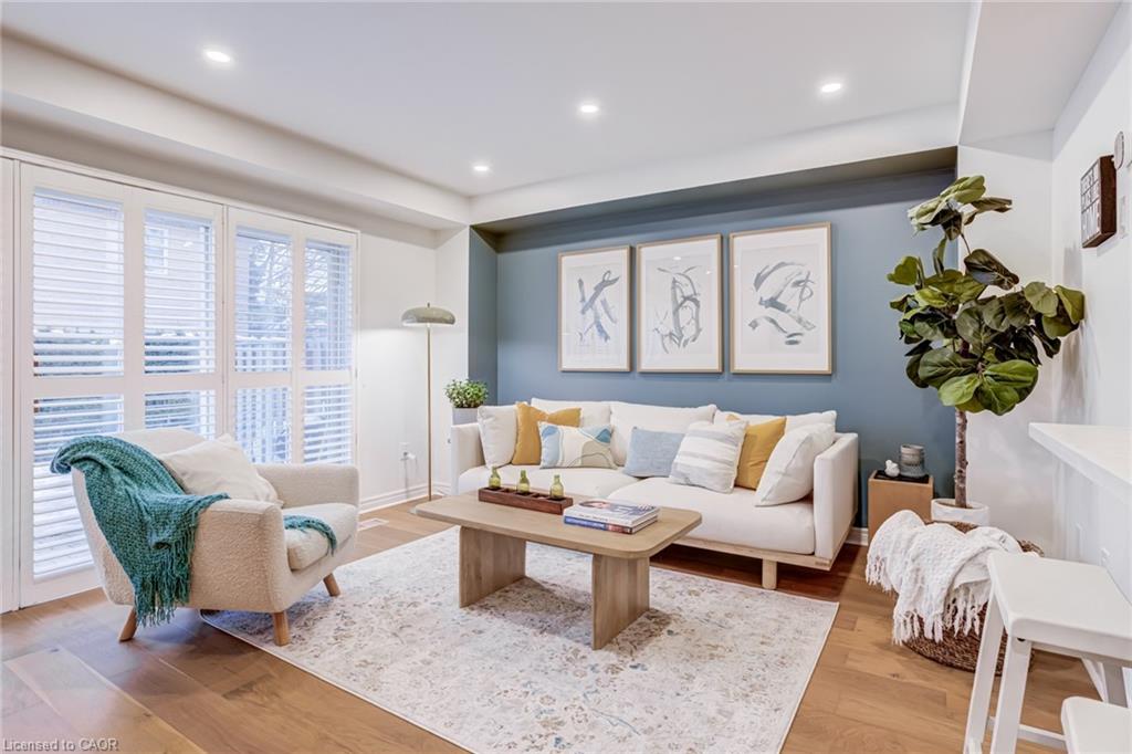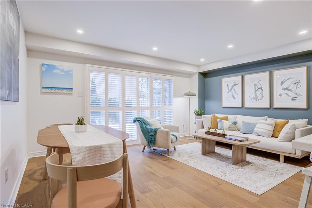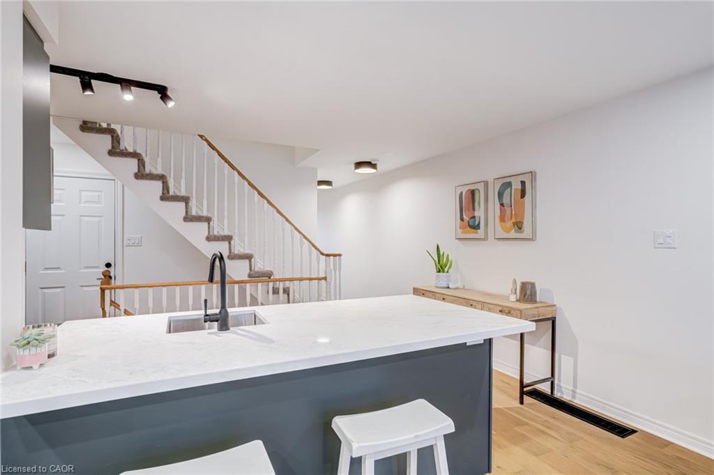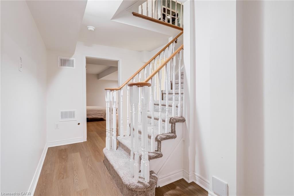 Recently refreshed this stylish 3+1Bed, 2.5 bath condo townhouse is sure to delight. Entering a spacious entrance with closet, you see the fresh hardwood and pass by a moody powder room en route to the brand new kitchen. A large quartz covered peninsula offers entertaining space and the layout offers tons of drawers and space for your gadgets. You’ll be charmed by the lovely living/dining space that fills with light out the from the expansive patio doors leading to your private outdoor space. Up the cushy newly carpeted stairs you’ll find a large family bathroom with new double vanity which shares a separate access to the large primary bedroom complete with a walk in closet. The other two bedrooms upstairs are also a great size with the smaller also having its own walk in closet. From the main floor kitchen you’ll be able to access the single car garage or go down the stairs to a new basement washroom with stand-up shower, a substantial bedroom and a finished laundry room with the whole floor being finished in new vinyl plank flooring. The townhouse is located in a small, exclusive feeling community of only 30 units. You’re a quick walk to schools, an easy bike ride to a local plaza with groceries and restaurants, and an easy drive to access the 403+QEW. This is your opportunity to move into a home with a great layout, fabulous neighbHours, newly updated systems and decor and all in a fantastic location.