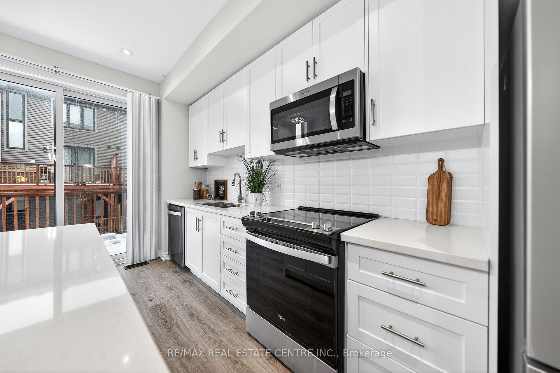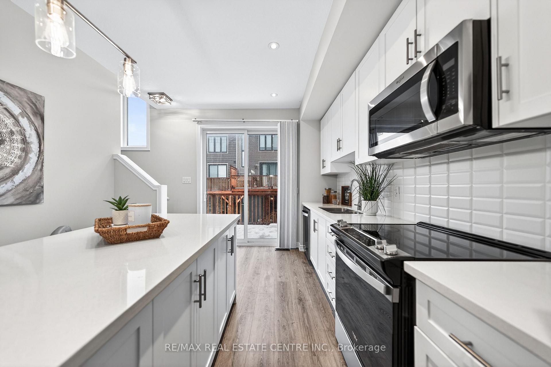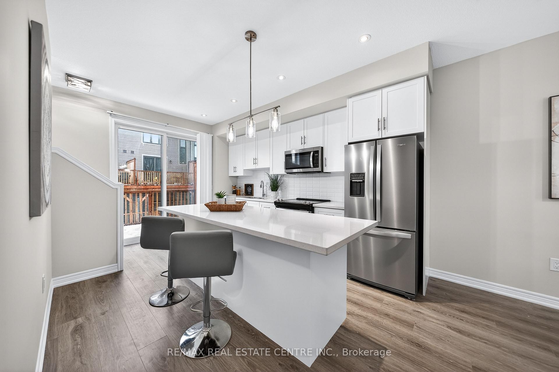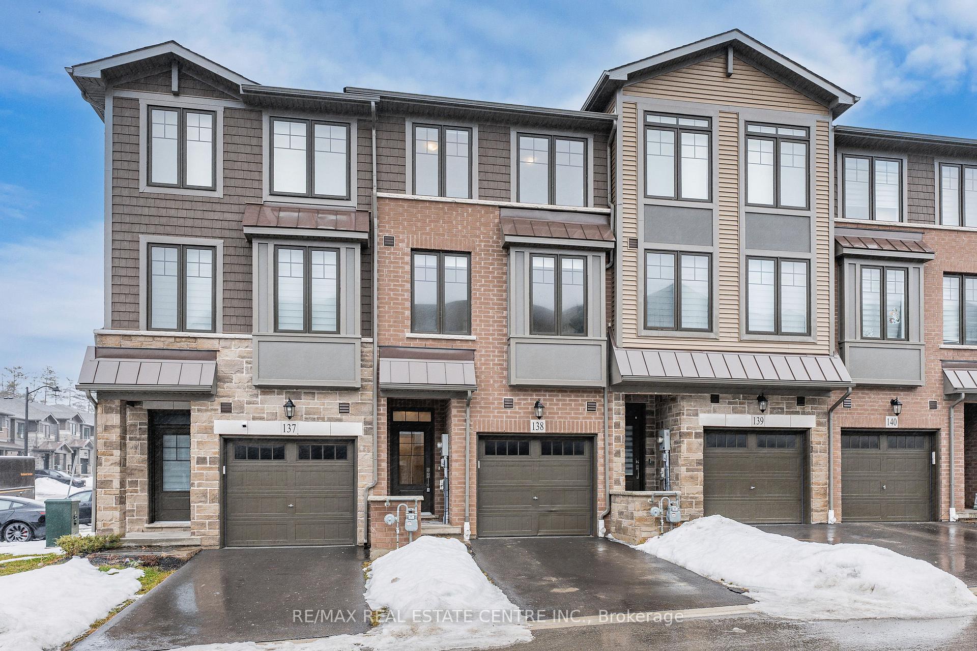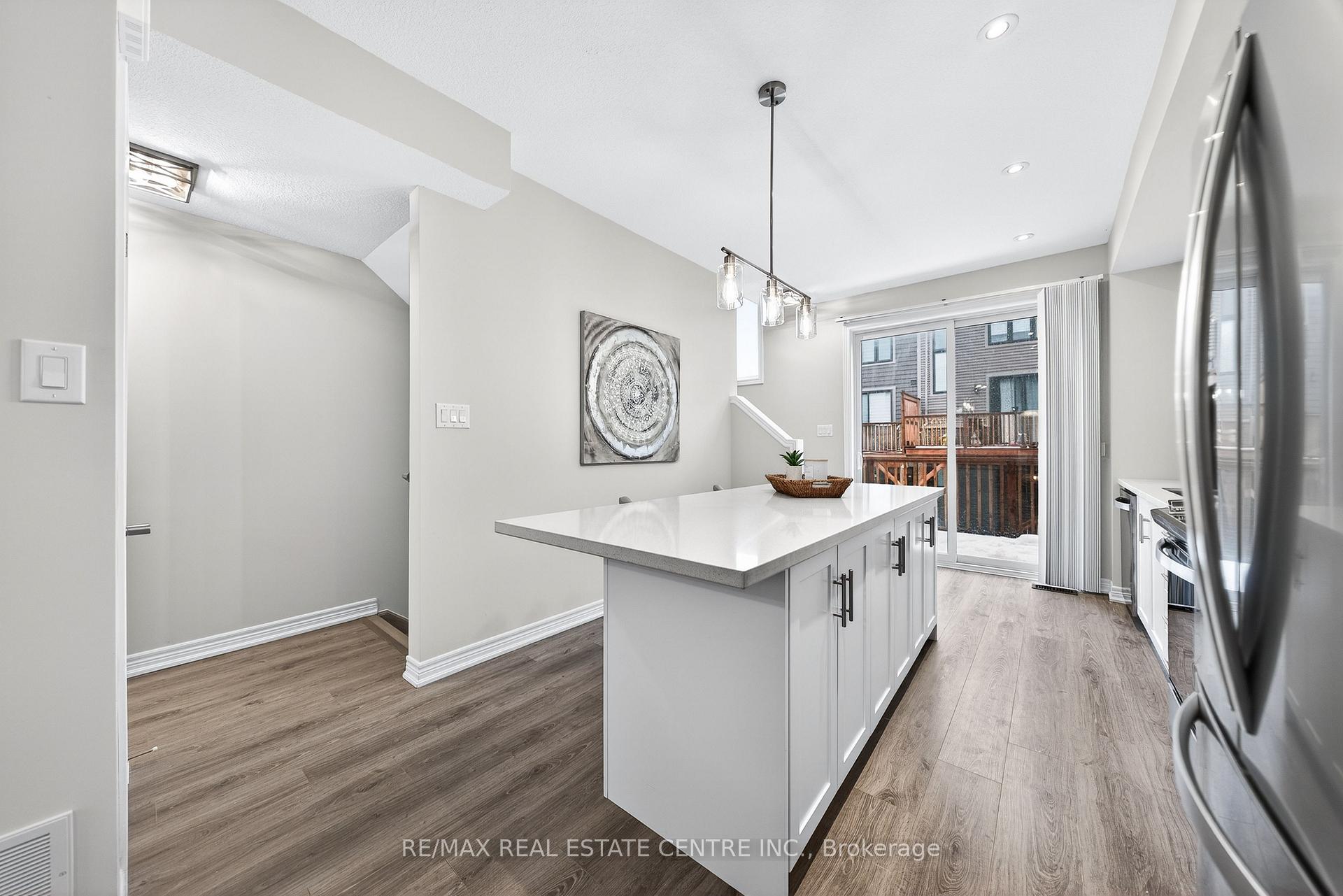 Welcome to this exceptional, freshly painted move-in ready townhome nestled in one of Cambridge’s most desirable communities. Thoughtfully designed for modern living, this bright and beautifully appointed home features 9 ft ceilings, elegant finishes, and a spacious open-concept layout that seamlessly blends style, comfort, and everyday functionality. Over 1900sqft of total living space. Perfect for first-time buyers, growing families, or professionals. The main living level impresses with an abundance of natural light streaming through oversized windows, highlighting a warm and inviting living space anchored by a sleek electric fireplace. The contemporary white kitchen is both stylish and practical, showcasing quartz countertops, a large center island with breakfast seating, stainless steel appliances, subway tile backsplash, and ample cabinetry, all complemented by convenient roll-down blinds. Step outside to the private rear deck with privacy side panels, offering a peaceful retreat for relaxing or entertaining. A hardwood staircase leads to the upper level where three generously sized bedrooms provide comfort and versatility, each featuring large windows and neutral décor. The 4-piece bathroom includes a quartz vanity, soaker tub, and ceramic tile shower surround. Excellent location approximately 35 minutes to Mississauga, 15 minutes to University of Waterloo and Wilfrid Laurier University, and 20 minutes to University of Guelph. Walking distance to Walmart, Home Depot, Tim Hortons, Canadian Tire, Starbucks, and numerous shops, dining, and everyday amenities.
