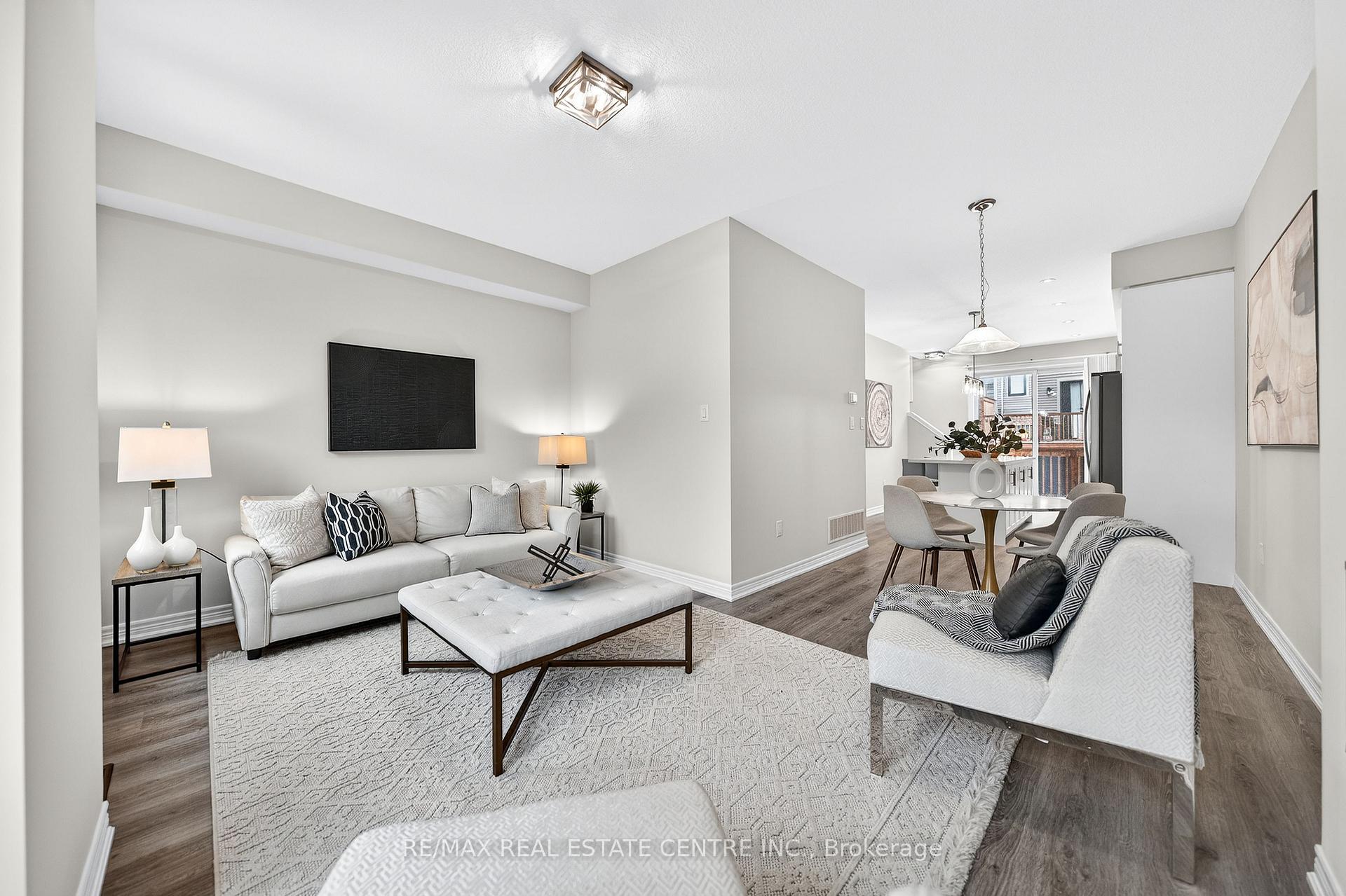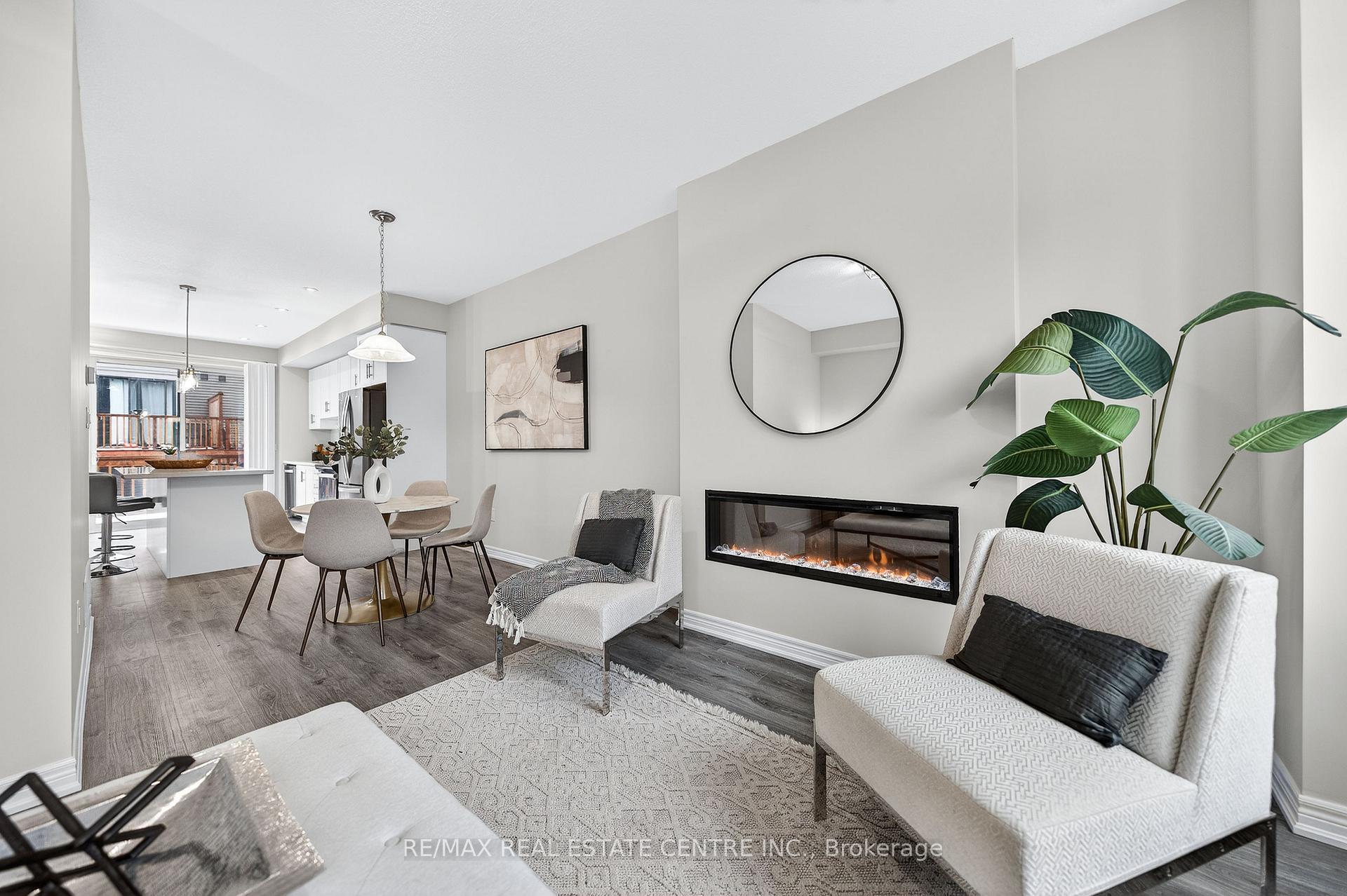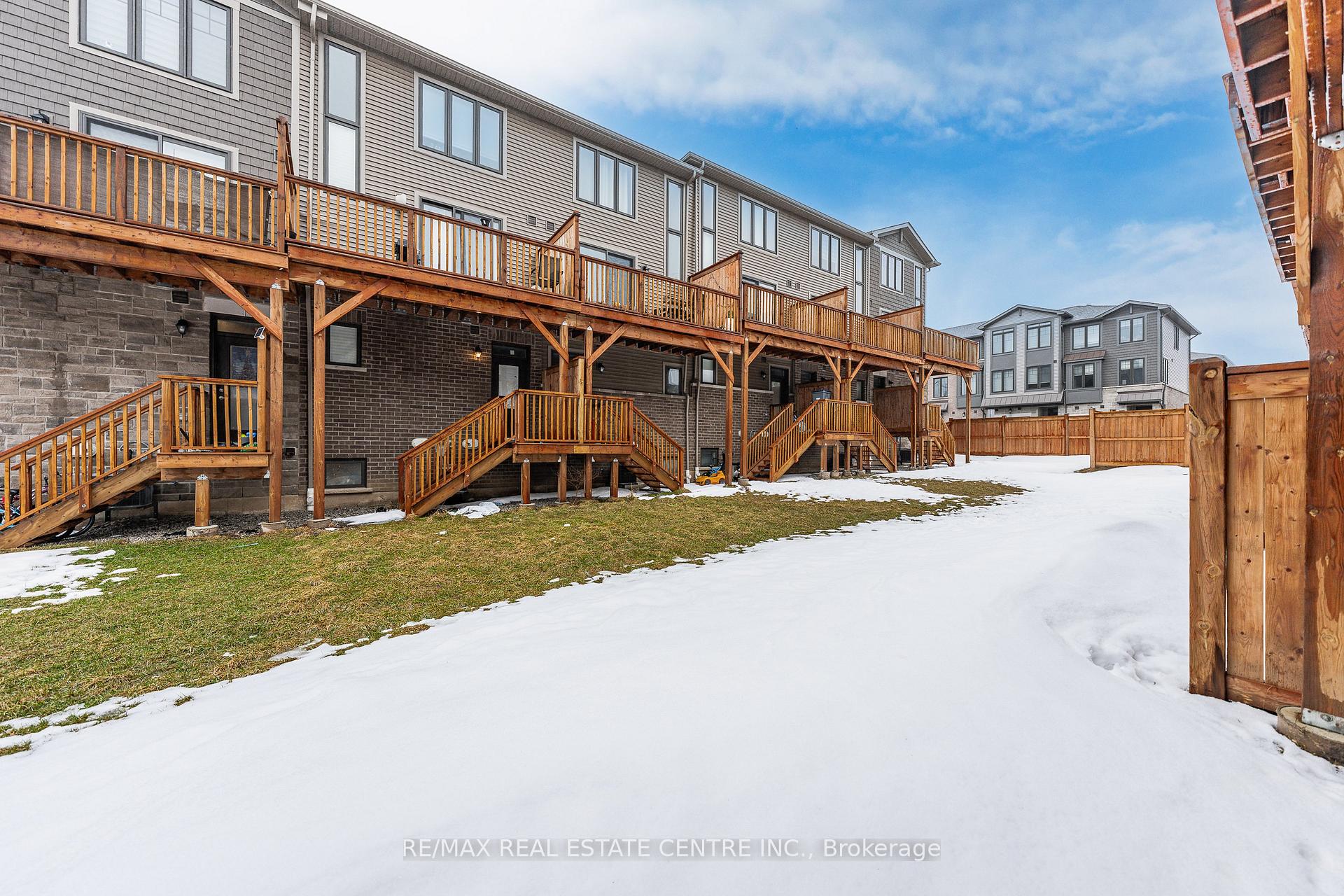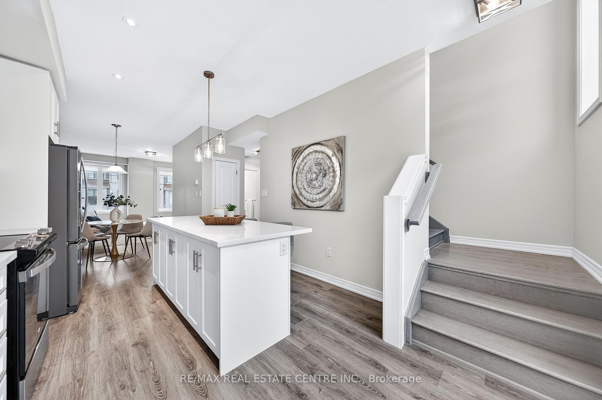 Welcome to this exceptional, freshly painted move-in ready townhome nestled in one of Cambridge’s most desirable communities. Thoughtfully designed for modern living, this bright and beautifully appointed home features 9 ft ceilings, elegant finishes, and a spacious open-concept layout that seamlessly blends style, comfort, and everyday functionality. Over 1900sqft of total living space. Perfect for first-time buyers, growing families, or professionals. The main living level impresses with an abundance of natural light streaming through oversized windows, highlighting a warm and inviting living space anchored by a sleek electric fireplace. The contemporary white kitchen is both stylish and practical, showcasing quartz countertops, a large center island with breakfast seating, stainless steel appliances, subway tile backsplash, and ample cabinetry, all complemented by convenient roll-down blinds. Step outside to the private rear deck with privacy side panels, offering a peaceful retreat for relaxing or entertaining. A hardwood staircase leads to the upper level where three generously sized bedrooms provide comfort and versatility, each featuring large windows and neutral décor. The 4-piece bathroom includes a quartz vanity, soaker tub, and ceramic tile shower surround. Excellent location approximately 35 minutes to Mississauga, 15 minutes to University of Waterloo and Wilfrid Laurier University, and 20 minutes to University of Guelph. Walking distance to Walmart, Home Depot, Tim Hortons, Canadian Tire, Starbucks, and numerous shops, dining, and everyday amenities.