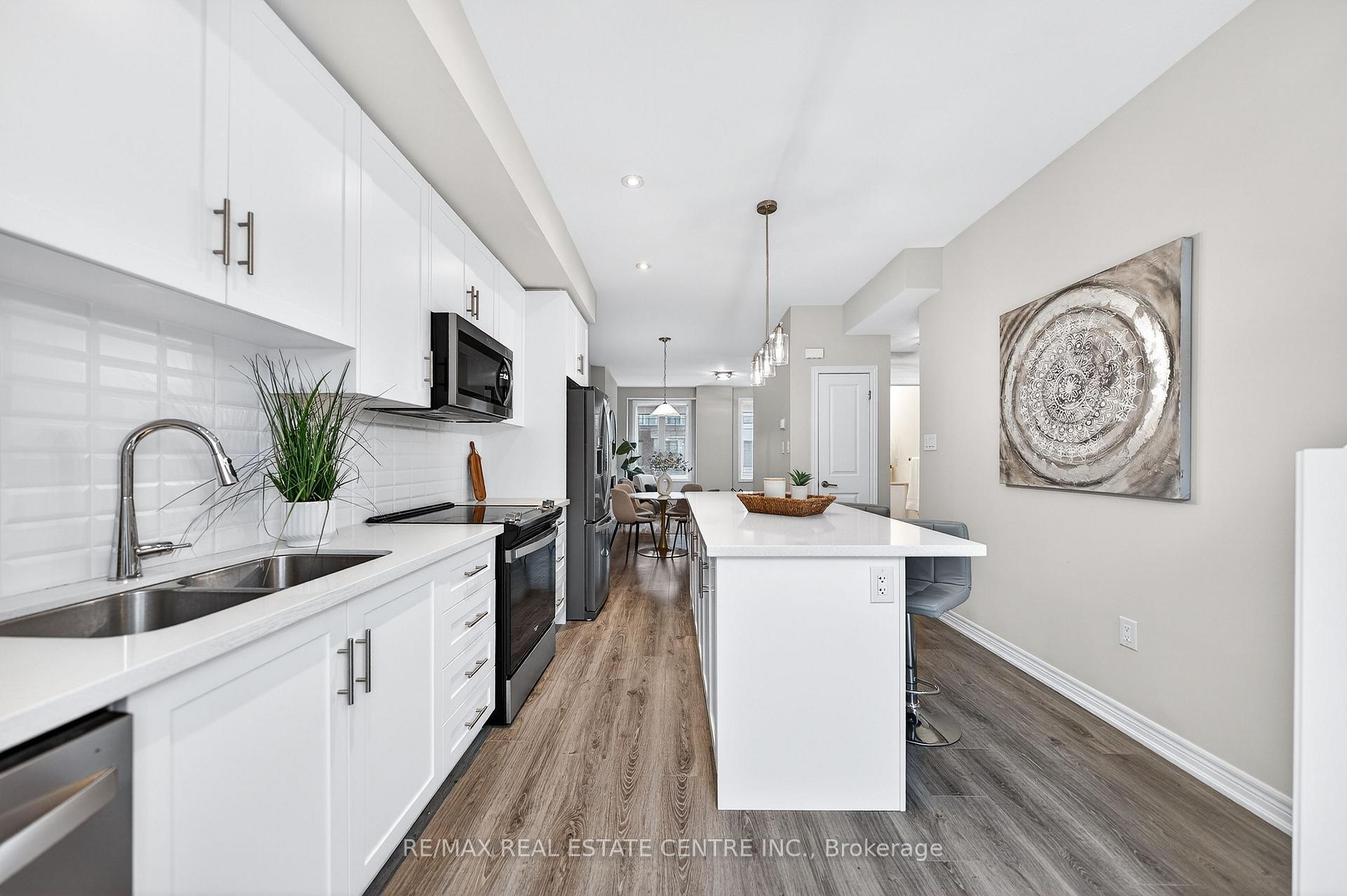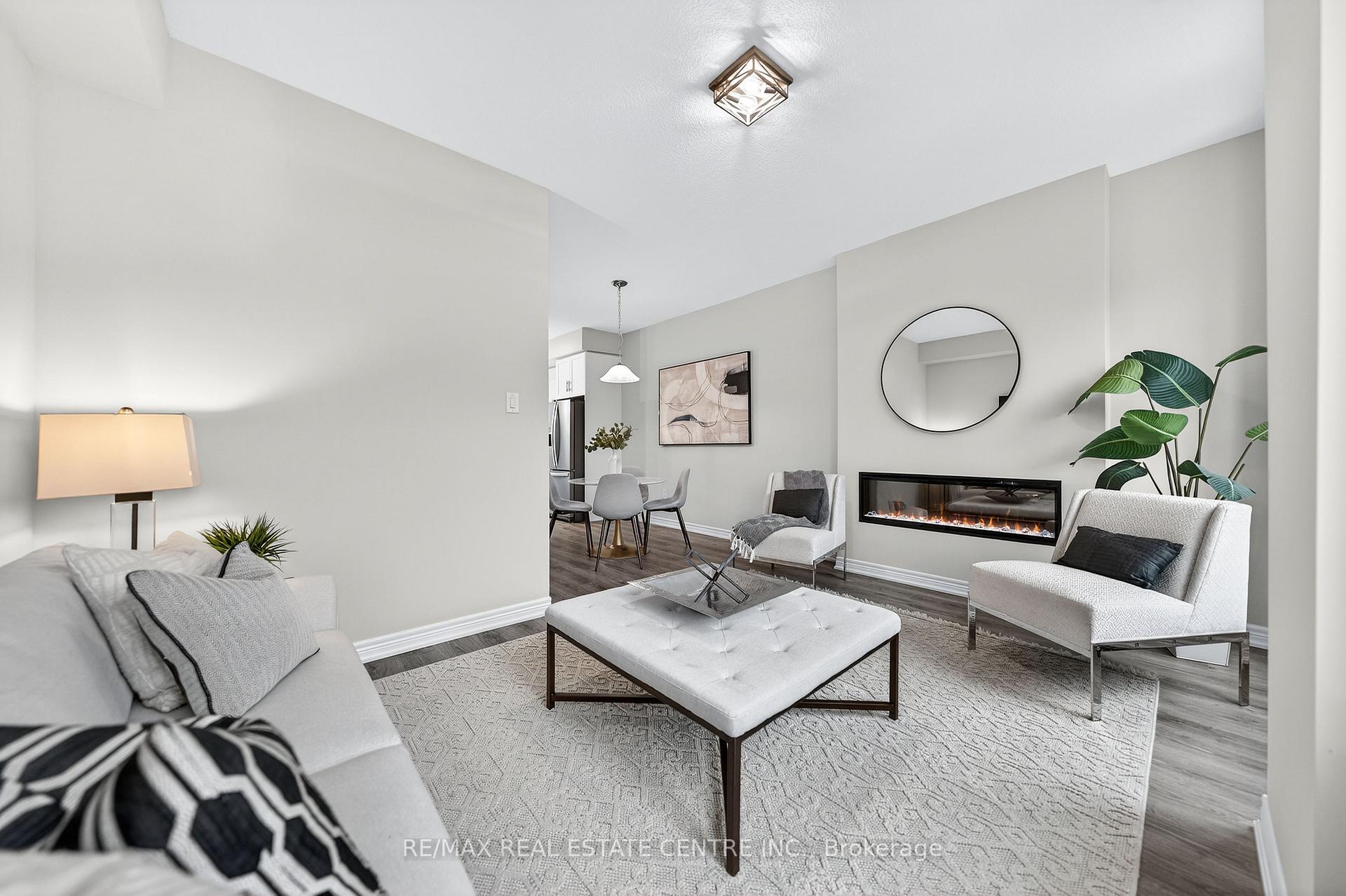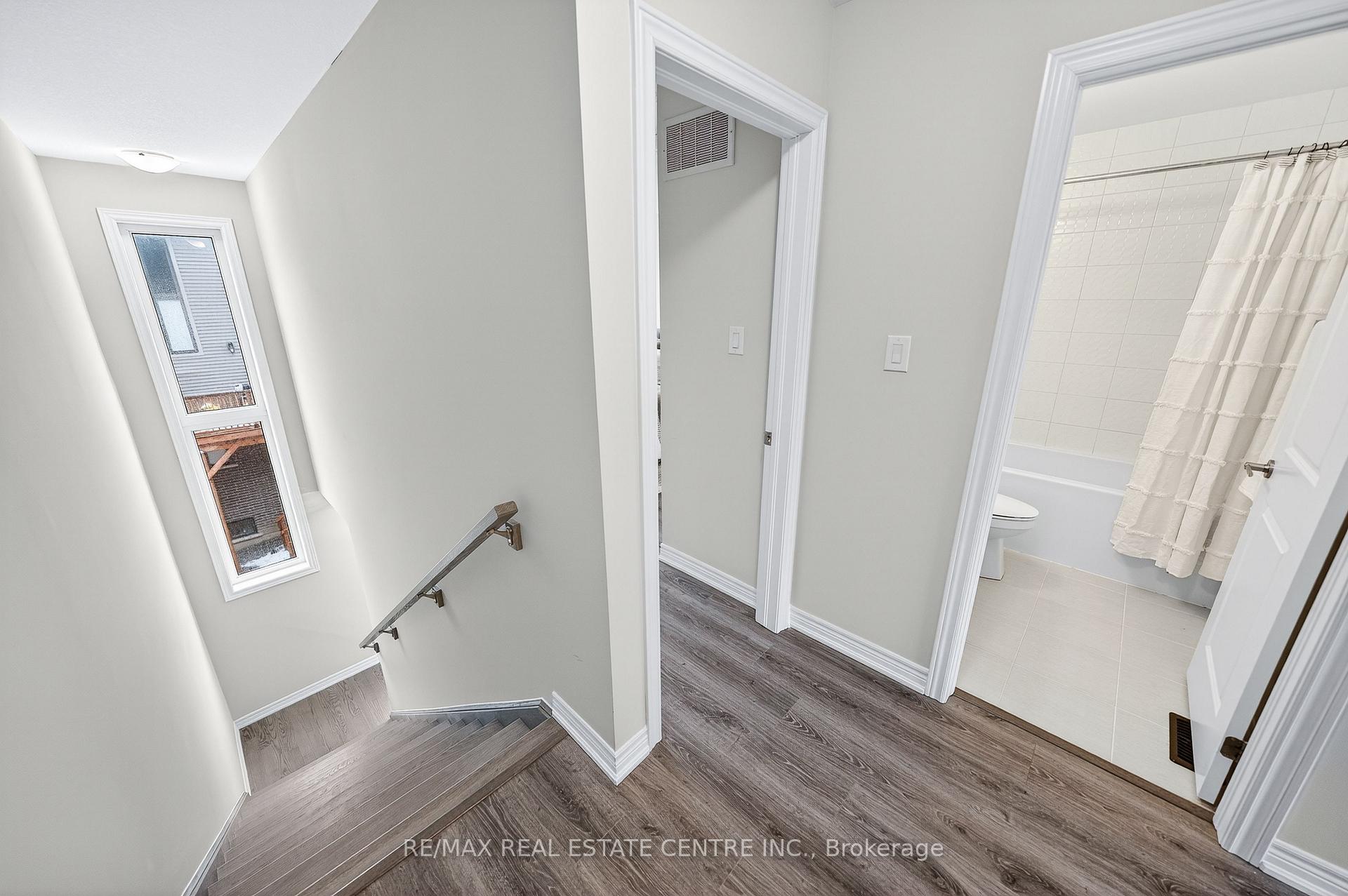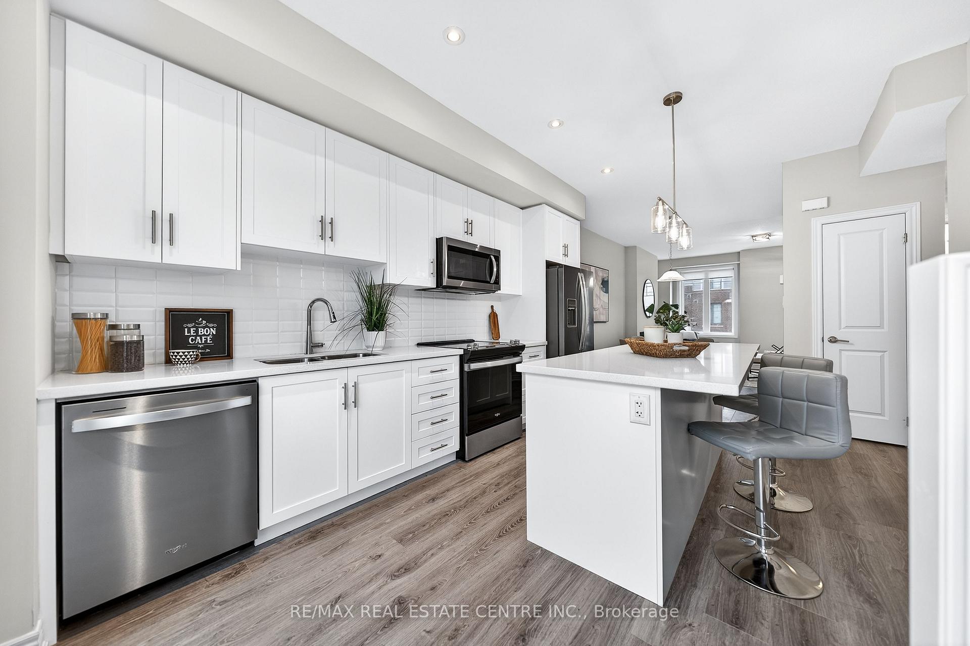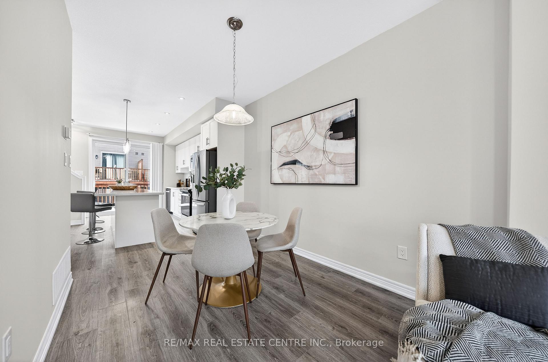 Welcome to this exceptional, freshly painted move-in ready townhome nestled in one of Cambridge’s most desirable communities. Thoughtfully designed for modern living, this bright and beautifully appointed home features 9 ft ceilings, elegant finishes, and a spacious open-concept layout that seamlessly blends style, comfort, and everyday functionality. Over 1900sqft of total living space. Perfect for first-time buyers, growing families, or professionals. The main living level impresses with an abundance of natural light streaming through oversized windows, highlighting a warm and inviting living space anchored by a sleek electric fireplace. The contemporary white kitchen is both stylish and practical, showcasing quartz countertops, a large center island with breakfast seating, stainless steel appliances, subway tile backsplash, and ample cabinetry, all complemented by convenient roll-down blinds. Step outside to the private rear deck with privacy side panels, offering a peaceful retreat for relaxing or entertaining. A hardwood staircase leads to the upper level where three generously sized bedrooms provide comfort and versatility, each featuring large windows and neutral décor. The 4-piece bathroom includes a quartz vanity, soaker tub, and ceramic tile shower surround. Excellent location approximately 35 minutes to Mississauga, 15 minutes to University of Waterloo and Wilfrid Laurier University, and 20 minutes to University of Guelph. Walking distance to Walmart, Home Depot, Tim Hortons, Canadian Tire, Starbucks, and numerous shops, dining, and everyday amenities.