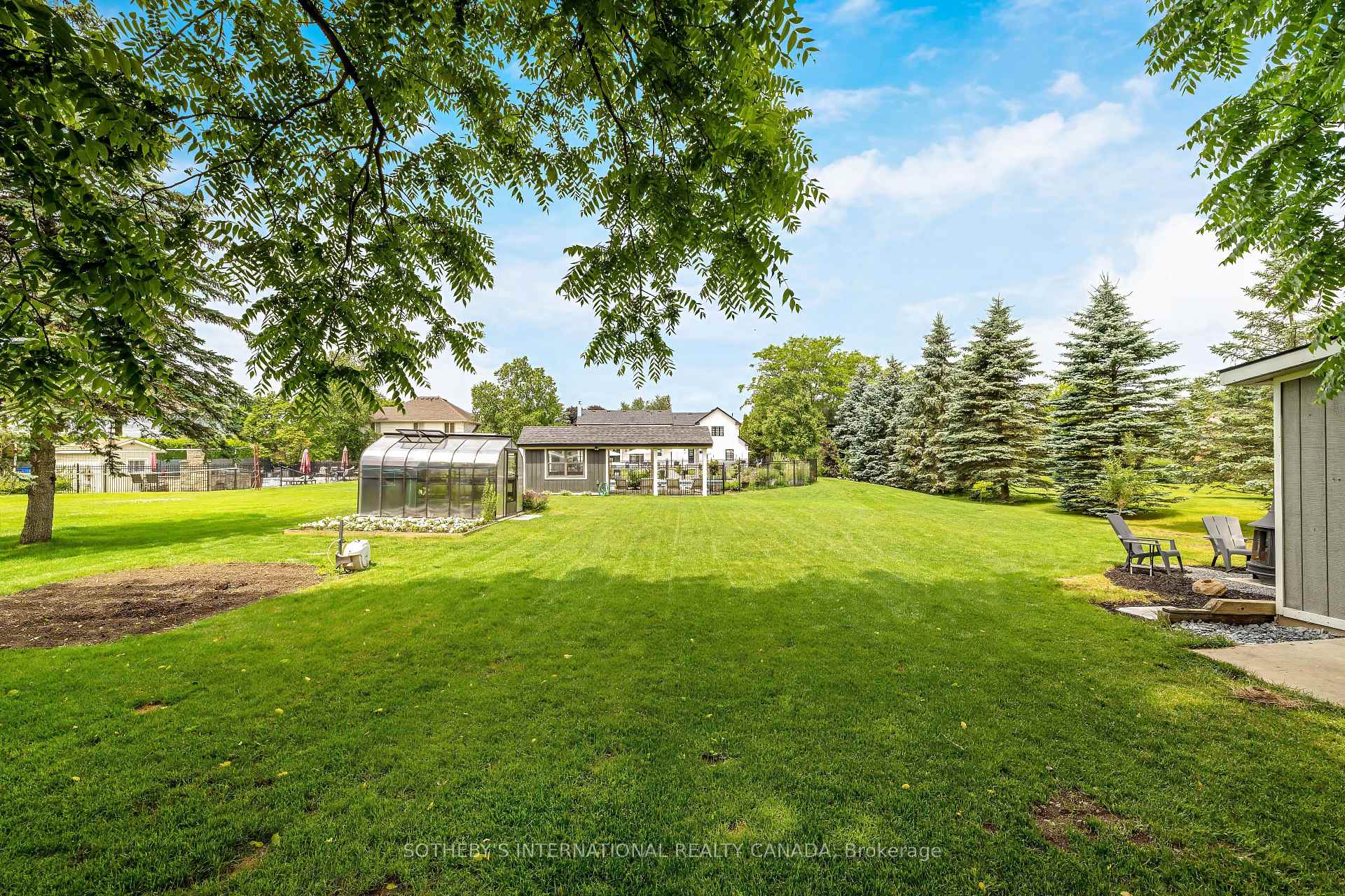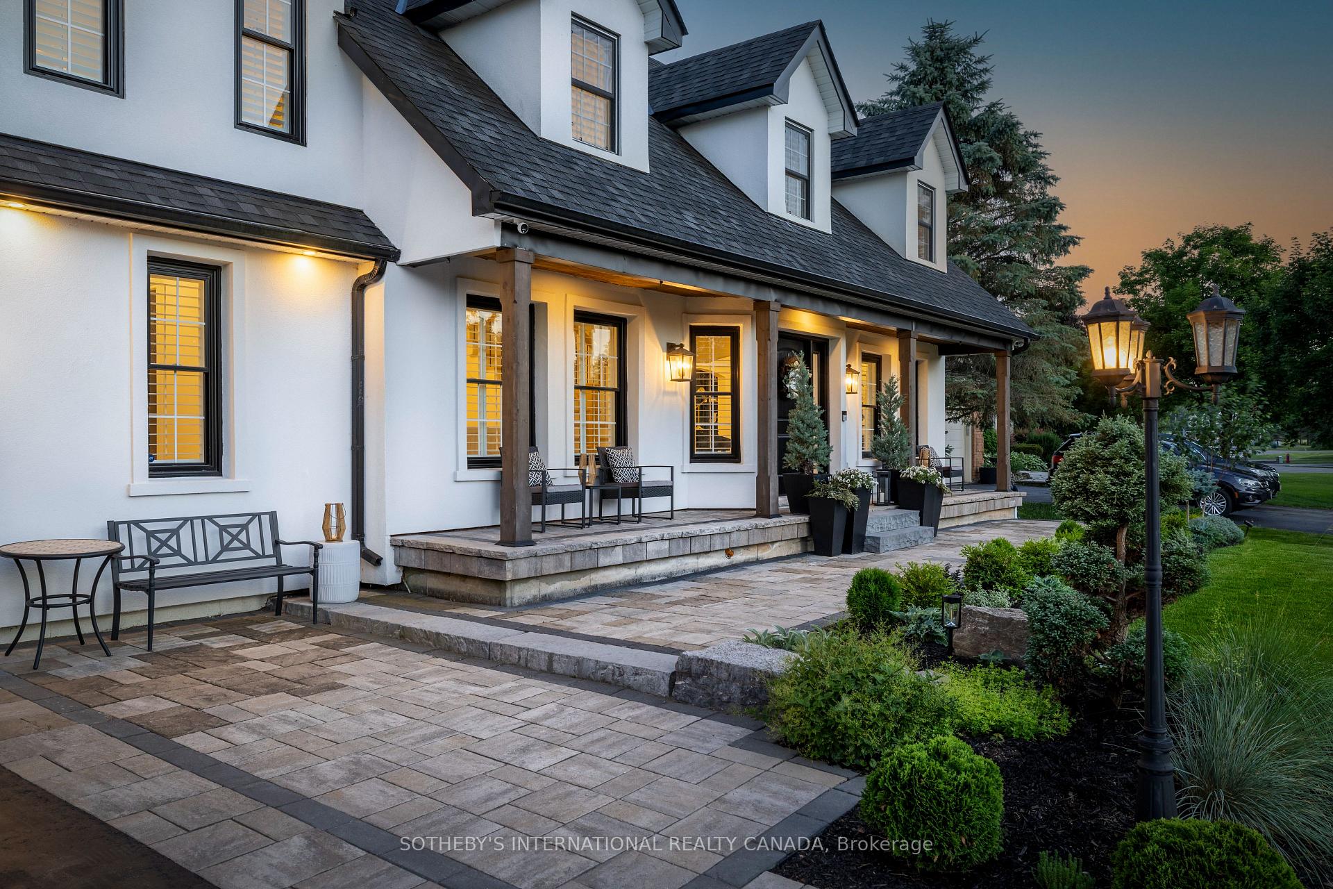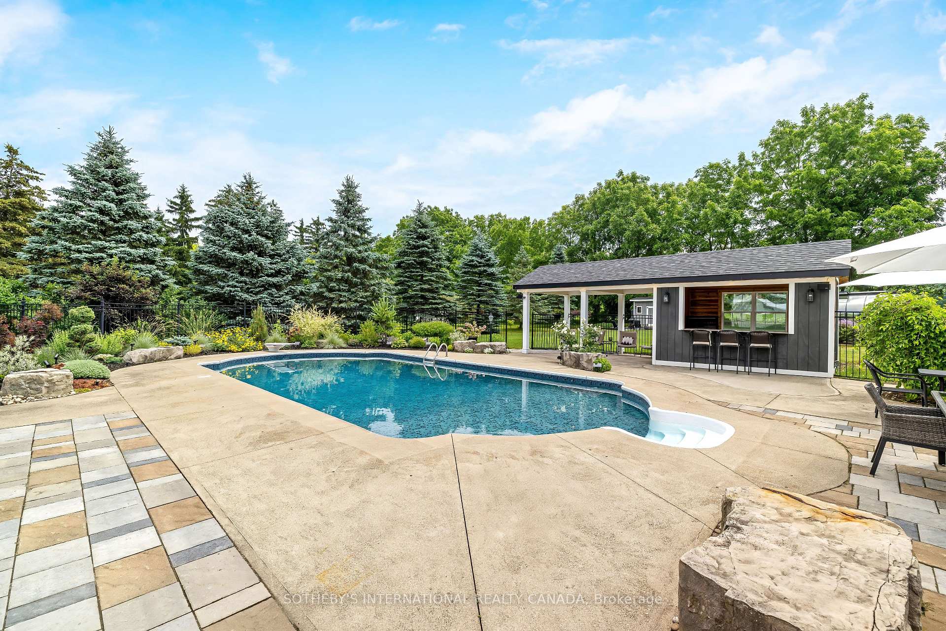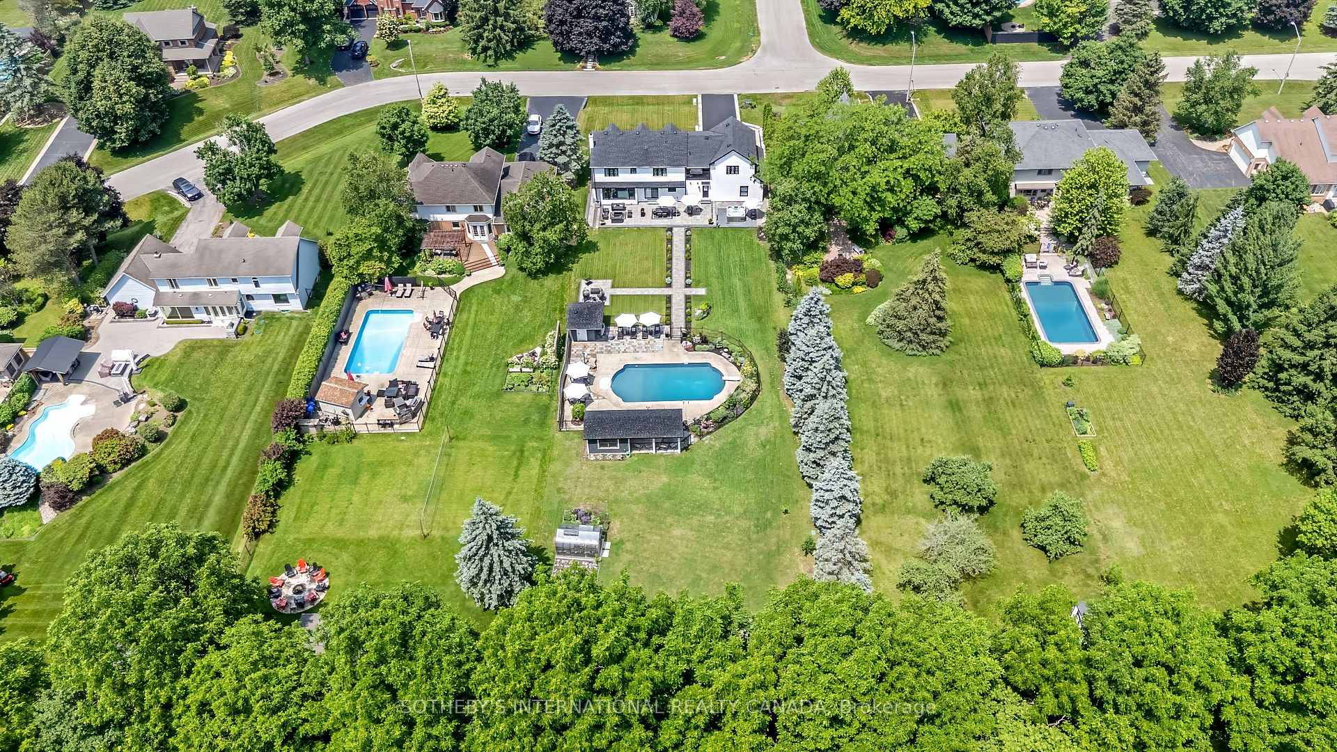 Your dream home awaits. Welcome to 10 Meander Close, a luxurious cape cod style home set in an exclusive enclave of estate homes in the charming community of Carlisle. Featuring over 4000 square feet of impeccably designed, finished living space, 6 total bedrooms, 5 bathrooms, & incredible backyard oasis with in-ground pool, hot tub, cabana, gazebo, fire-fit, & greenhouse. White oak hardwood flooring on the main & second level, with matching wood staircase with wrought iron spindles, sophisticated designated office, romantic formal dining room, & sunken living room with focal brick wood fireplace & custom built shelving. The stunning white kitchen features black accents, gold hardware, granite counter tops, 10 ft centre island, 10 ft long walk-in pantry, & high-end appliances. Large mudroom off the kitchen, ideal for family storage with garage entry. Upstairs, 5 large bedrooms, 4 share 2 resort like bathrooms, & the primary has an expansive 5 piece ensuite. Large dressing room in the primary with built-in shelving with glass doors. Convenient upper level laundry room & hallway balcony overlooking the stunning backyard. This home has been tastefully renovated with gorgeous feature walls, wainscotting, crown moulding, upgraded lighting, built-in cabinetry & so much more. The finished basement features a glass encased theatre room, extra bedroom with access to 4 piece bath, & plenty of storage space. Take the back sliding doors to the backyard retreat with incredible hardscape, gardens, & outdoor lighting. Jump into the hot tub on those cold winter nights, or walk the path to the pool area with plenty of space for lounging, dining, & entertaining. Custom cabana, fire-pit, gazebo, & state of the art greenhouse to keep the whole family entertained throughout the summer. The curb appeal is remarkable, with hundreds of thousands spent on hardscape & lush gardens both in the front & back of the home. Full irrigation system with 15 zones. Shows 10++.