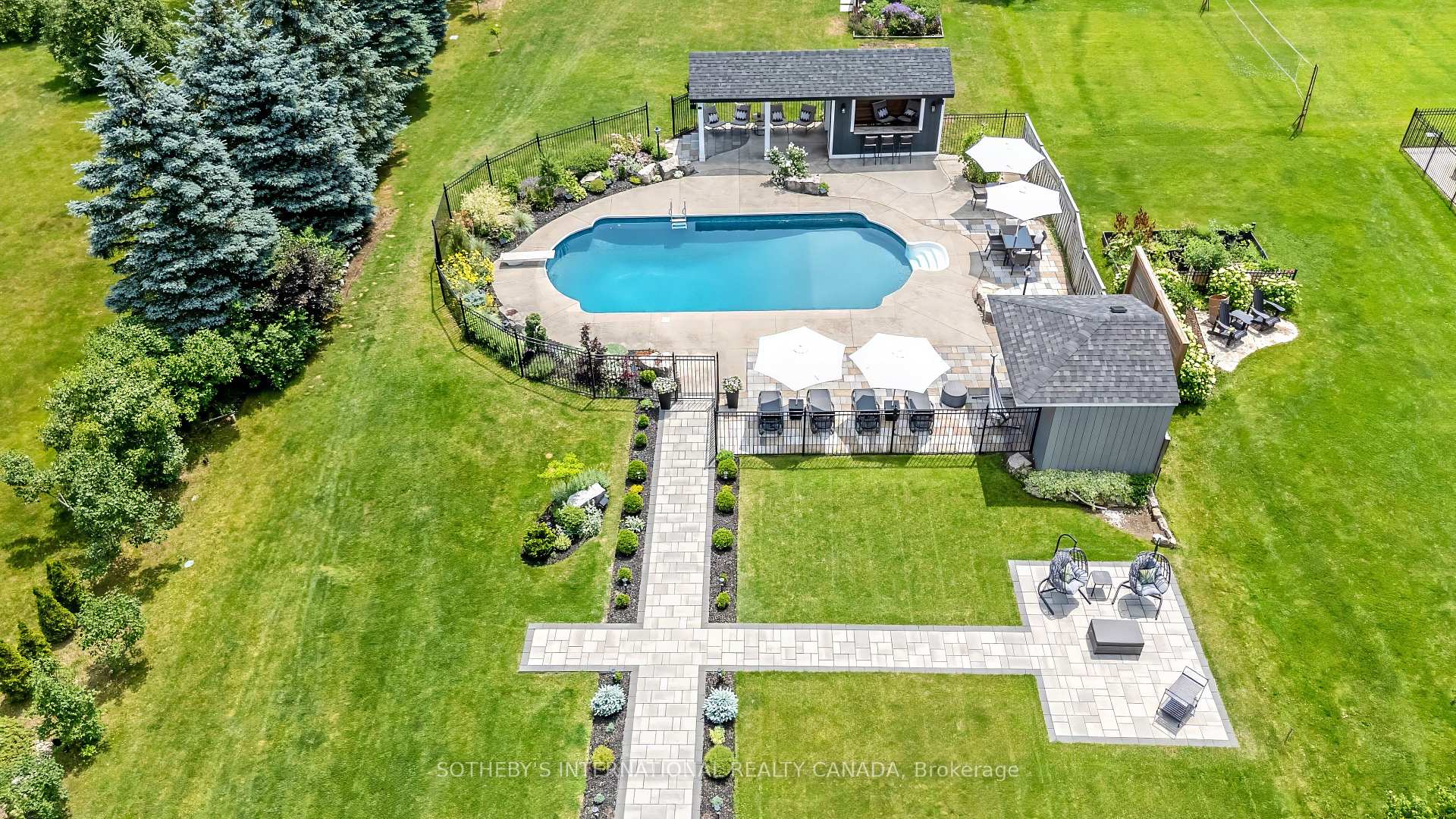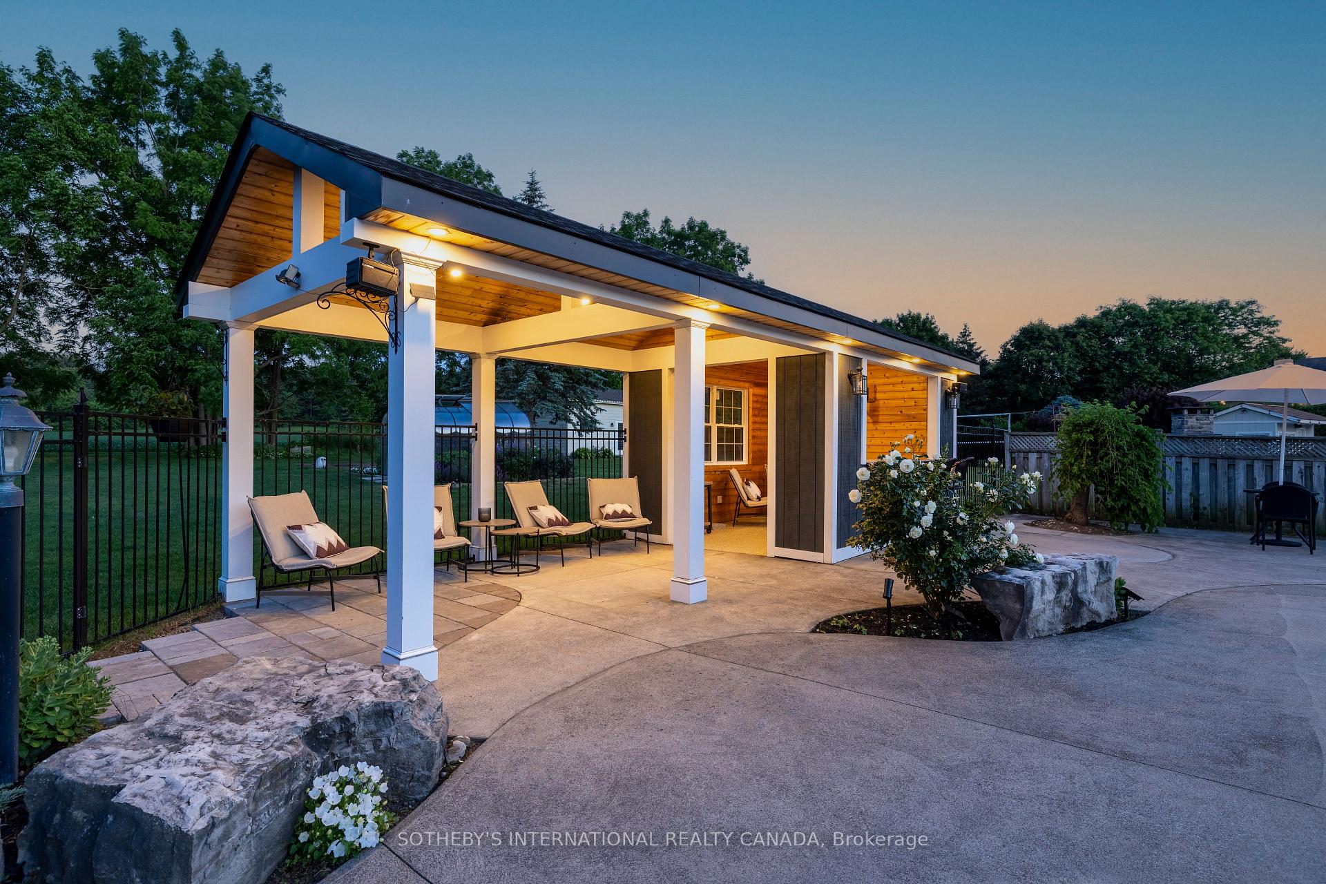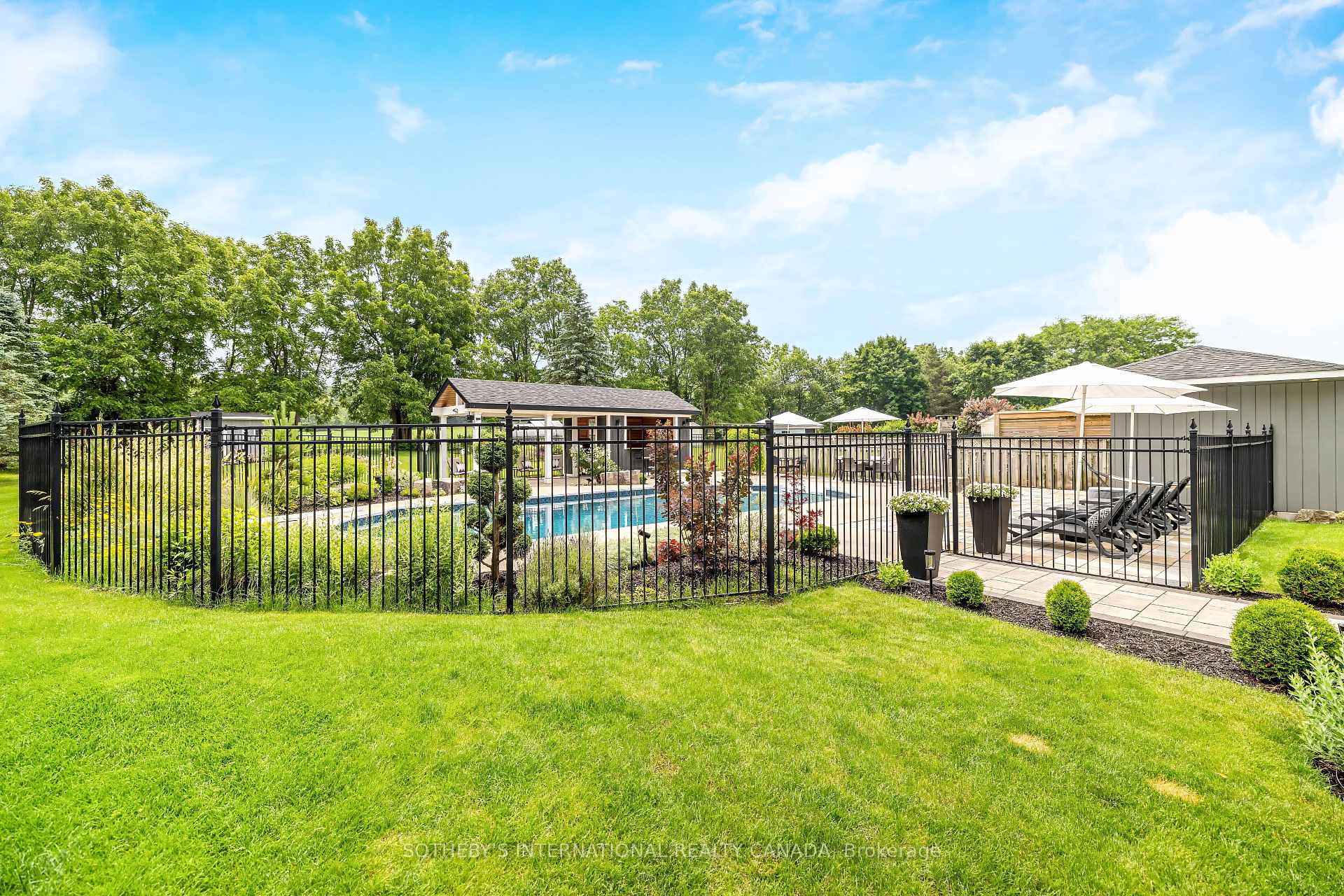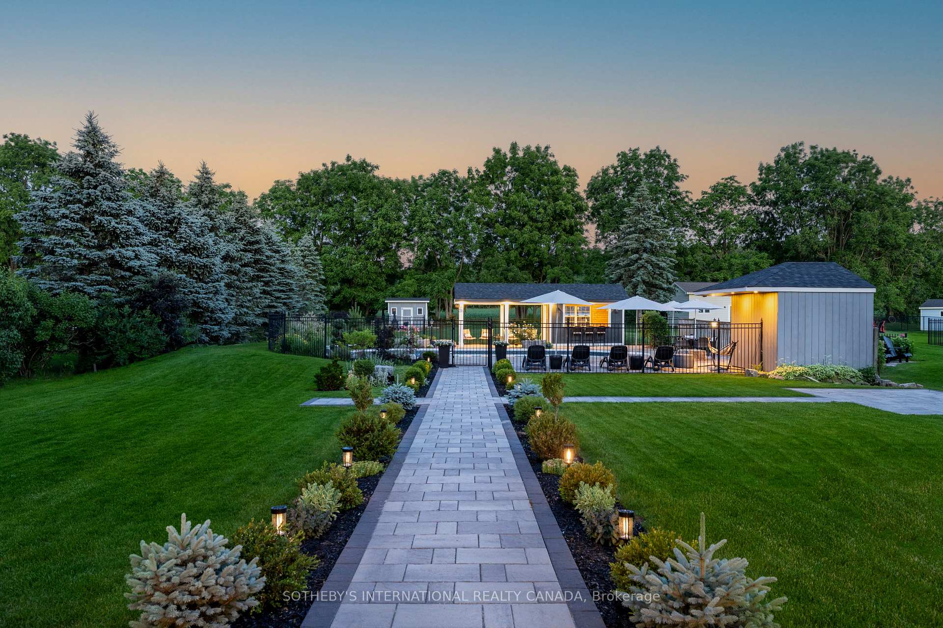 Your dream home awaits. Welcome to 10 Meander Close, a luxurious cape cod style home set in an exclusive enclave of estate homes in the charming community of Carlisle. Featuring over 4000 square feet of impeccably designed, finished living space, 6 total bedrooms, 5 bathrooms, & incredible backyard oasis with in-ground pool, hot tub, cabana, gazebo, fire-fit, & greenhouse. White oak hardwood flooring on the main & second level, with matching wood staircase with wrought iron spindles, sophisticated designated office, romantic formal dining room, & sunken living room with focal brick wood fireplace & custom built shelving. The stunning white kitchen features black accents, gold hardware, granite counter tops, 10 ft centre island, 10 ft long walk-in pantry, & high-end appliances. Large mudroom off the kitchen, ideal for family storage with garage entry. Upstairs, 5 large bedrooms, 4 share 2 resort like bathrooms, & the primary has an expansive 5 piece ensuite. Large dressing room in the primary with built-in shelving with glass doors. Convenient upper level laundry room & hallway balcony overlooking the stunning backyard. This home has been tastefully renovated with gorgeous feature walls, wainscotting, crown moulding, upgraded lighting, built-in cabinetry & so much more. The finished basement features a glass encased theatre room, extra bedroom with access to 4 piece bath, & plenty of storage space. Take the back sliding doors to the backyard retreat with incredible hardscape, gardens, & outdoor lighting. Jump into the hot tub on those cold winter nights, or walk the path to the pool area with plenty of space for lounging, dining, & entertaining. Custom cabana, fire-pit, gazebo, & state of the art greenhouse to keep the whole family entertained throughout the summer. The curb appeal is remarkable, with hundreds of thousands spent on hardscape & lush gardens both in the front & back of the home. Full irrigation system with 15 zones. Shows 10++.