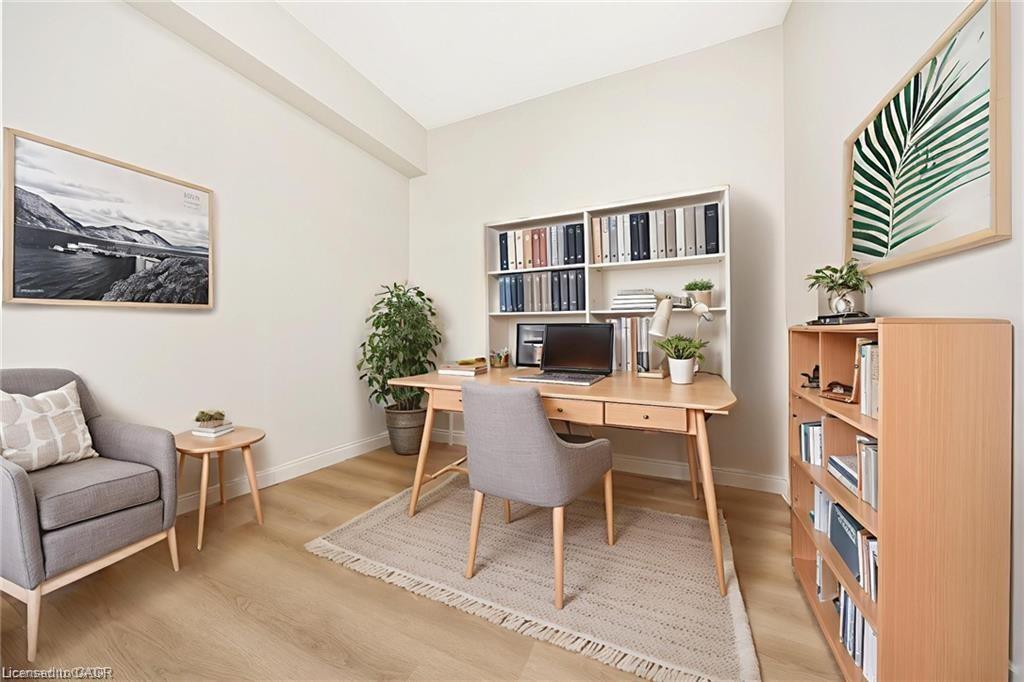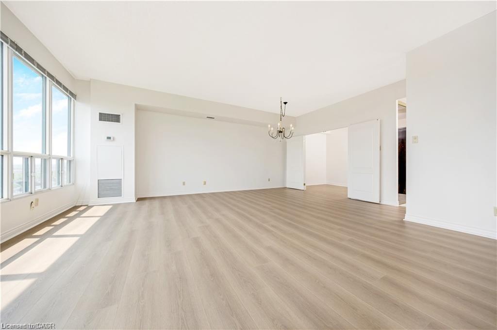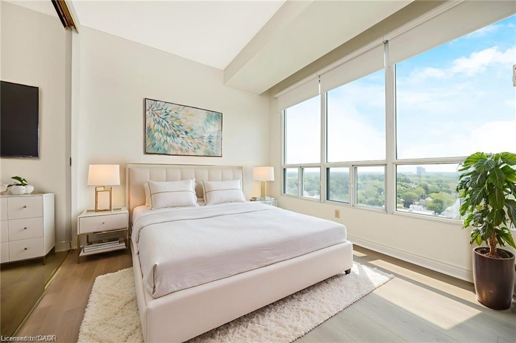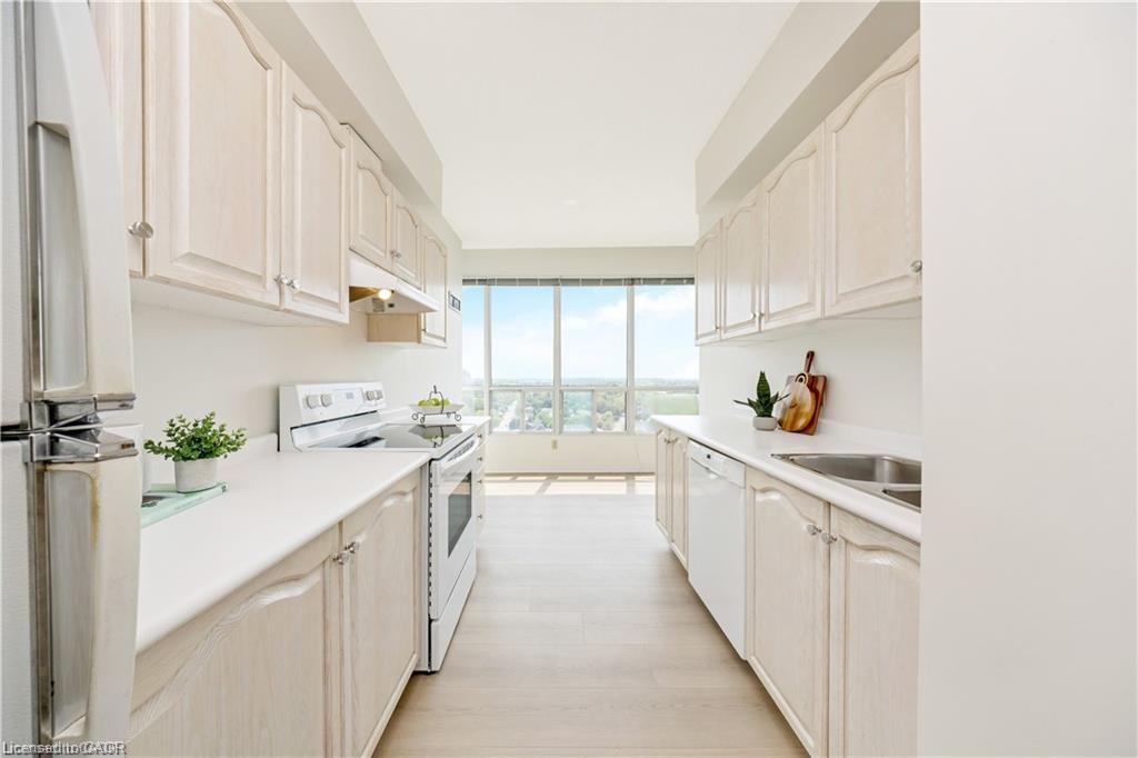 RARE “SKY SUITE” SOUTH FACING CONDO … it’s HIGHER than the PENTHOUSE! Breathtaking unobstructed Escarpment views – see the CN Tower on a clear day! We never see these units offered for sale. This highly sought-after condo has it all: 2 BEDROOMS + DEN, THREE BATHROOMS (Jack n Jill updated to large walk-in shower), HIGH 9′ CEILINGS, 2 UNDERGROUND PARKING SPOTS (1 owned, 1 exclusive use), 2 OWNED LOCKERS, UTILITY ROOM in suite and it boasts a whopping 1625 SF … one of the LARGEST condos in the building. Enjoy the spacious and bright living area w/ massive windows all around to highlight the most spectacular views. The kitchen offers a breakfast area, some updated Samsung and Bosch appliances and a convenient pantry. The combined open concept living and dining room is large enough for extended family celebrations and has loads of massive windows to highlight the stunning views. There are 2 generous bedrooms, one of which is the primary bedroom with walk-in closet and convenient 5-pc ensuite. The den is large enough to be used as a THIRD BEDROOM. Additional features include: $30,000+ in recent upgrades (2025): entire unit has been professionally painted throughout in a neutral tone (Benjamin Moore paint), upgraded lighting, new blinds in bedrooms and new flooring with higher-end sound insulation than required. The unit is also CARPET-FREE, there is in-suite laundry with in-suite walk-in utility room. The building includes a renovated lobby, indoor pool, sauna, fitness area, party room, car wash, community BBQ area and plenty of visitor parking. This is an exceptionally well-run complex in an excellent school district and is centrally located. It is a short walk to restaurants, shops, summer Farmers Market, schools, parks, beautiful Mill Pond and Milton’s vibrant downtown. Condo Fees Include Heat, Hydro, Water, Bell Bulk TV & Internet, Parking, Building Insurance and Maintenance of Common Areas. MOVE IN and ENJOY … Simplify Your Life! *Some photos virtually staged