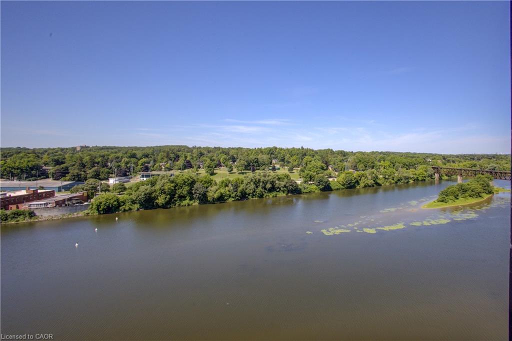 Condo living with the “BEST VIEW”! At its finest this pristine corner unit in the heart of historic Downtown Galt, offering uninterrupted views of the scenic Grand River. Rarely offered, this suite includes another 140 sq.ft. of private outdoor DOUBLE LENGTH balcony space—ideal for enjoying both sunrises and sunsets over the water and downtown skyline. The open-concept layout allows natural light to flood the space through dramatic floor-to-ceiling windows. This 2-bedroom, 2-bathroom, plus den is completely carpet-free, complete with granite countertops.Enjoy the convenience of in-suite laundry, stainless steel appliances and the bonus of a Den/Office area. This Condo has been recently painted(July 2025) allowing for an easy move in, and shows immaculately. Several photos have been virtually staged to help provide a better visual. Included is one underground parking spot, a private storage locker, and plenty of visitor parking. Residents have access to an array of amenities, including a fully equipped fitness centre, a stylish social lounge, guest suite, and an expansive outdoor terrace complete with gas BBQs right alongside the Grand River. Built in 2015, The GrandCondominiums place you steps away from everything—boutique shops, gourmet coffee, local restaurants, art galleries, live theatre, weekend markets, and the scenicTrans Canada Trail. Commuters will love the quick access to the 401, Hwy 8, and Hwy 7/8, as well as excellent transit options.