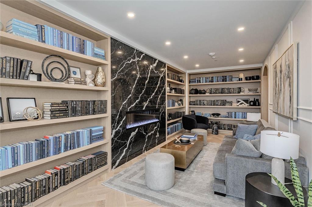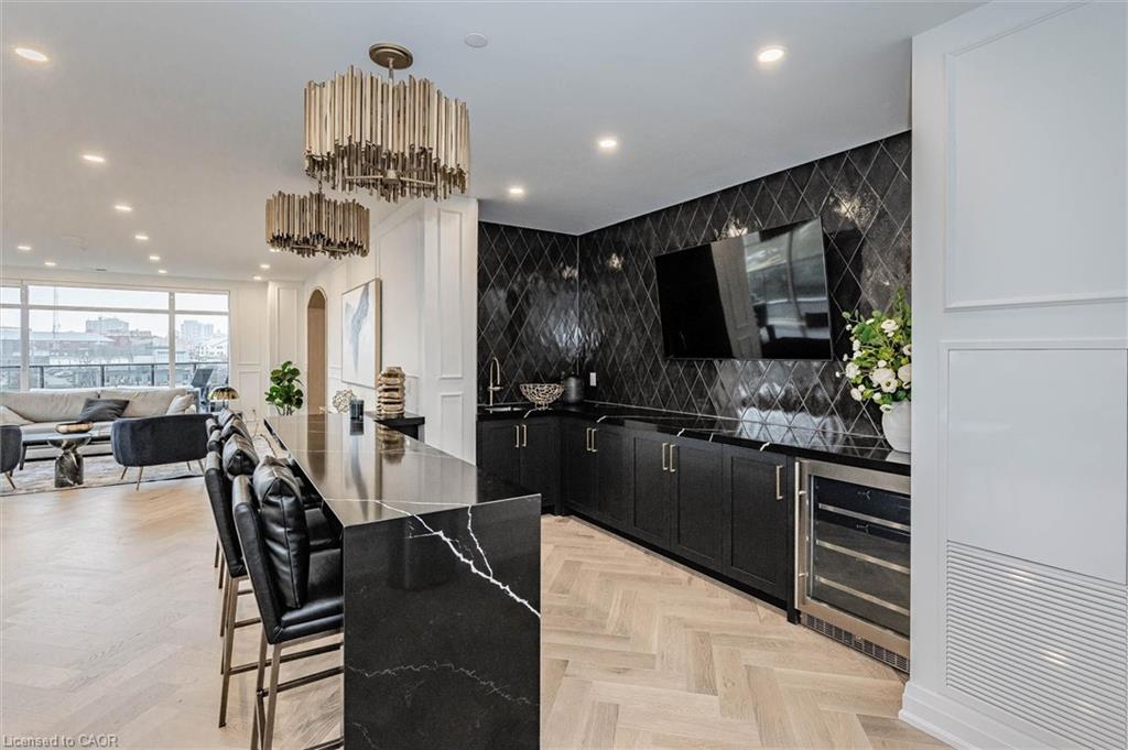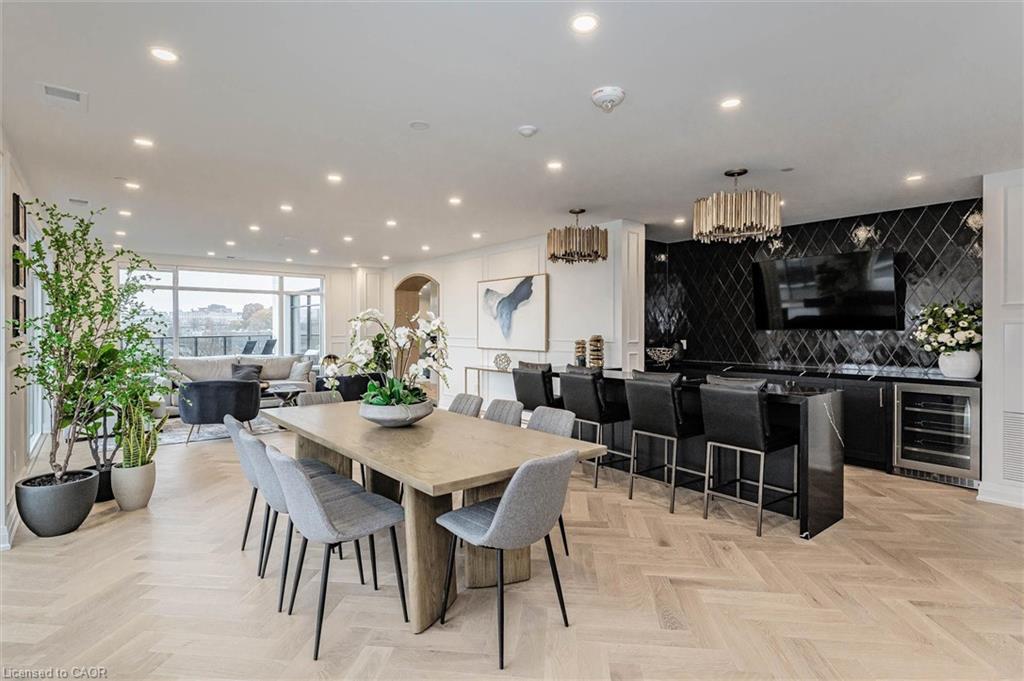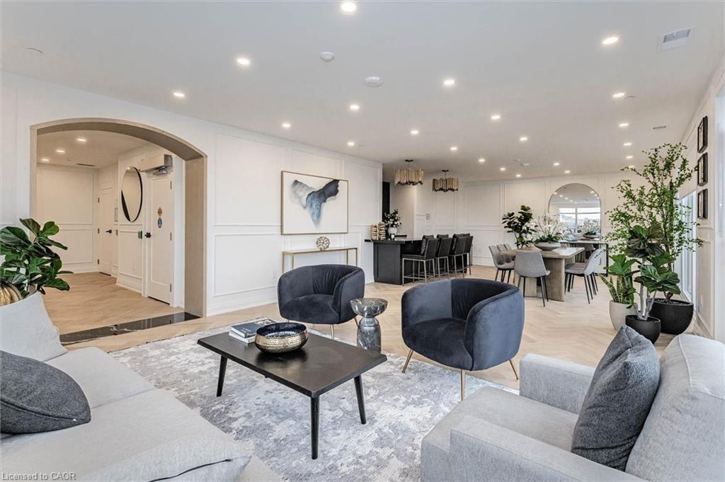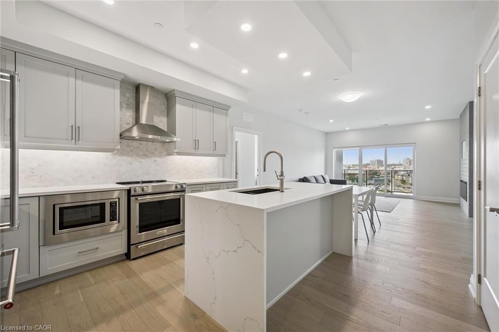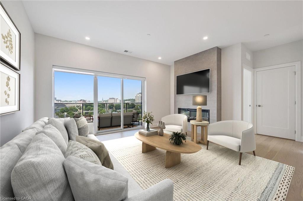 This stunning and spacious 1,295 sq.ft. interior + 80 sq. ft. private balcony, 2-bedroom, 2-bathroom condo- facing the Speed River and steps to downtown Guelph- offers an exceptional combination of luxury and convenience. The bright, open-concept layout is thoughtfully designed for accessibility and showcases luxury finishes including white oak hardwood flooring throughout, 9-foot ceilings, a remote controlled fireplace in the living room, and a designer kitchen flaunting a waterfall quartz island, quartz countertops, full-height backsplash, LED under-cabinet lighting, soft-close drawers, high-end stainless-steel appliances, and a spacious pantry. An abundance of natural light pours through the large windows- complete with roll-up shades for privacy- while the private balcony offers stunning, unobstructed views of the river. The primary suite boasts a generous walk-in closet and a spa-inspired 5-piece ensuite, complete with a freestanding soaker tub and an oversized glass shower. A second bedroom is thoughtfully positioned on the opposite side of the unit, and is conveniently located near a stylish 3-piece bathroom and the in-suite laundry. This condo also includes a secured underground parking space for your comfort and peace of mind. The well-maintained building offers incredible amenities including a gym, guest suite, golf simulator, billiards, a lounge with a library, a second lounge bar with terrace, an outdoor dining terrace and BBQ area, indoor visitor parking, secured bike rooms on all parking levels, and a welcoming community where neighbours truly look out for one another. Just steps away from restaurants, cafés, shops, Market Fresh, the Farmer’s Market, the VIA Rail/ GO train and bus stations, and within easy access to riverside trails. This condo delivers the ultimate lifestyle in one of Guelph’s most desirable locations.
