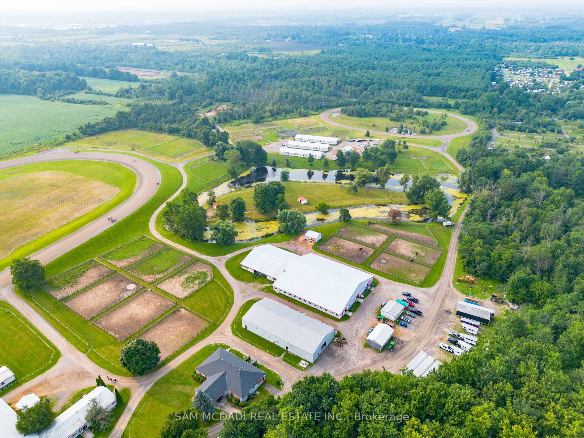 Welcome to a rare 98-acre estate that seamlessly blends luxury living, natural beauty, and income-generating infrastructure, supported by two separate deeds. Whether you’re envisioning a family compound, business expansion, or long-term investment, this versatile property delivers the scale, zoning, and revenue potential to bring your goals to life. At the heart of the estate is a newly renovated, custom-built two-storey residence with loft, offering over 5,500 sq ft of refined living space. Designed for both elegance and practicality, it features 6-spacious bedrooms and 7-bathrooms, perfect for multi-generational living or large-scale entertaining. The fully finished walkout basement includes a private entrance, full bath, and kitchenette ideal for guests, in-laws, or a rental suite. Surrounding the home are rolling meadows, mature forests, trails, and a peaceful pond offering unmatched privacy and a strong connection to nature. What truly sets this estate apart is over 45,000 sq ft of indoor infrastructure: nine barns, 175 stalls, 31 paddocks, and two professionally built Standardbred training tracks. This operational facility supports a dedicated client base and offers immediate revenue with room to grow, perfect for entrepreneurs or investors. The inclusion of dual deeds offer rare flexibility for future subdivision, development, or generational planing. Zoned P8, P7, and A2, the property supports a wide range of uses, including equestrian operations, agriculture, storage, events, and retreats. A unique opportunity to own a property that delivers on lifestyle, business, and investment all under two titles. A once-in-a-generation estate that must be seen to be truly appreciated.