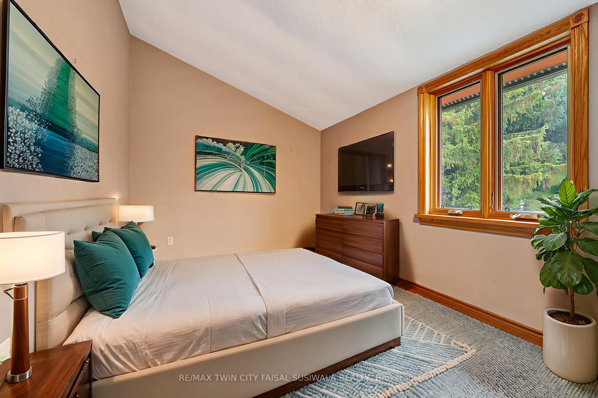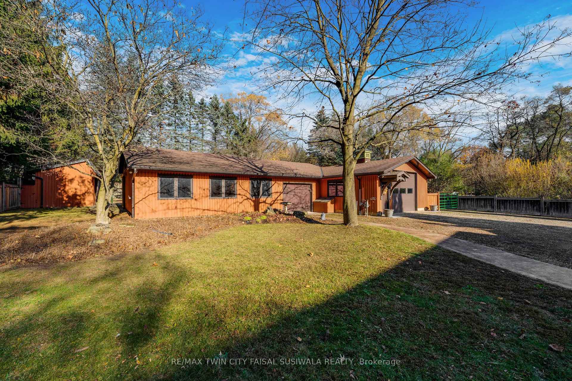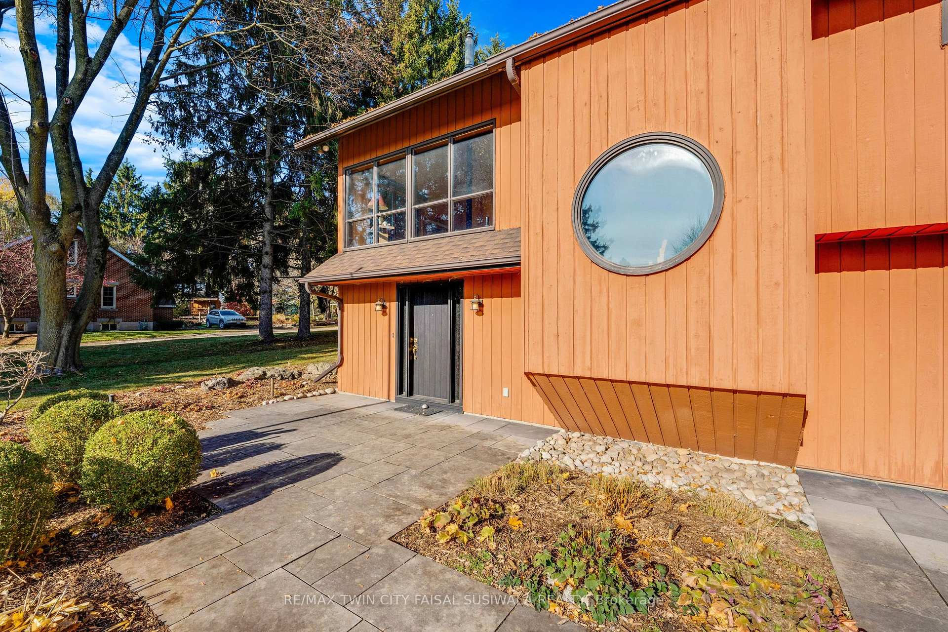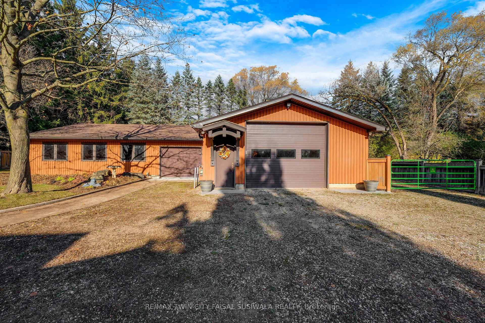 A PRIVATE ARCHITECTURAL RETREAT ON .75 ACRES – 106 ROYAL OAK ROAD, CAMBRIDGE, Tucked quietly among towering evergreens and glowing autumn maples, this architecturally distinct home feels like its own world-warm, welcoming, and wonderfully unexpected. Set on three-quarters of an acre, this 3-bedroom, 2-bath property blends mid-century lines with cottage-country serenity, offering over 2,600 sq. ft. of finished living space across all levels, plus a dream detached workshop approx 2200sqft for hobbyists, collectors, or creatives. Step inside the unique lower-level entry, where large windows and a walkout flood the family room with light and views of the surrounding landscape. Upstairs, the main living area feels like a treehouse-wrapped in windows, warmed by natural wood, and anchored by a beautiful brick hearth. A cozy gas fireplace, bold retro palette, and open flow create an inviting space for gatherings, movie nights, or quiet mornings with coffee and the sound of the trees. The elevated dining and kitchen space overlooks the yard and opens to a covered back porch, the perfect spot for long summer dinners, rainy-day reading, or evening chats under the string lights. The expansive primary bedroom offers a peaceful escape with skylights, surrounding windows, a built-in bookcase and natural views in every direction. Two additional bedrooms and two full bathrooms-including an accessible bath with a roll-in shower. Outside, the property stretches wide with stone walkways, mature trees, and endless room to breathe. At the end of the long private driveway sits a detached heated triple garage/workshop with a wood stove and furnace, ideal for parking, projects, storage, or the ultimate hobby sanctuary. There is a bonus 10×24 storage garage with 2 large roller doors. A property like this is hard to categorize-it’s part retreat, part architectural gem, part everyday family home. And that’s exactly what makes it so special. Virtually Staged.