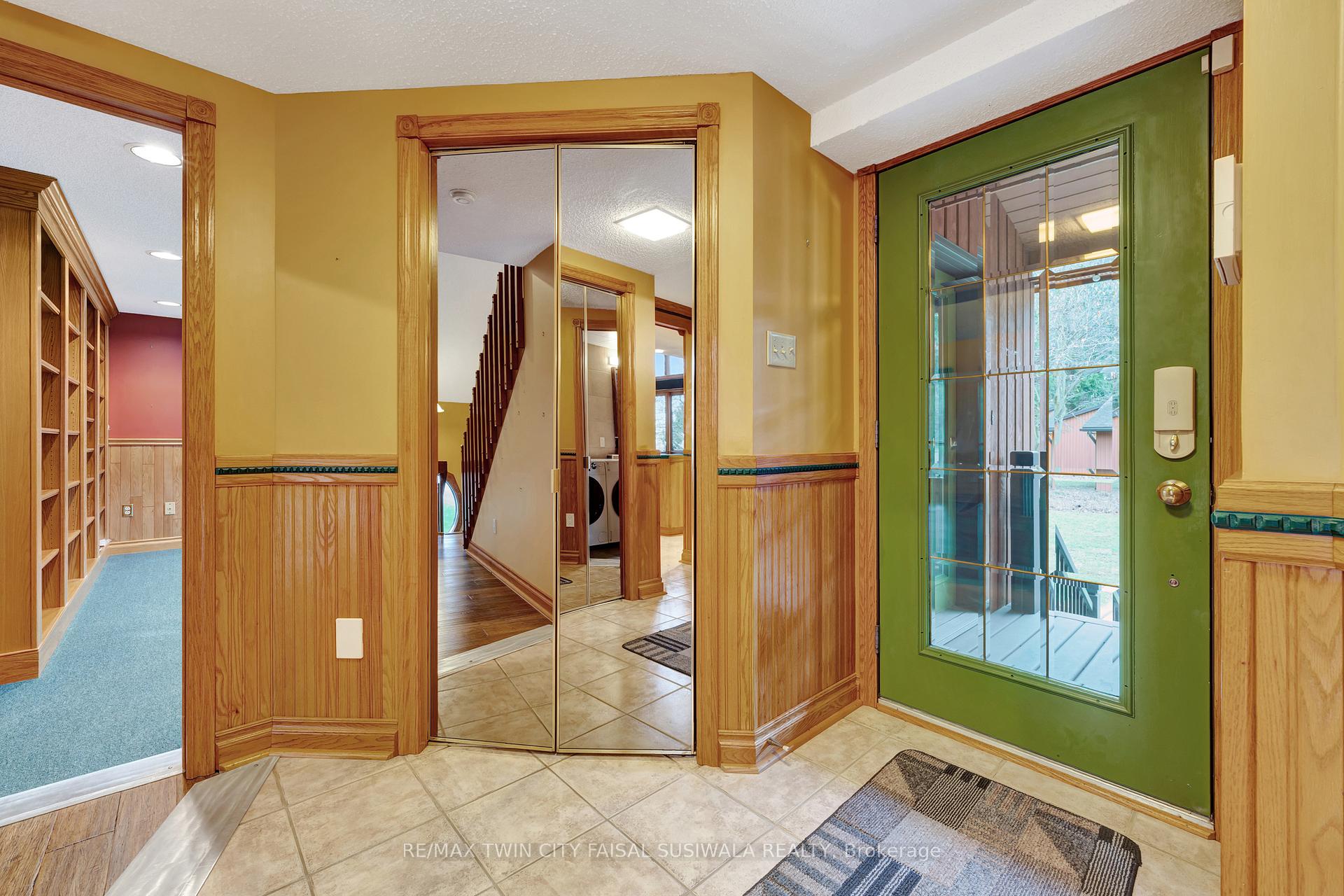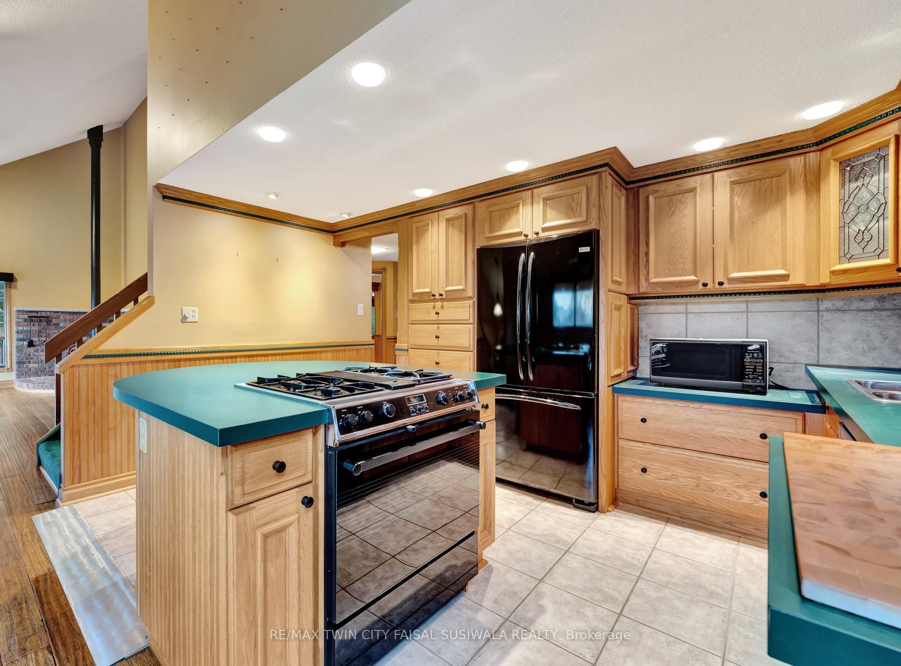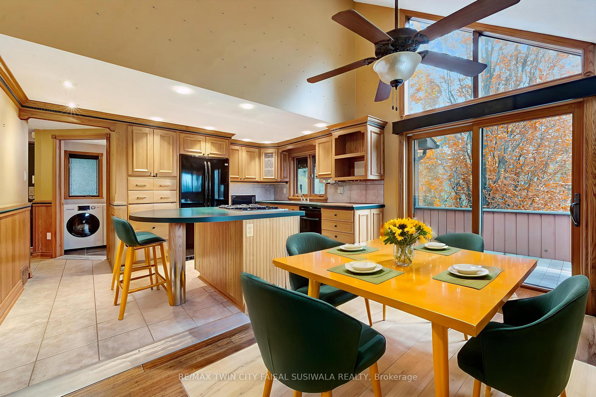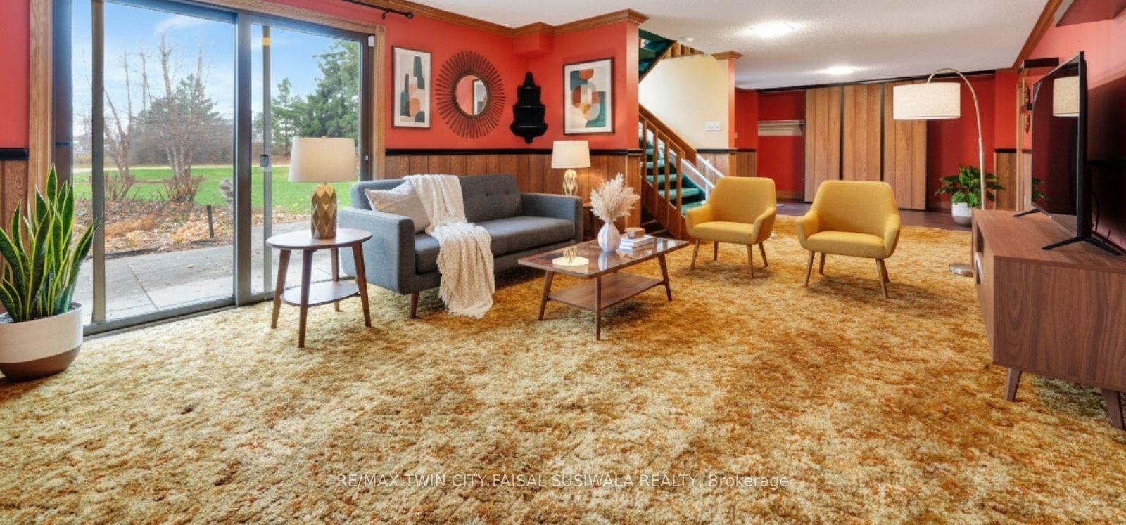 A PRIVATE ARCHITECTURAL RETREAT ON .75 ACRES – 106 ROYAL OAK ROAD, CAMBRIDGE, Tucked quietly among towering evergreens and glowing autumn maples, this architecturally distinct home feels like its own world-warm, welcoming, and wonderfully unexpected. Set on three-quarters of an acre, this 3-bedroom, 2-bath property blends mid-century lines with cottage-country serenity, offering over 2,600 sq. ft. of finished living space across all levels, plus a dream detached workshop approx 2200sqft for hobbyists, collectors, or creatives. Step inside the unique lower-level entry, where large windows and a walkout flood the family room with light and views of the surrounding landscape. Upstairs, the main living area feels like a treehouse-wrapped in windows, warmed by natural wood, and anchored by a beautiful brick hearth. A cozy gas fireplace, bold retro palette, and open flow create an inviting space for gatherings, movie nights, or quiet mornings with coffee and the sound of the trees. The elevated dining and kitchen space overlooks the yard and opens to a covered back porch, the perfect spot for long summer dinners, rainy-day reading, or evening chats under the string lights. The expansive primary bedroom offers a peaceful escape with skylights, surrounding windows, a built-in bookcase and natural views in every direction. Two additional bedrooms and two full bathrooms-including an accessible bath with a roll-in shower. Outside, the property stretches wide with stone walkways, mature trees, and endless room to breathe. At the end of the long private driveway sits a detached heated triple garage/workshop with a wood stove and furnace, ideal for parking, projects, storage, or the ultimate hobby sanctuary. There is a bonus 10×24 storage garage with 2 large roller doors. A property like this is hard to categorize-it’s part retreat, part architectural gem, part everyday family home. And that’s exactly what makes it so special. Virtually Staged.