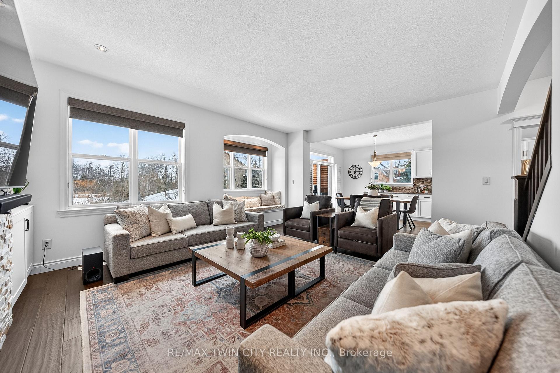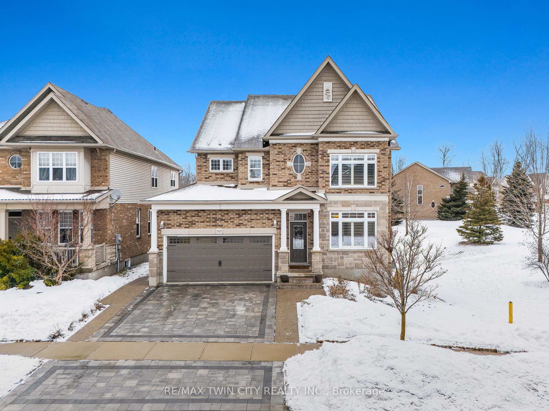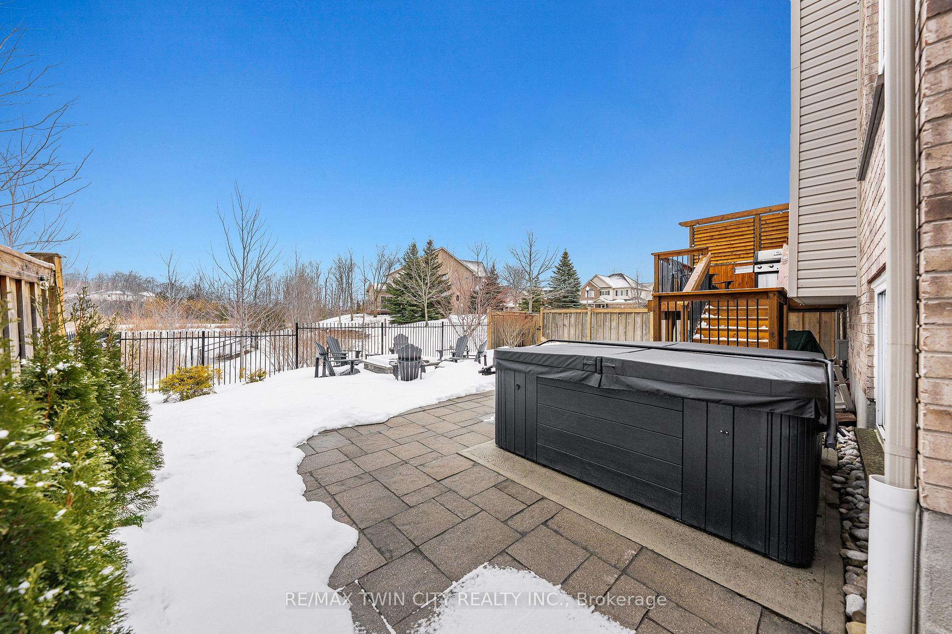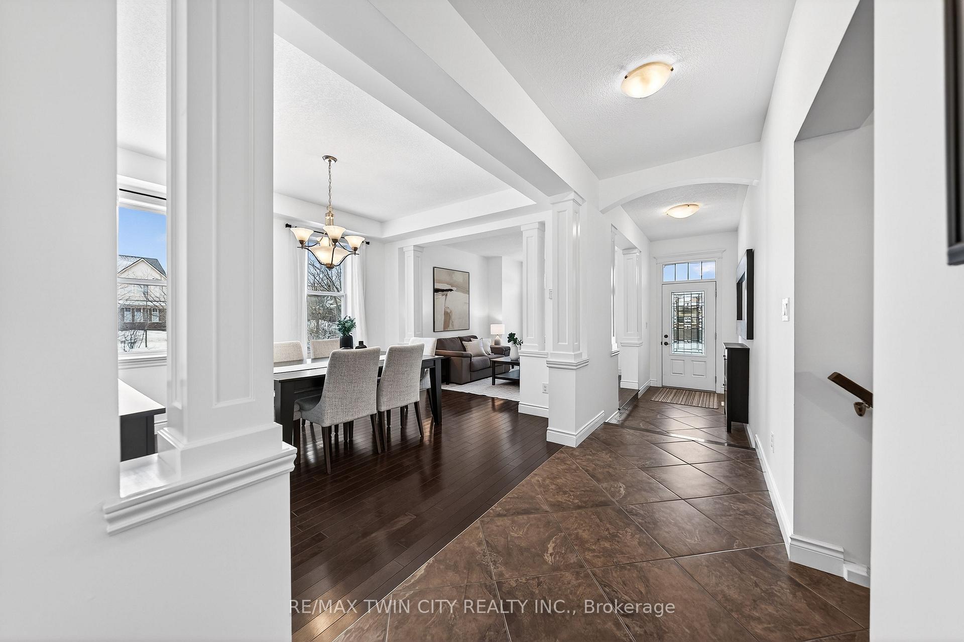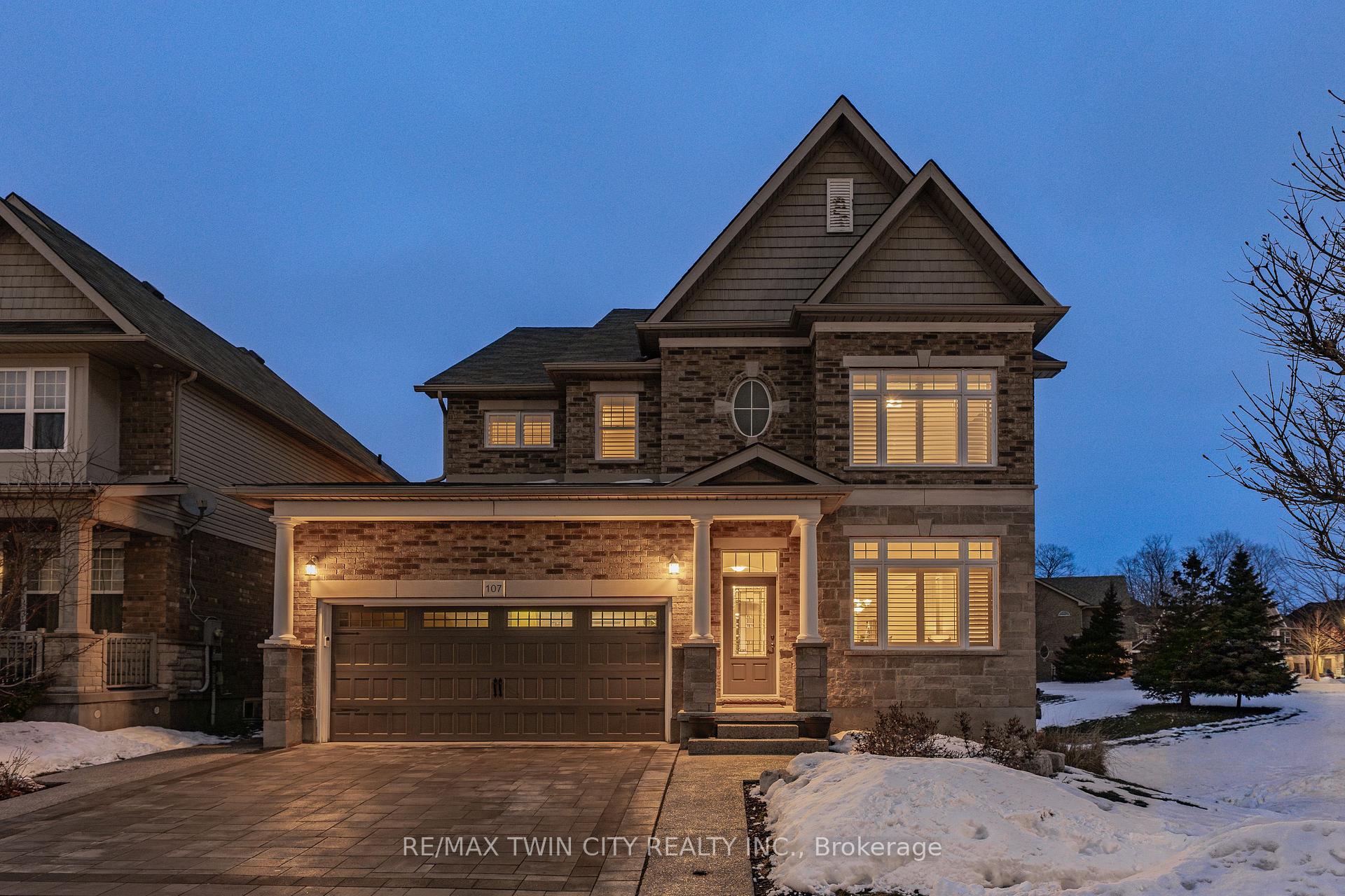Welcome to 107 Janine Street, perfectly positioned in the heart of Edgewater Estates-one of Kitchener’s most sought-after neighbourhoods. Backing onto a tranquil pond & protected greenbelt, with no rear neighbour & parkland along the right side, this beautifully updated custom-built executive home offers a rare blend of privacy, quiet luxury, & an exceptional natural setting. Offering 2,859 SF with 5-bedrms, & 3-bathrms, this exceptional home is thoughtfully designed for family living & entertaining. The bright main level features formal living & dining spaces that flow into a modern kitchen with granite counters, premium appliances, breakfast bar, abundant cabinetry, & dinette with walkout to the deck. The spacious great rm showcases custom built-ins, gas fireplace with stone surround, & expansive windows with window seat framing the serene views. Hardwood & tile flring run throughout the main level. A well-designed mudrm with oversized walk-in closet & 2-pc bath completes the main flr. Upstairs, the luxurious primary retreat features double-door entry, window seat, walk-in closet, & a spa-like 5-pc ensuite with dual sinks, lrg shower, & soaker tub. 4 additional bedrms & a 4-pc main bathrm completes the upper level. Freshly painted throughout, with hardwood flring in the upper hallway & new carpet in all bedrms. California shutters & custom window coverings throughout. The private backyard is a beautifully landscaped retreat with extensive patio areas, mature trees, perennial gardens, built-in firepit, hot tub, & uninterrupted private pond & greenbelt views. Double-car garage & interlocking driveway-parking for 4. The unfinished lower level is fully framed/roughed-in, easy to finish-incredible future potential. Prime location: steps from Chicopee Ski Hill, the Grand River, parks, trails, top-rated schools, shopping, & quick HWY access (Expressway & 401)-ideal for both commuters & families. Homes like this don’t come along often-don’t miss out!