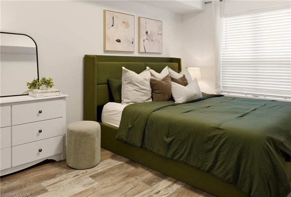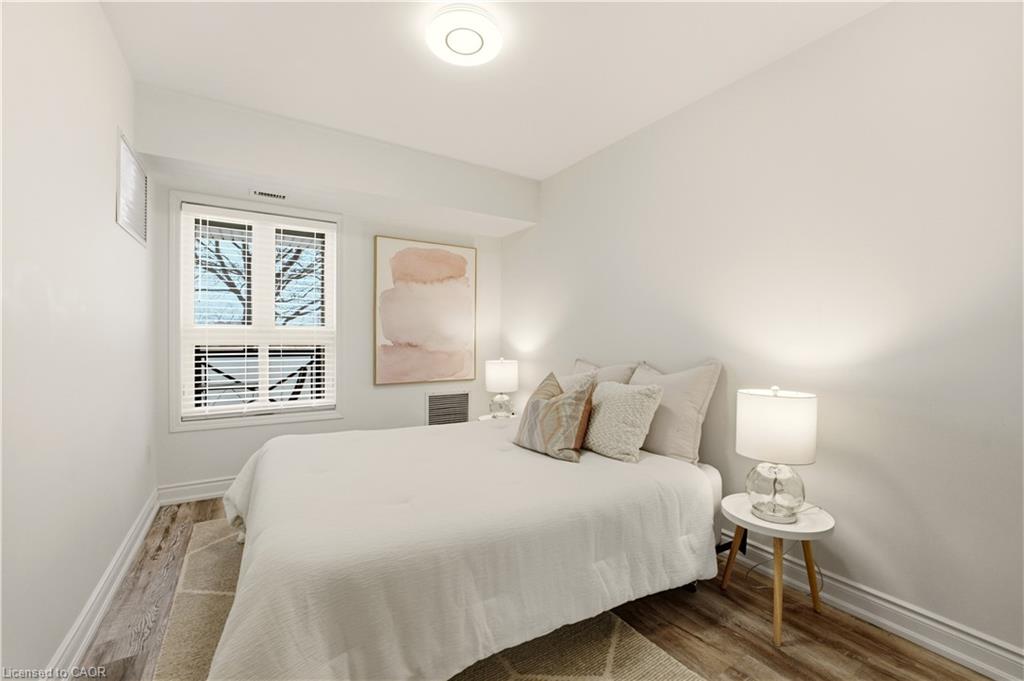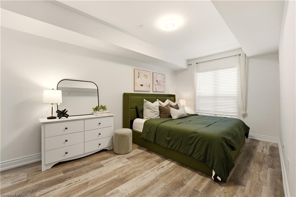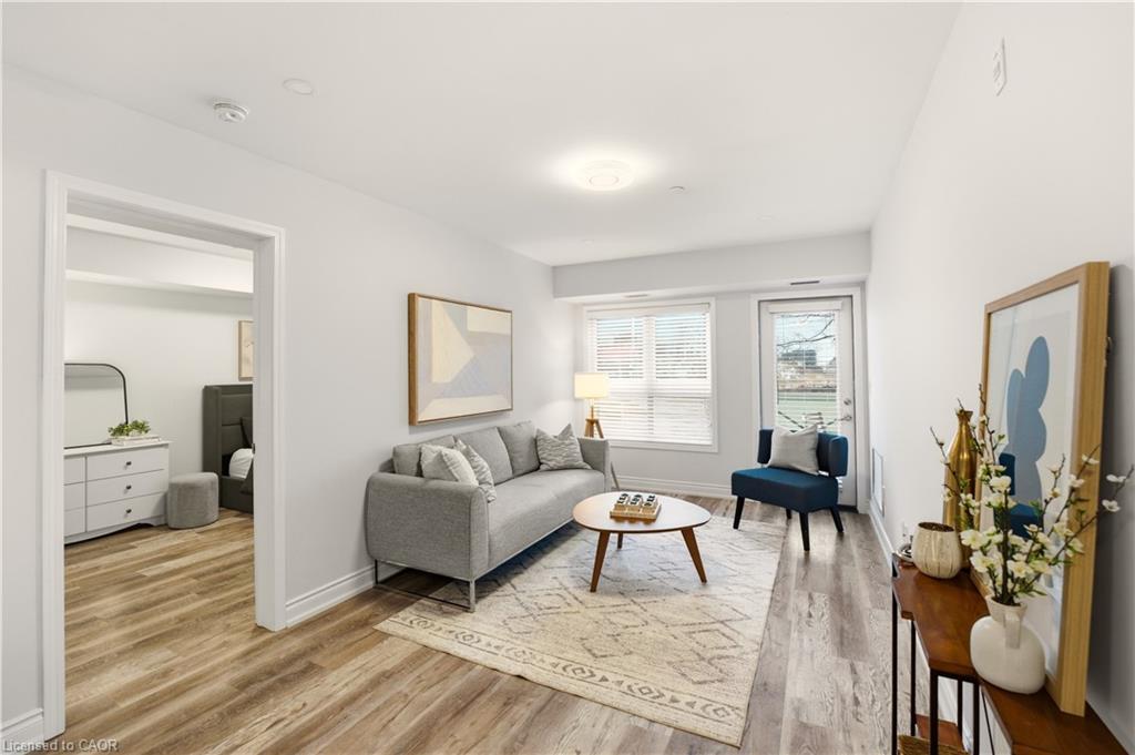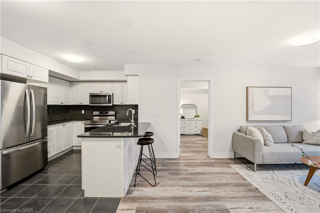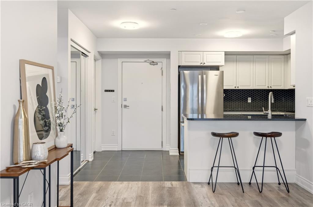 Turn-key Mattamy built 2 bedroom, 2 bathroom unit in the desirable Willmott neighbourhood, offering 865 sq ft of well-designed living space. Upon entering, you’re greeted by a bright and inviting open-concept layout, complemented by a neutral palette and new flooring throughout. The kitchen features shaker-style cabinetry, stone countertops, stainless steel appliances (2023), and a breakfast bar with seating for two, making it both functional and welcoming. Bright, oversized windows fill the home with natural light, and a walkout from the living room leads to a covered porch. The oversized primary bedroom offers plenty of room and comfortably accommodates a king-size bed while still leaving space for a work-from-home setup, if desired. The private ensuite has been redesigned with an upgraded vanity featuring stone countertops and a glass shower enclosure. A second bedroom and an additional upgraded bathroom complete the space. Additional features include in-suite laundry, underground parking, and a locker. Ideally located in the vibrant Hawthorne Village of Milton’s Willmott neighbourhood, just steps to Milton Community Park with a playground, green space, and seasonal splash pad. Within easy walking distance to Milton Community Sports Park and the Milton Sports Centre, offering arenas, a pool, courts, and trails. Nearby amenities also include the Milton Leisure Centre and Sherwood Community Centre—perfect for an active lifestyle and community living.