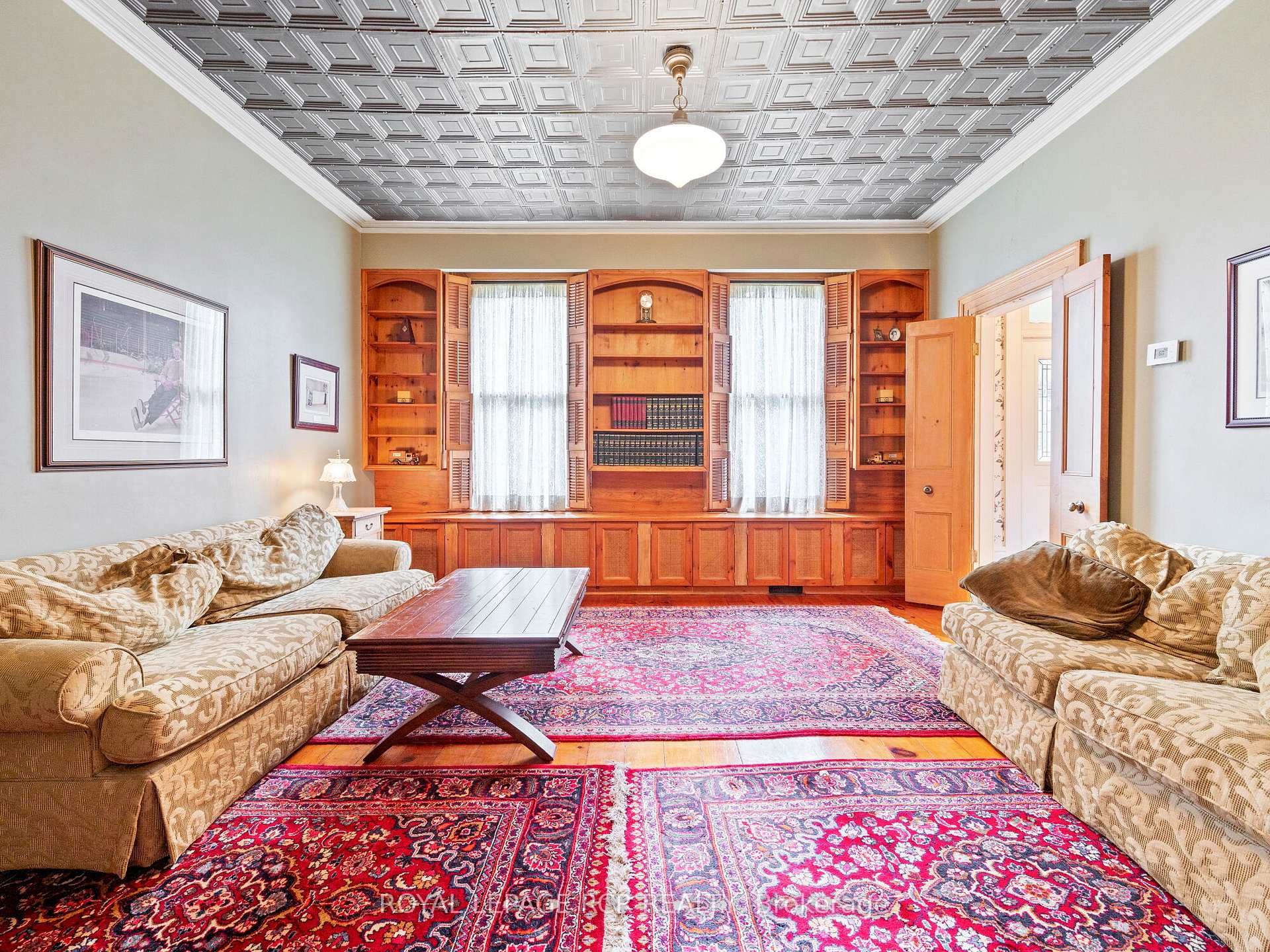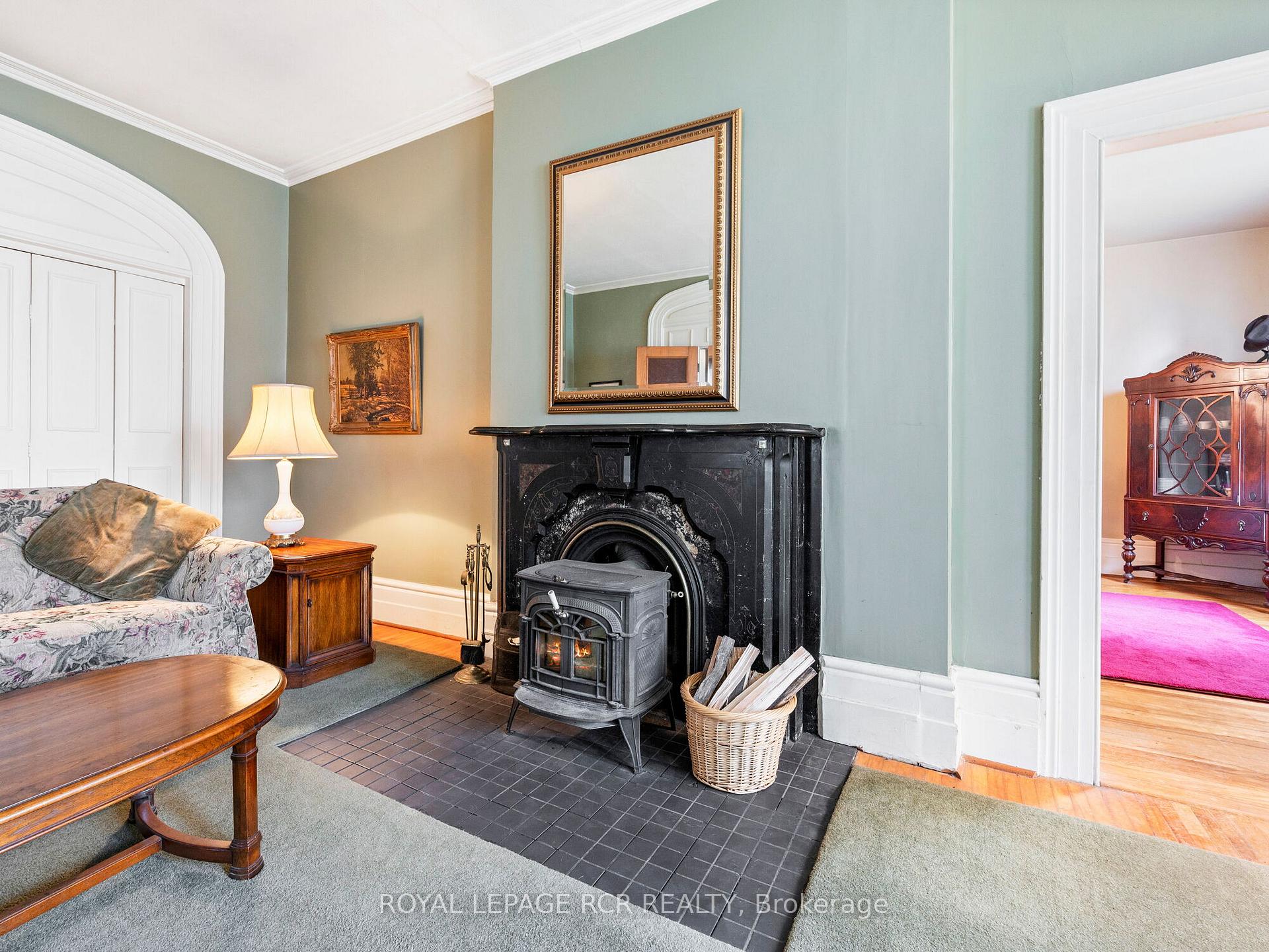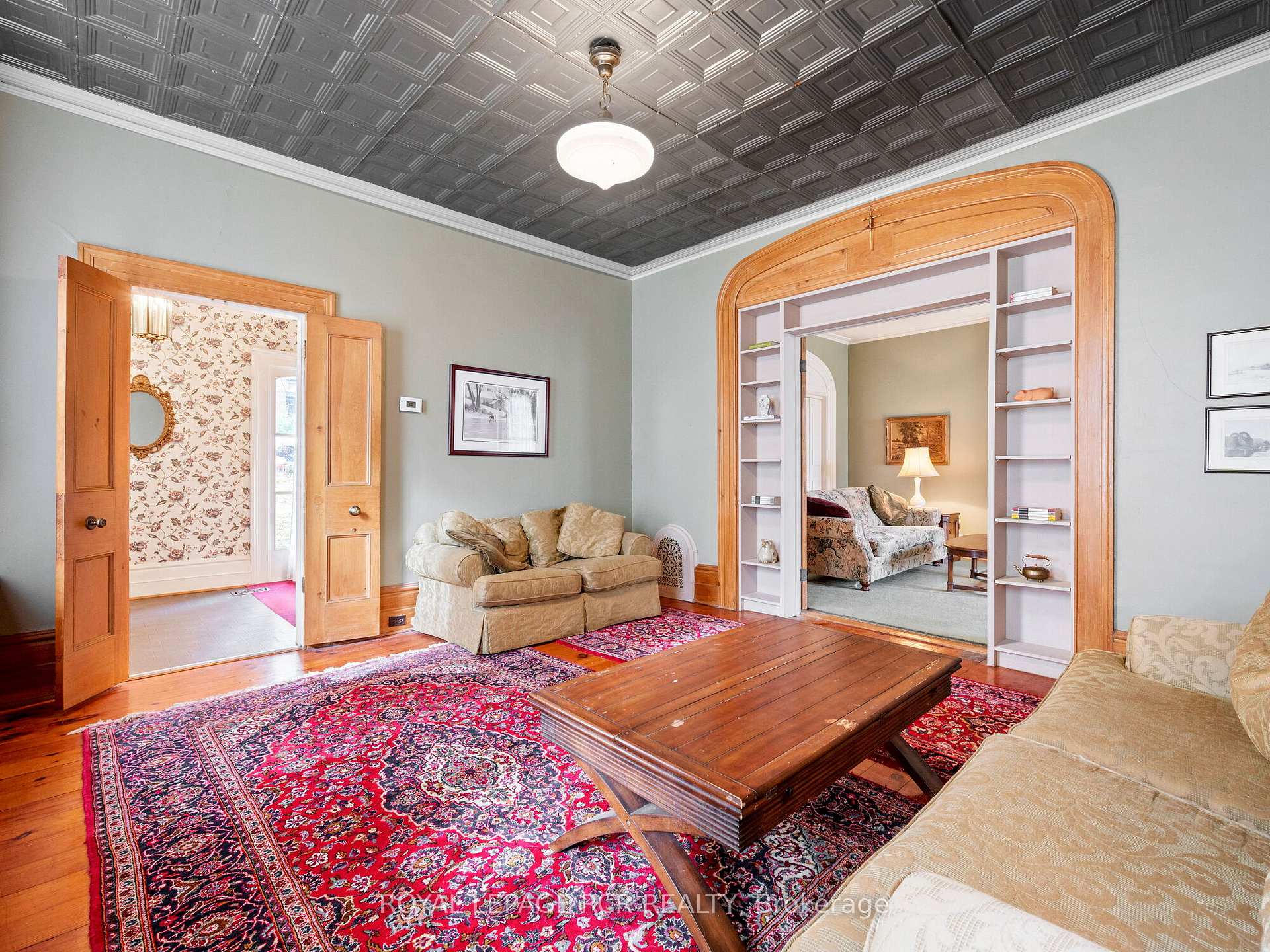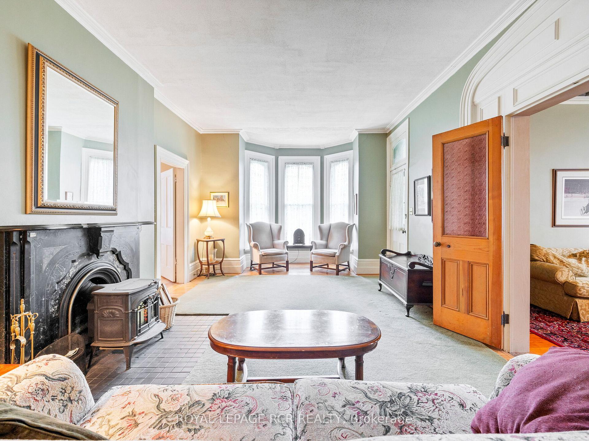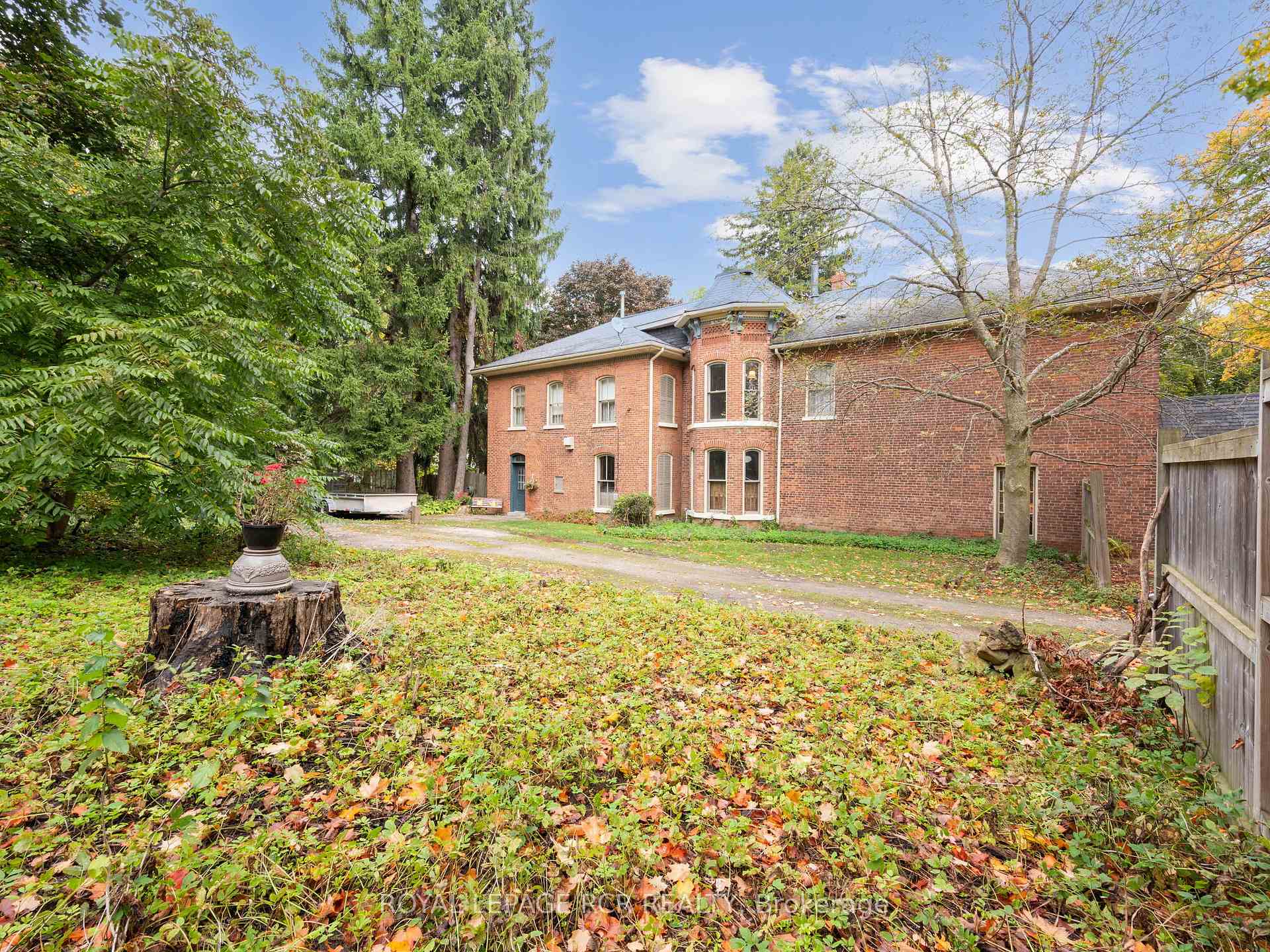 Admired for over 140 years, this sprawling & stately home is a must see. A unique property with endless possibility located in the heart of town. Timeless, quality construction & details thru out including original doors, trim, floors & staircases, spacious principal rooms & ceiling height, multiple walkouts from the main level to mature and private lot- 164 ft. x 187 ft., approximately .70 acre with the house sited in centre of lot. Enjoy a grand foyer & front hall, dedicated library, formal living room with original fireplace and walkout to covered side porch. Enjoy entertaining in an expansive dining room with 2nd original fireplace or retreat to read a book in the cozy den. The kitchen offers lots of space for preparing meals & a large breakfast area with glass walkout door to side patio. The rear main floor laundry room offers a private 2 piece powder room and walkout to yard. The elegant front staircase leads to an open landing area and primary bedroom with walk-in closet & 3 piece ensuite bath, as well as main bath with whirlpool tub & additional bedrooms. The 2nd or rear staircase leads to a charming suite with bright & spacious living/dining room, kitchen, 4th bedroom and full bath – an ideal space for guests or extended family & can be closed off from the rest of the 2nd floor space. Outside you find lots of parking area, an enormous yard with mature trees and rear storage/driveshed. Rare opportunity for a property of this size in a downtown Orangeville location.
