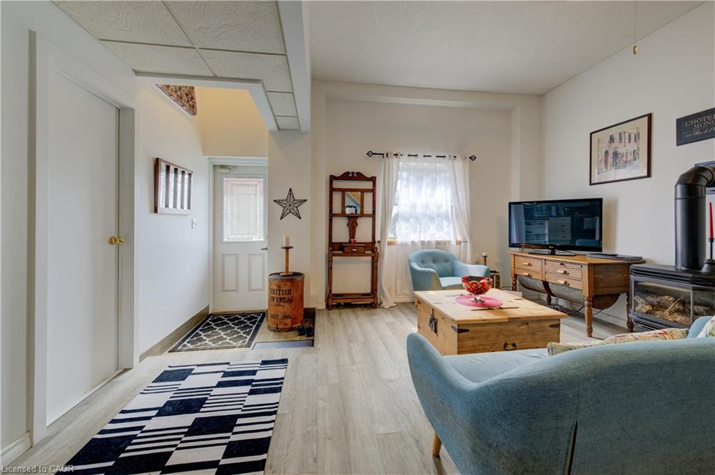 Inside, the open-concept main floor is designed for connection. Cook and entertain with ease while friends gather in the living area, warmed by the fireplace. The kitchen’s central island, complete with overhead pot rack, creates a natural hub, and the main floor also features a convenient 2-piece bath with new stacked washer/dryer. A versatile bedroom with closet and window can double as a private office.