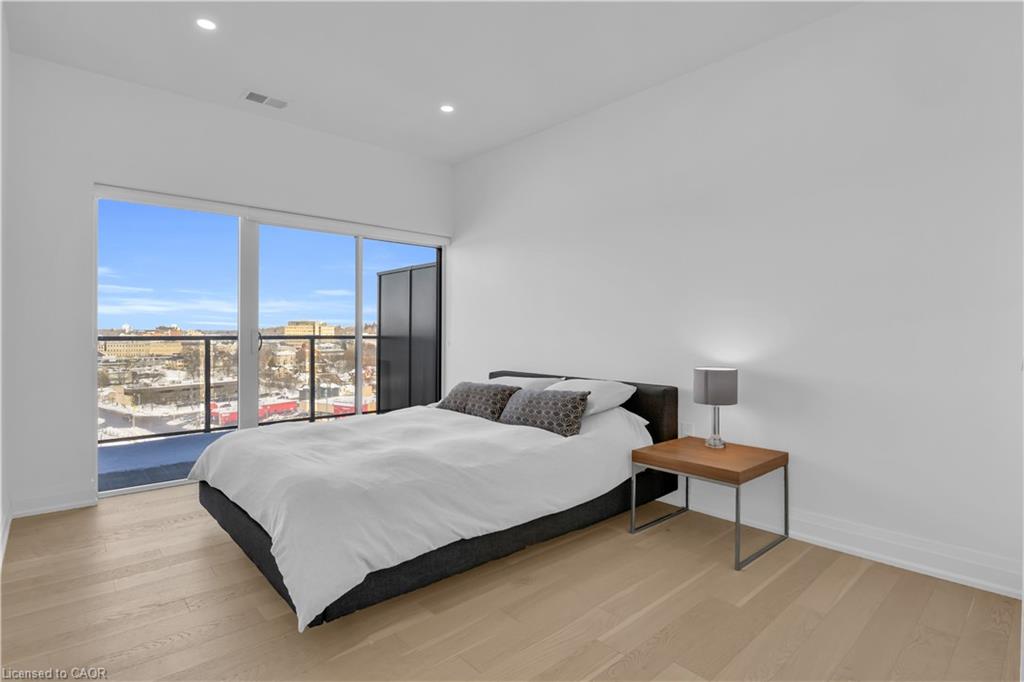 Step out to the expansive private terrace with views of the Speed River, offering ample space for outdoor seating and dining. The primary suite also enjoys its own private balcony overlooking the river, along with a walk-in closet and ensuite bath. A spacious second bedroom is located near a four-piece bathroom, and ensuite laundry provides added convenience.