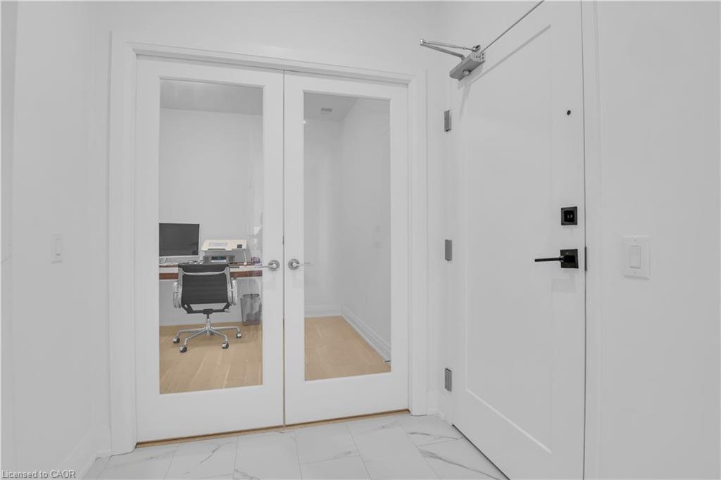 A welcoming foyer with ample closet storage leads to a private den enclosed with French doors, ideal as a dedicated home office, reading retreat, or quiet lounge. This flexible space adds functionality while maintaining separation from the main living areas.