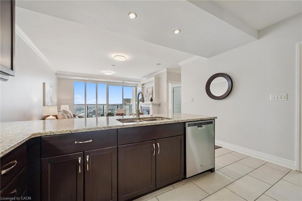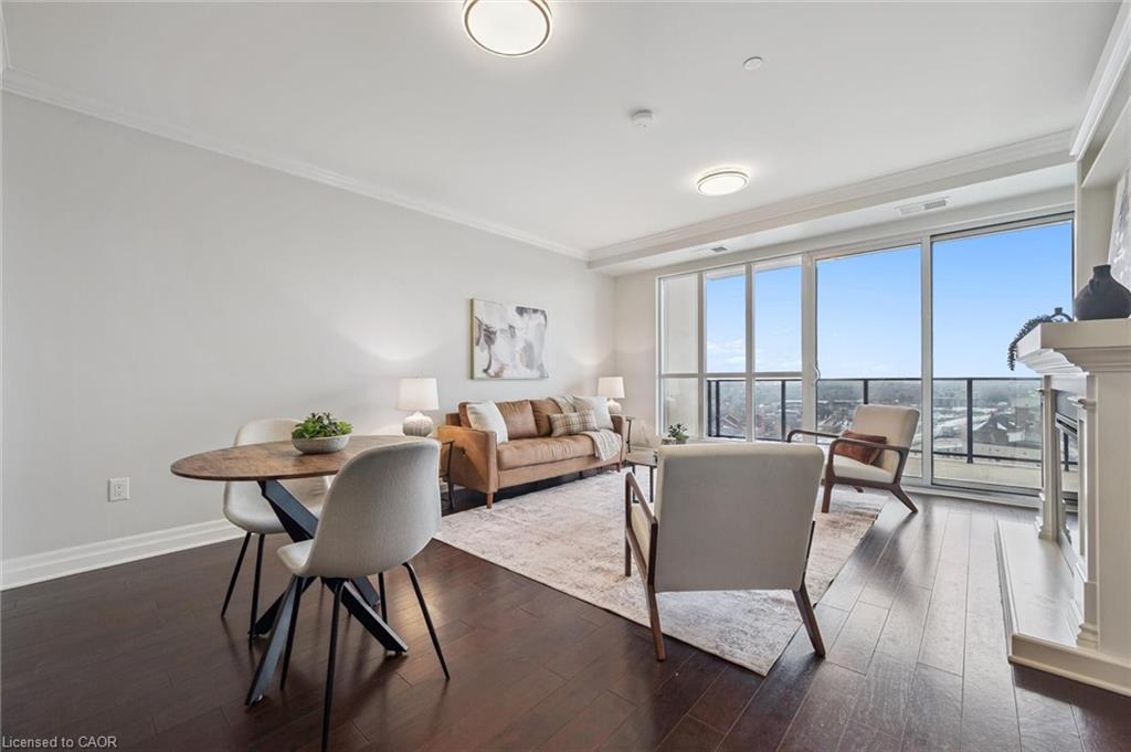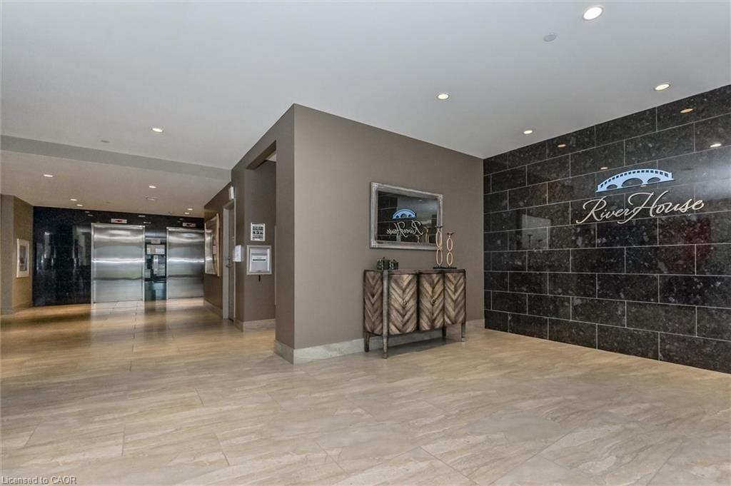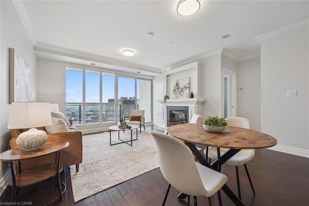 Welcome to Suite 1108 at The Riverhouse, one of Guelph’s most sought-after condominium residences known for its quiet atmosphere, upscale feel, and exceptional management. Perfectly positioned in the heart of downtown, you’re just steps from the GO Station, Sleeman Centre, River Run Centre, scenic walking trails, and Guelph’s best restaurants, cafés, and shops – offering a truly walkable lifestyle. This spacious 1 bedroom plus den suite offers a highly functional and versatile layout. The large den with French doors is ideal as a second bedroom or work-from-home office. Rich hardwood flooring, granite countertops, modern lighting, and a cozy fireplace create a sophisticated living environment. The open-concept kitchen is designed for everyday living and entertaining, featuring full-size stainless steel appliances, ample cabinetry, and a peninsula with bar seating that flows into the generous living and dining area. Sliding doors lead to an oversized private balcony-perfect for enjoying sunset views over downtown. The bright primary bedroom boasts an oversized walk-in closet, with a spacious 4-piece bathroom offering abundant counter space (or easily convert to a dual vanity!). A welcoming foyer with double coat closet and a dedicated laundry/storage room with added cabinetry enhances everyday functionality. Residents enjoy exceptional amenities, including an incredible rooftop terrace with BBQs, elegant party room and lounge with kitchen, media room, library, fitness centre, and well-appointed guest suite. Recent updates include fresh paint, new bedroom carpeting, added laundry room cabinetry, modern lighting, new kitchen faucet, and new toilet. This unit also includes a well-located, owned parking space! Ideally suited for commuting professionals, modern couples, or downsizers seeking refined, low-maintenance living in an unbeatable location. *Most utilities are conveniently covered in the condo fees, and storage lockers are available to rent for $35 per month.
