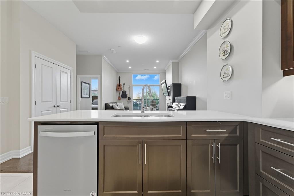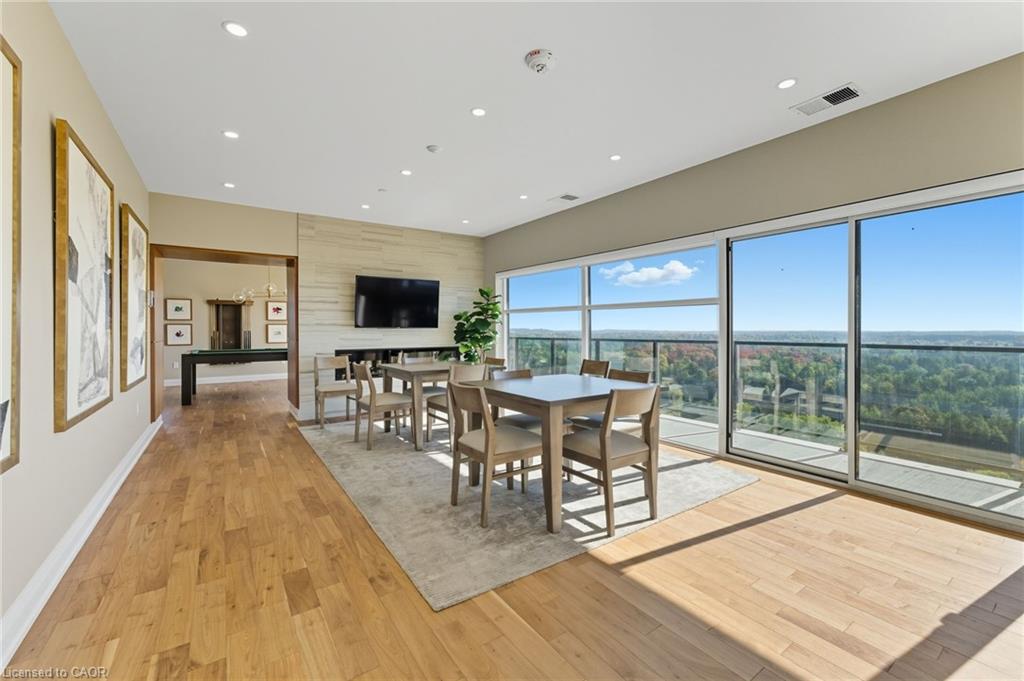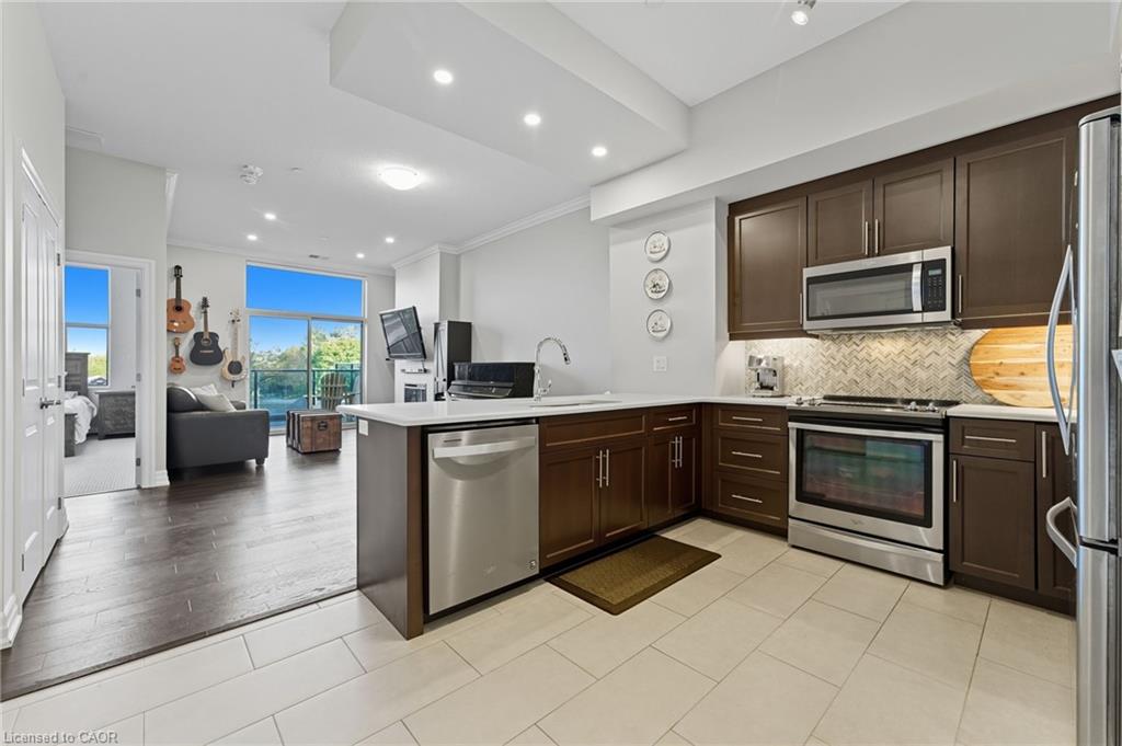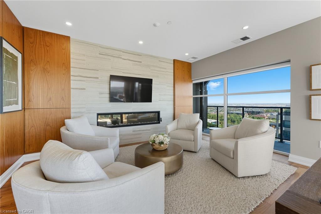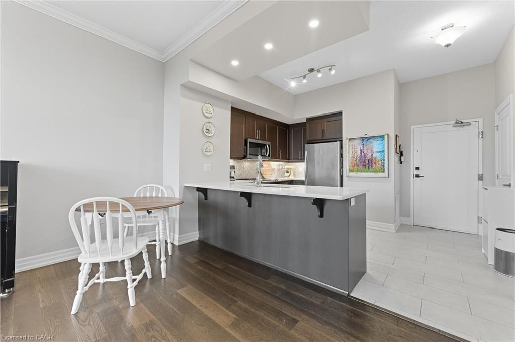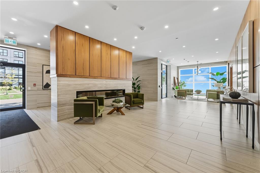 Skip the elevators and step into this stylish 1-BEDROOM + DEN condo that blends comfort, function, and a touch of luxury. Located in one of Guelph’s most sought-after south-end communities-just steps from shopping, restaurants, and movie theatres, with easy access to the GO Bus and public transit, this unit offers both convenience and connection.Inside, you’ll find a thoughtfully designed layout featuring a modern kitchen with QUARTZ counters, a sleek BACKSPLASH, built-in microwave, and bar seating that opens to a comfortable dining and living area. The included wall-mount for your TV and a built-in electric FIREPLACE add warmth and sophistication. The spacious bathroom features HEATED FLOORS, a rare luxury you’ll appreciate year-round.Enjoy exceptional amenities right at your door: guest suites, a fully equipped fitness room, and even a golf simulator-all on the same floor! When it’s time to entertain, head up to the 13th-floor party room and take in the sweeping southern views. UNDERGROUND PARKING adds comfort and security to this already complete package.Whether you’re a first-time buyer, downsizer, or investor, this condo offers an unbeatable combination of style, location, and lifestyle-all in one smart move. BEST VALUE IN A WELL RUN BUILDING IN GORDON SQUARE. Quick Occupancy available.
