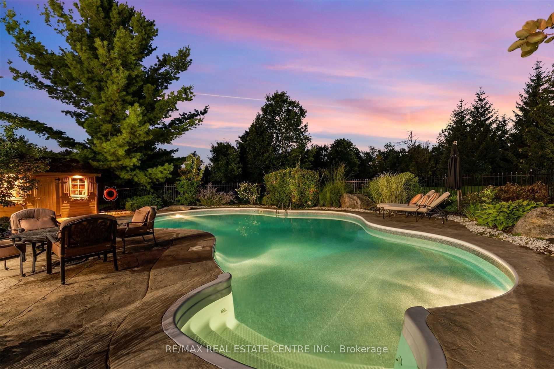 An exceptional opportunity to own a private luxury retreat in the prestigious Churchill Estates. Nestled on nearly 2 acres at the end of a quiet court, this elegant 4 bedroom, 4 bath estate offers an unparalleled lifestyle. Boasting over 5,000 sqft of beautifully finished living space, the home features a soaring vaulted ceiling in the great room, a stunning custom kitchen, and a serene primary suite with a spa like ensuite and walk in closet. Every detail has been thoughtfully designed from the grand principal rooms and home office to the fully finished basement with a rec room and gym. The professionally landscaped backyard is a true oasis, perfect for entertaining, with an in-ground pool, tennis court, outdoor kitchen, and covered patio. Complete with a Generac generator, integrated audio system, and 3-car garage .Ideally located minutes from highways, this home delivers luxury, comfort, and peace in one of Miltons most exclusive communities.