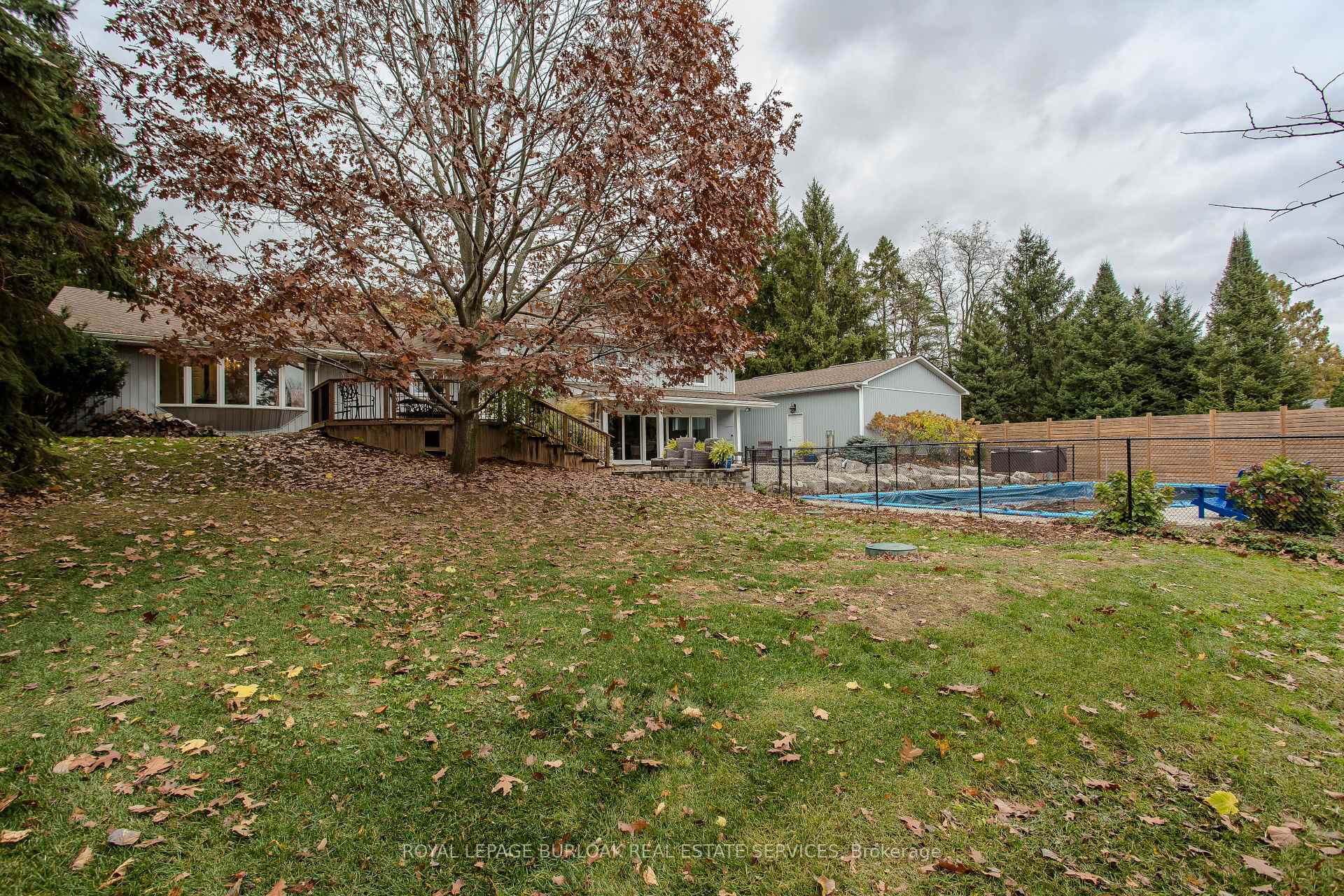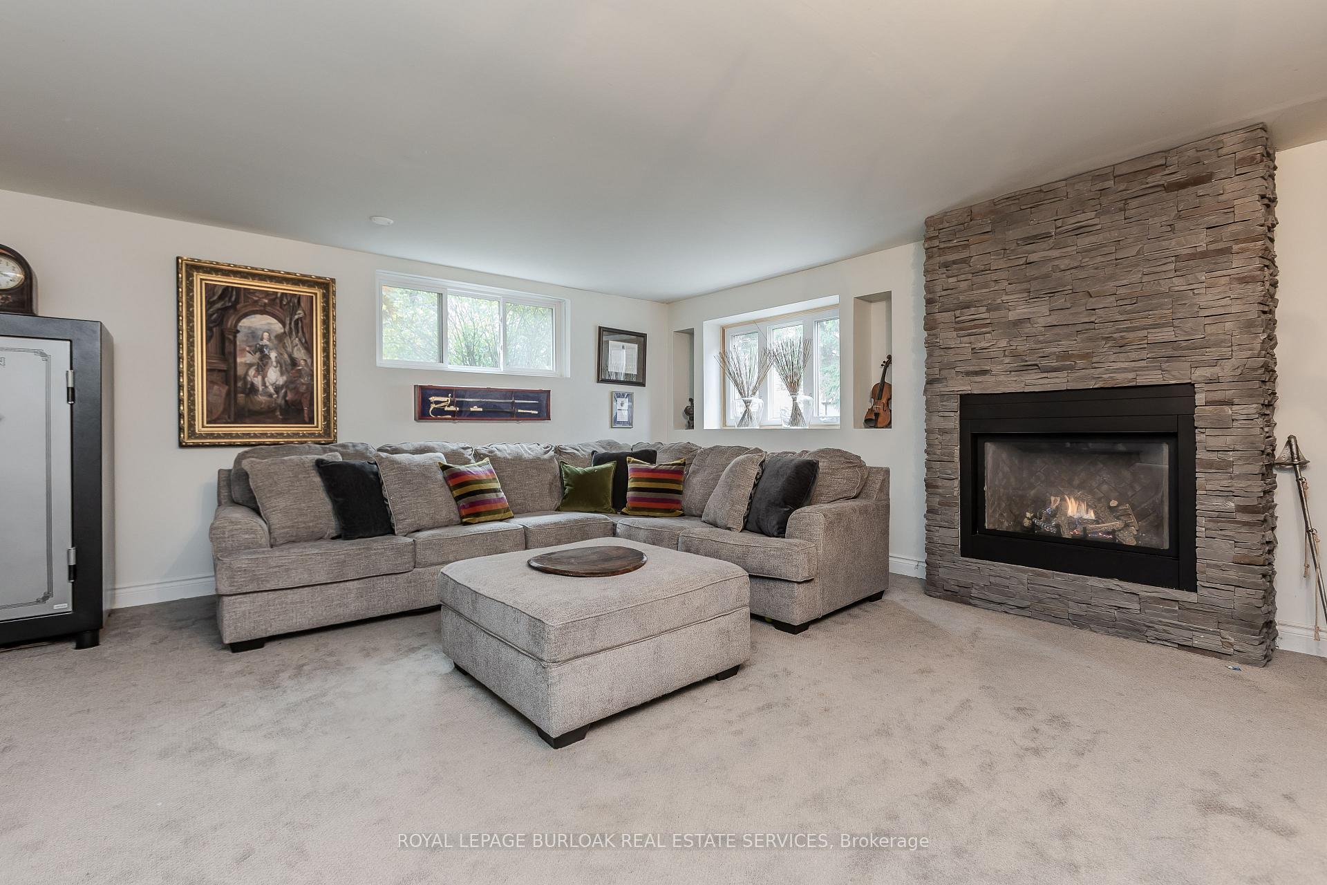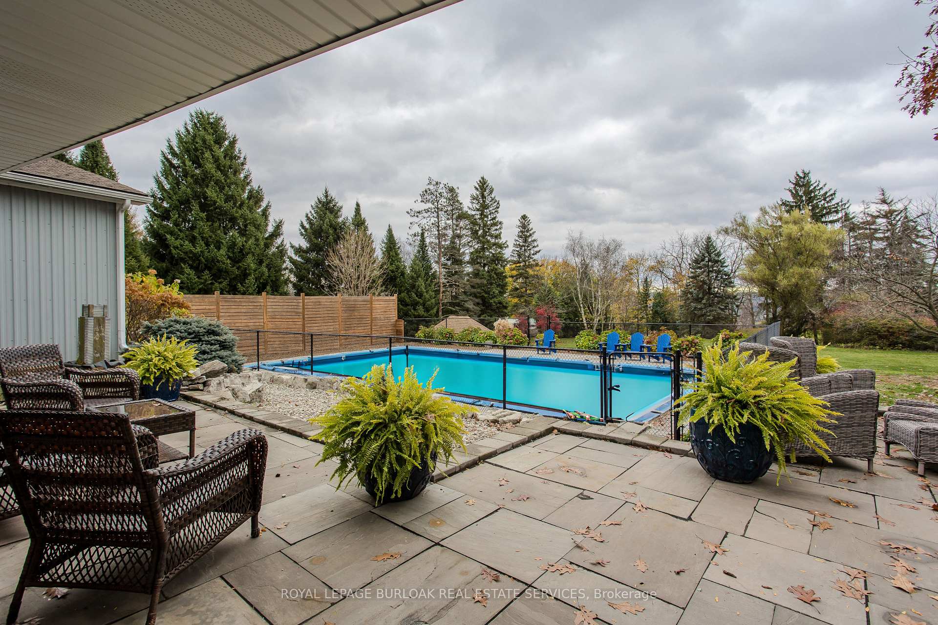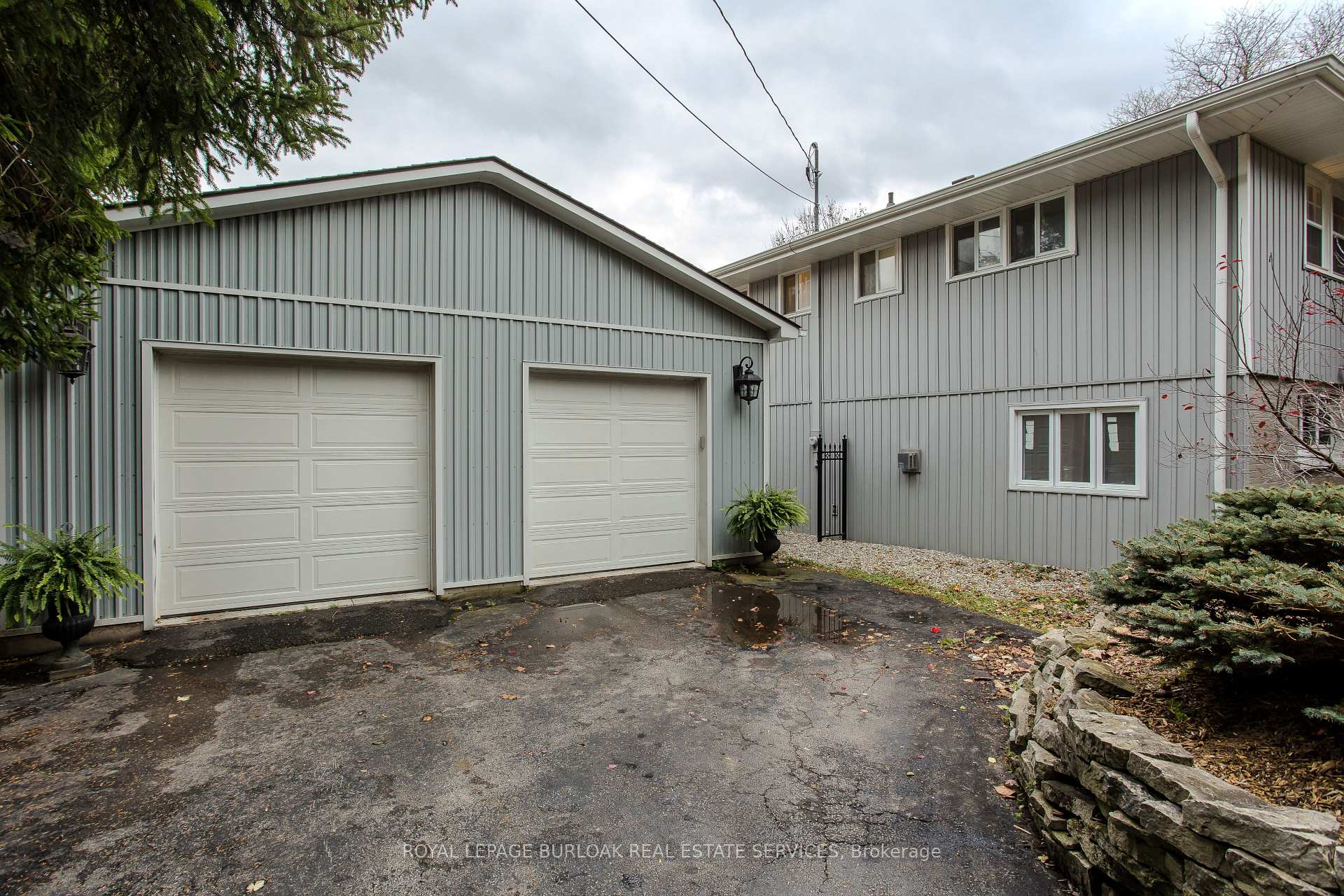 Welcome to this charming 4-level side split, originally crafted for the Grafton family in 1954. Situated on a serene 1.09-acre lot, this property boasts privacy and beauty with mature trees, a long driveway, and ample front yard space accommodating parking for 10+ vehicles, including a 20×40 garage with a lift. Perfectly located, its just 3 minutes from Dundas Valley Golf & Curling Club, 5 minutes to quaint downtown Dundas, and close to scenic trails, waterfalls, and major routes. Inside, find a bright, welcoming ambiance with hardwood throughout. The eat-in kitchen leads to a dining room with elegant coffered ceilings. The Great Room on the main level is a showstopper, featuring floor-to-ceiling windows, a wood burning fireplace, one of 5 fireplaces in the home, and an adjoining family room ideal for gatherings. Upstairs, enjoy a private primary sanctuary with views of the escarpment with a 4-piece ensuite, alongside an additional 3-piece bath with a glass shower. The lower level offers a partially finished walkup with a billiard room, which could be used as a fourth bedroom, patio access, storage, utility room, and a rough-in for a washroom. Outdoors, a private backyard oasis awaits, complete with a hot tub, a recently painted (2024) in-ground pool, and expansive views of the escarpment and golf course. New furnace installed in 2022. Don’t miss this exceptional Greensville home!