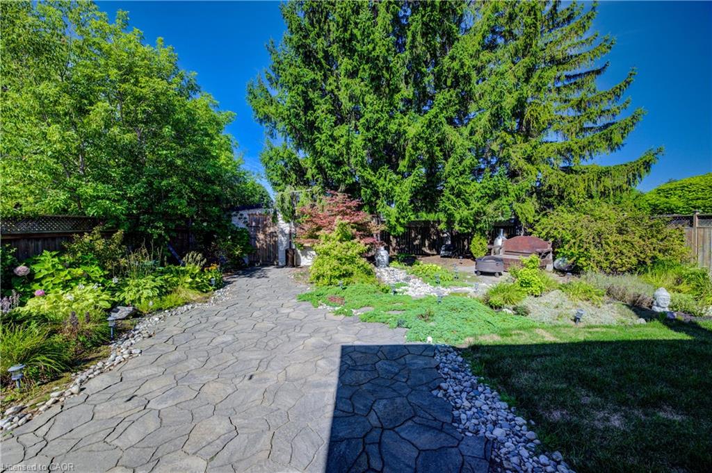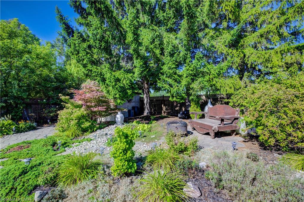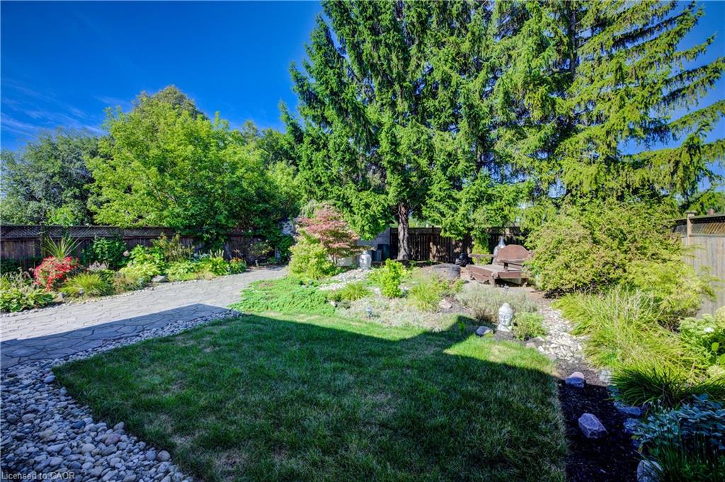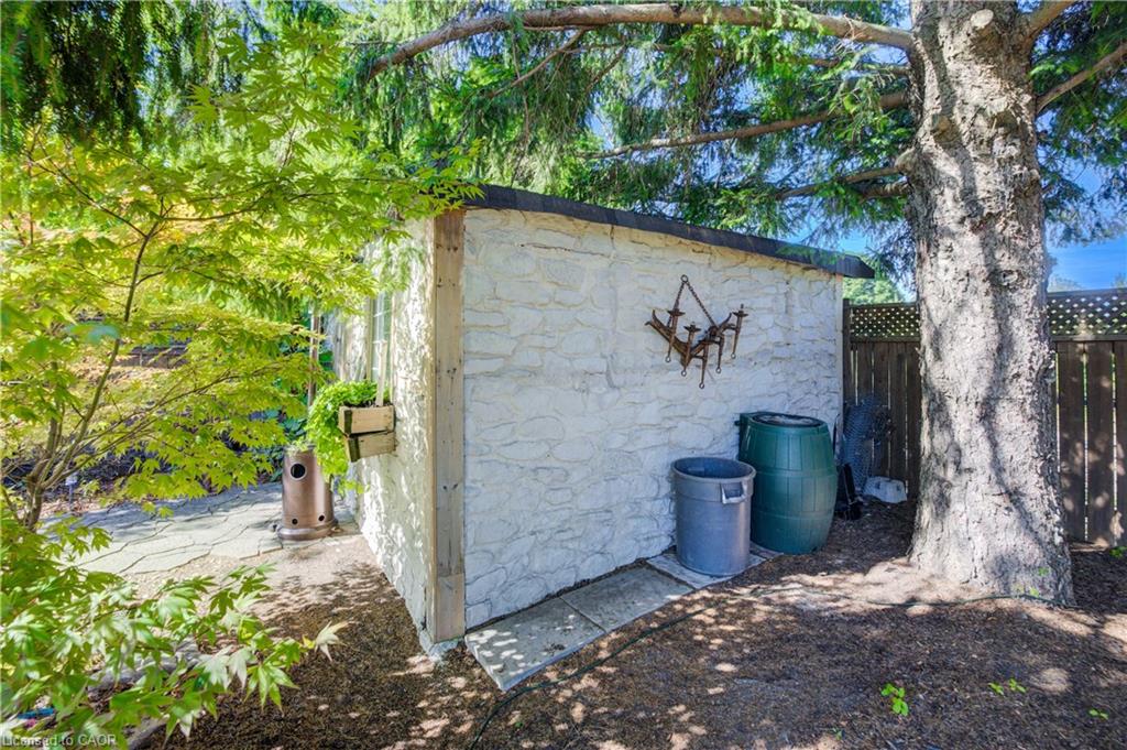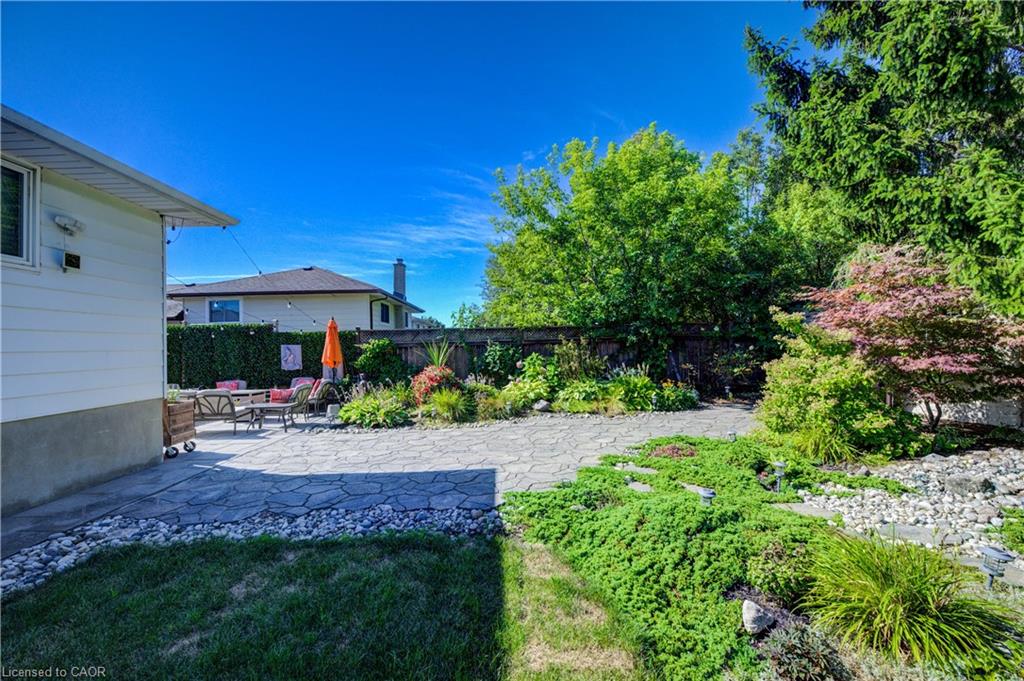Outdoors, enjoy a beautifully landscaped backyard featuring a covered patio, mature trees, a shed with hydro, and plenty of space for entertaining and relaxing. The single garage has direct backyard access, and the driveway accommodates up to three vehicles. This carpet-free home also features a charming front porch for peaceful evenings.