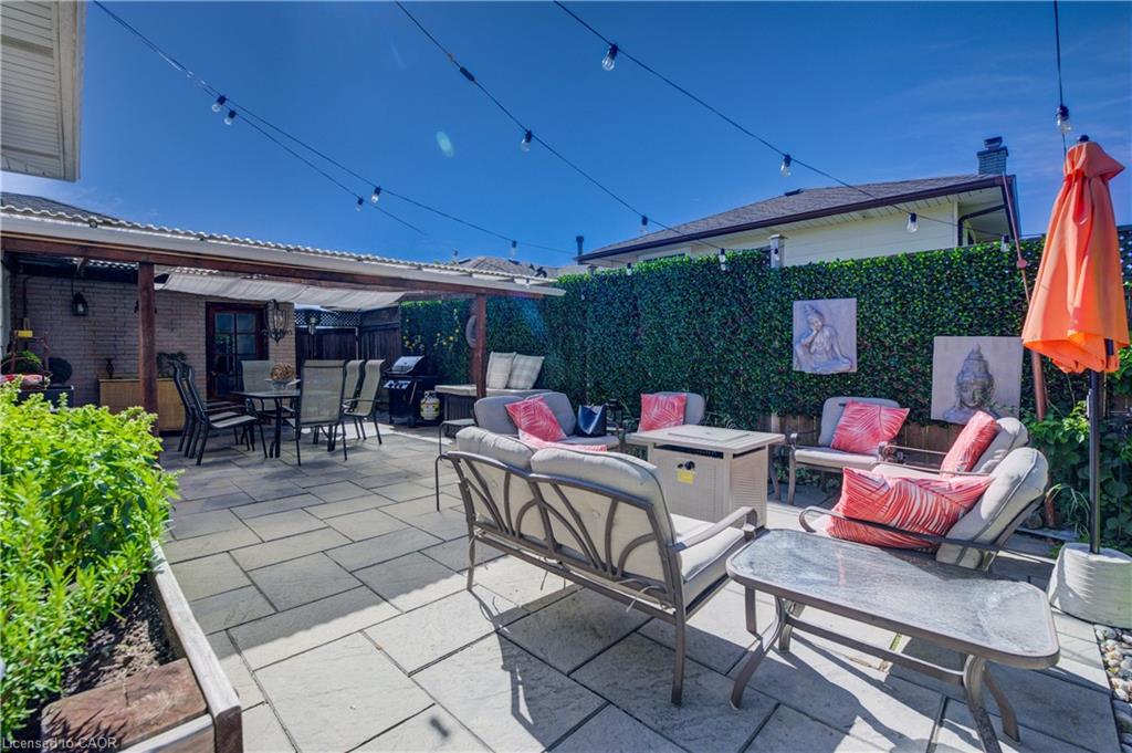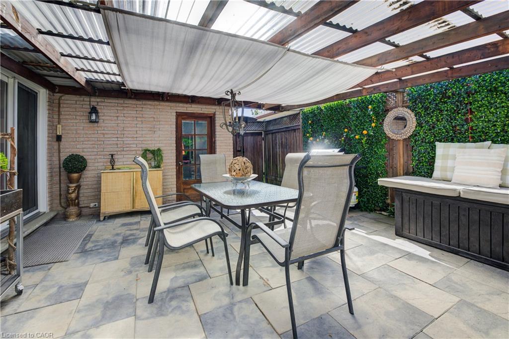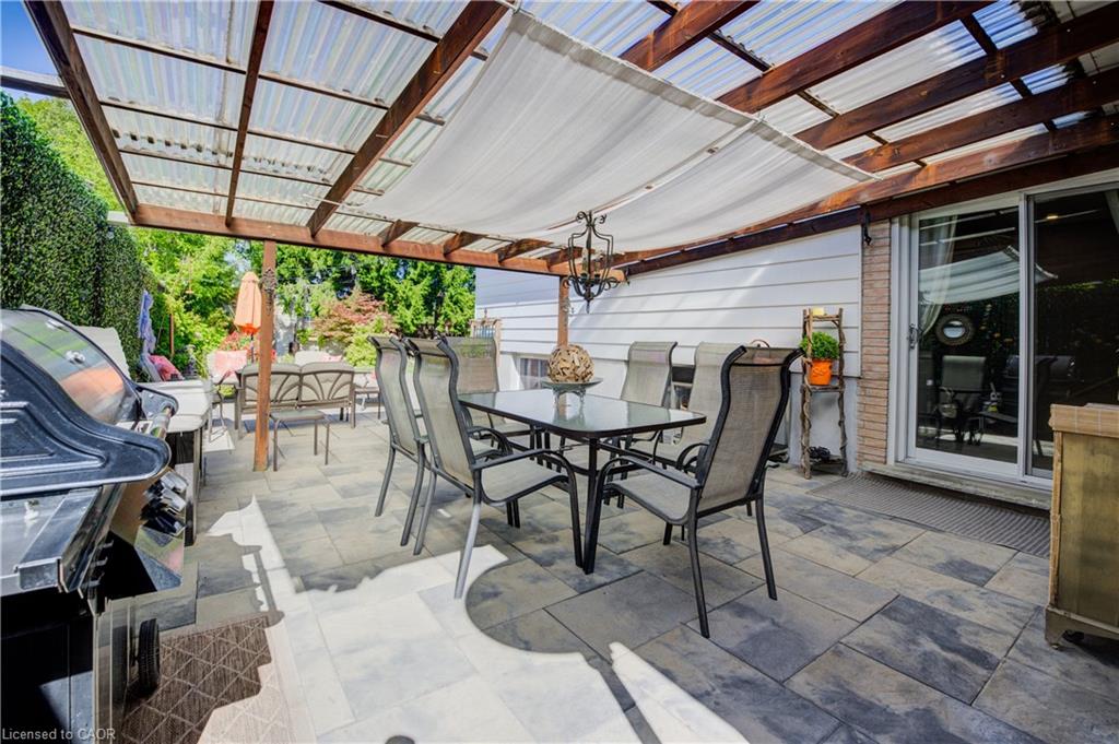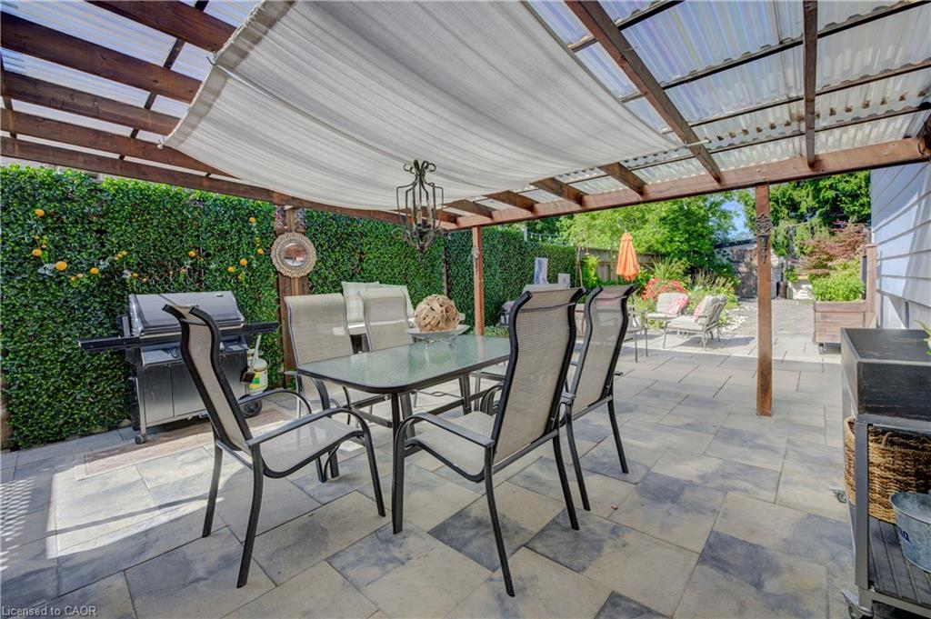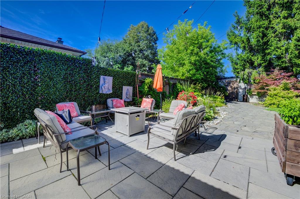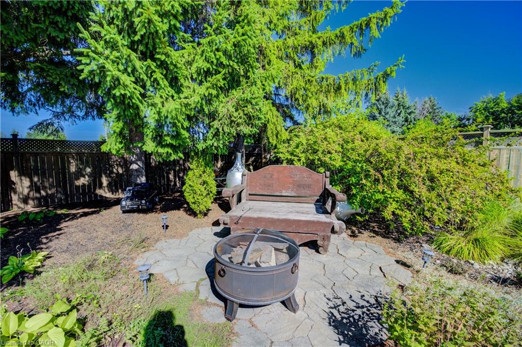 Outdoors, enjoy a beautifully landscaped backyard featuring a covered patio, mature trees, a shed with hydro, and plenty of space for entertaining and relaxing. The single garage has direct backyard access, and the driveway accommodates up to three vehicles. This carpet-free home also features a charming front porch for peaceful evenings.