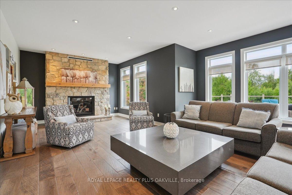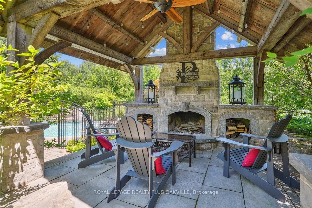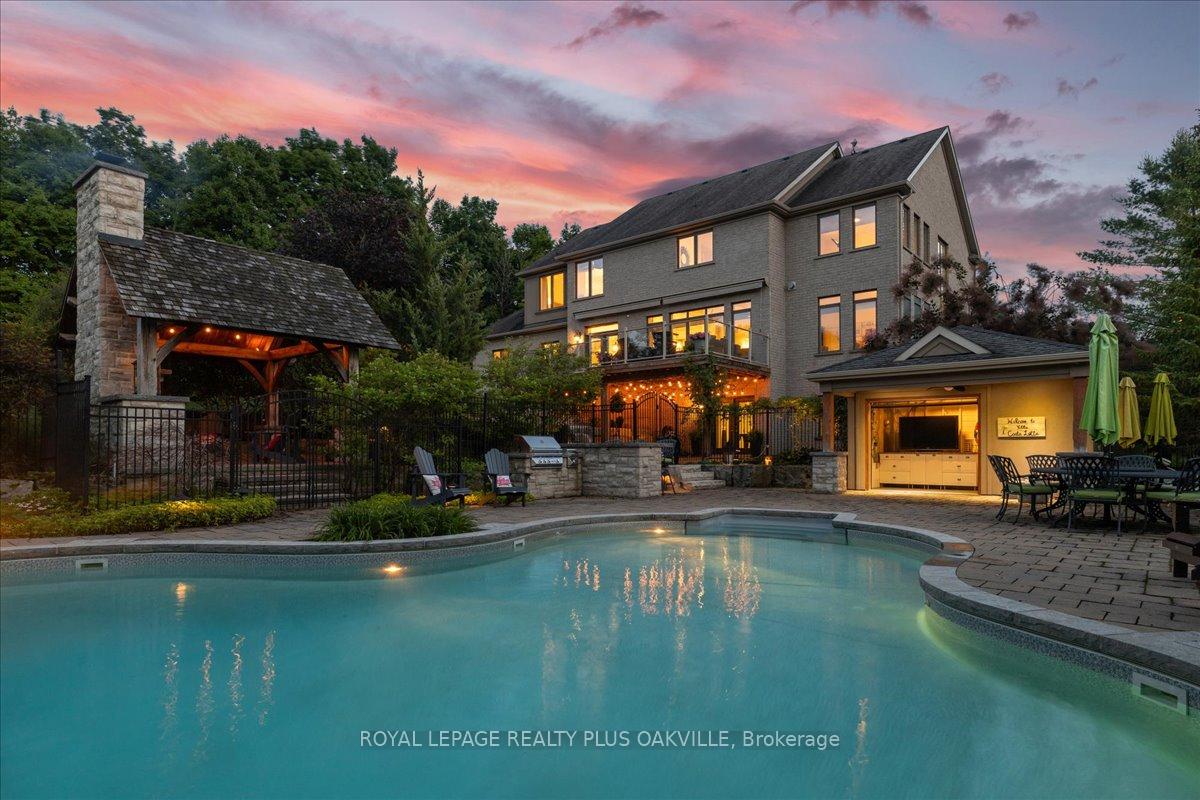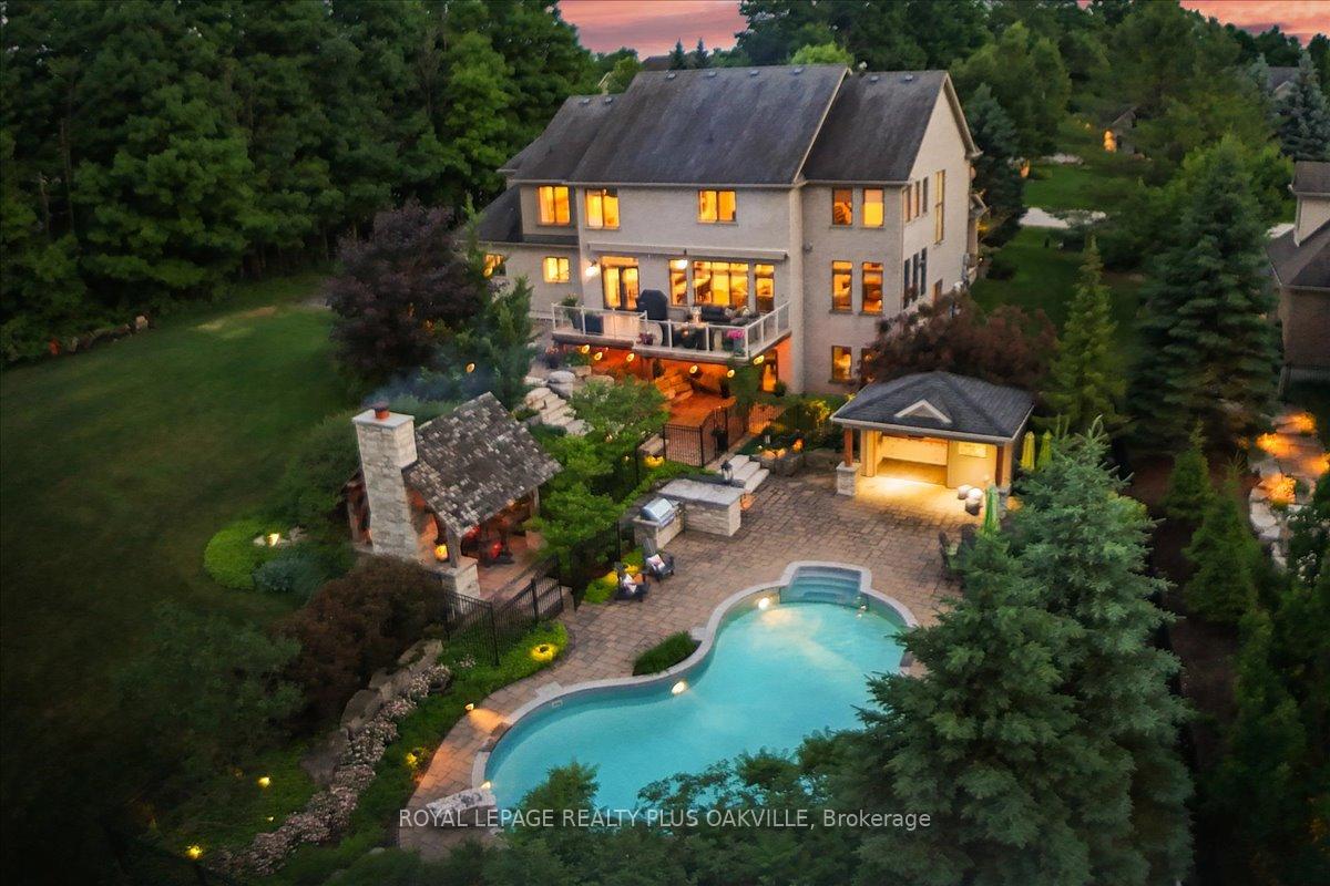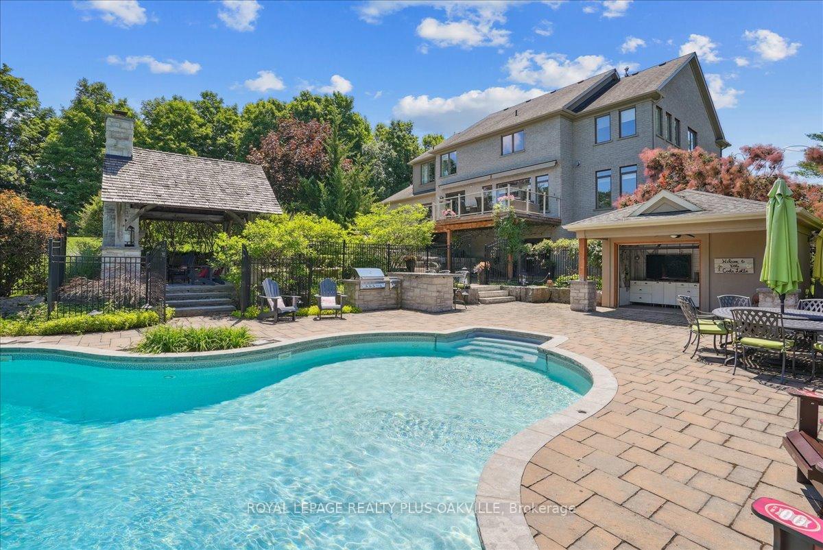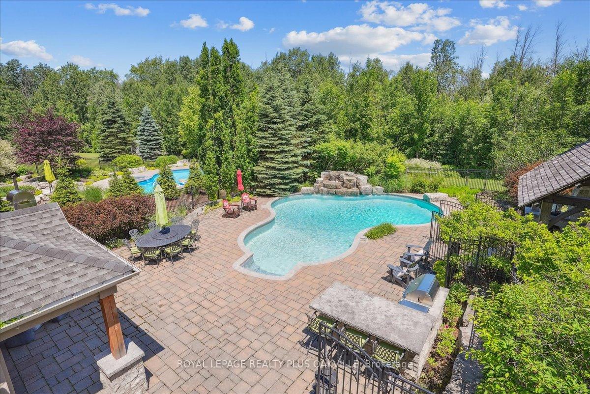 Beautifully designed executive home offering over 5,700 sq ft of finished living space on a quiet court, with exceptional privacy and stunning treed views. The spacious main floor features an entertainers gourmet kitchen with full fridge and freezer, 48-inch range, hidden coffee bar, and an oversized island with seating for six+. The kitchen opens to the eat-in area and living room with hand picked stone fireplace, plus a formal dining room that seats 16+. Main-floor laundry and a convenient three-car garage with large driveway parking for approximately 8 cars. Upstairs you’ll find five generous bedrooms and three full baths, including a luxurious primary suite with oversized ensuite, two walk-in closets, and a private exercise room. A second bedroom with its own ensuite is perfect for guests or family. The finished walk-out basement is designed for entertaining, with a full bar, pool table area, dance room, bathroom, and plenty of storage. Step outside to your backyard oasis featuring a sparkling pool with waterfall, diving rock, and fountains. Enjoy both a dedicated pool house and a separate outdoor living room with stone fireplace and cedar shake roof. Host gatherings at the built-in poolside barbecue and bar area, all surrounded by mature trees for ultimate seclusion. Natural gas is at the property rare for country living!