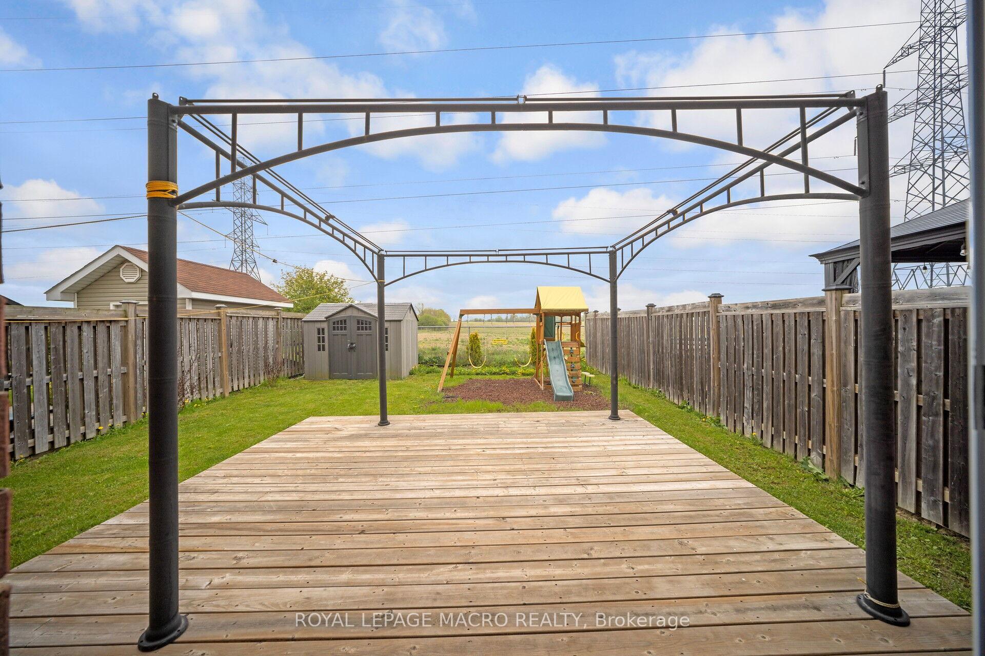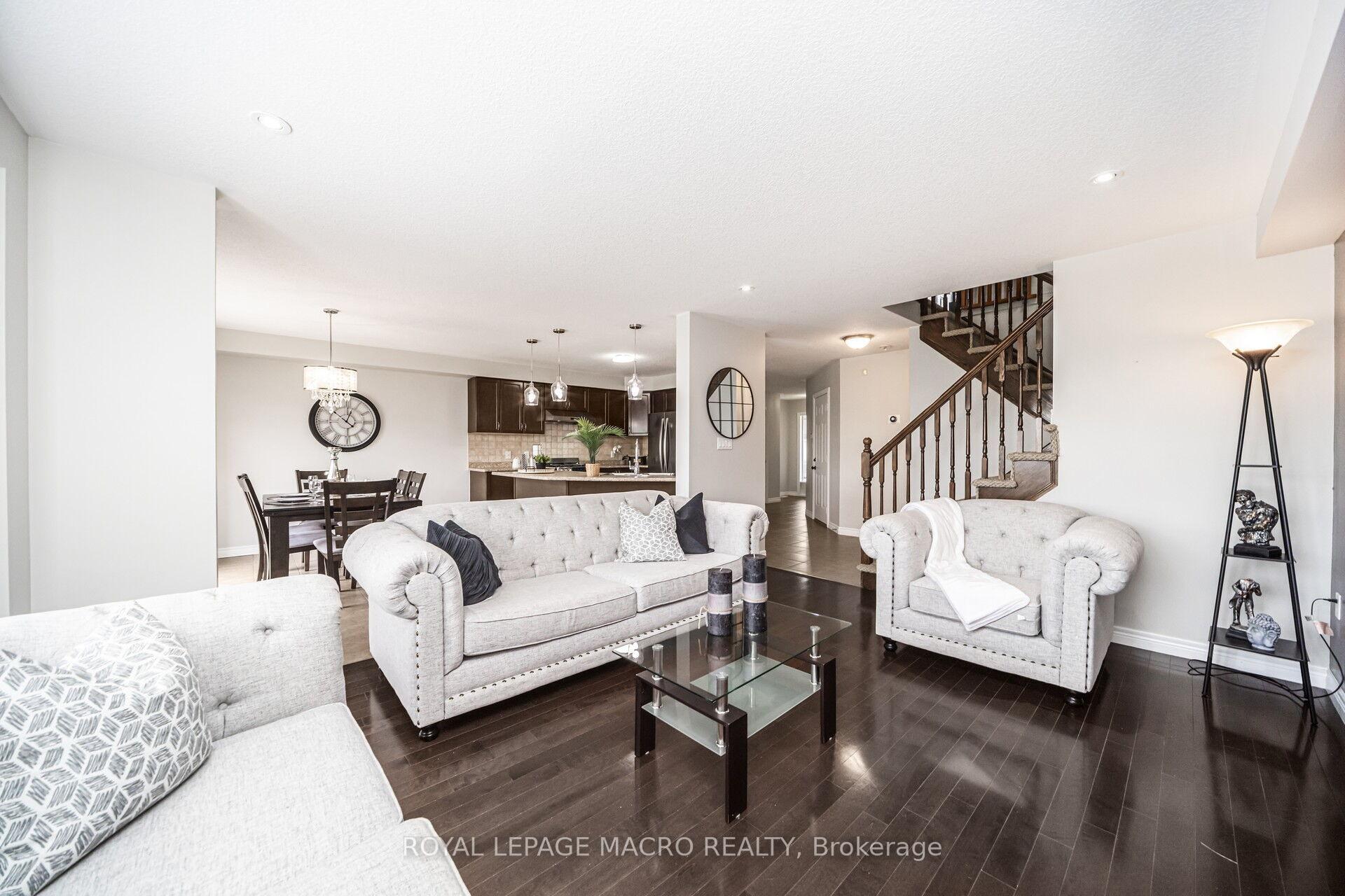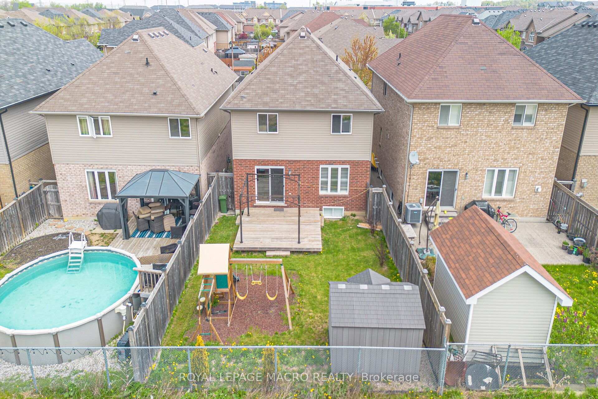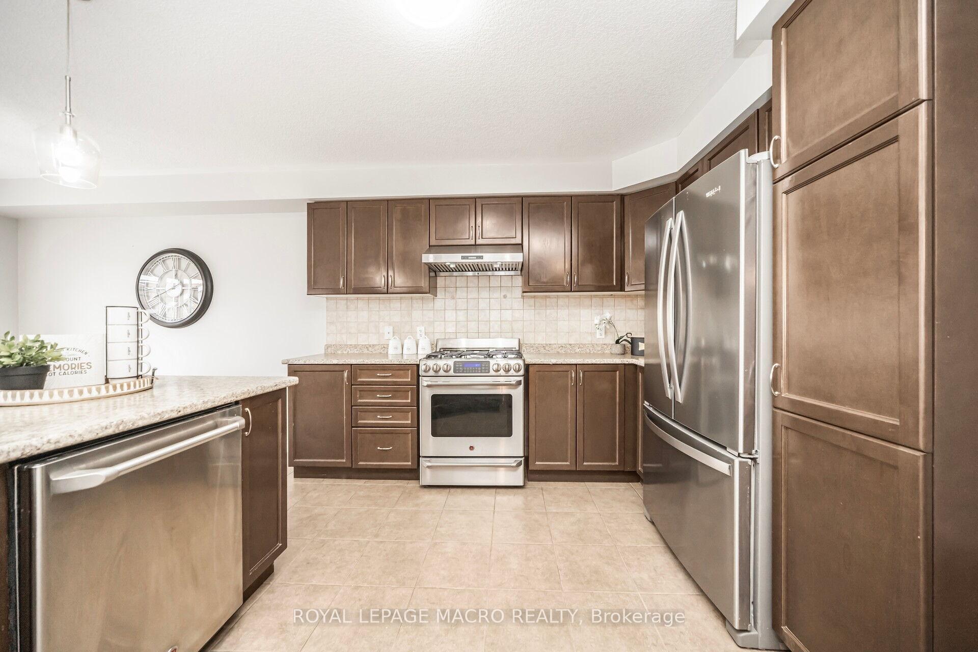 Stunning and well-kept 4-bedroom, 2.5-bath home in the highly desirable Summit Park community, offering over 2,000 sq. ft. of bright, open-concept living space. The main level features a spacious eat-in kitchen with breakfast bar, pendant lighting, and stainless steel appliances, opening to a dining area with patio doors leading to the backyard. The cozy family room includes hardwood floors and recessed lighting. Upstairs, the primary suite boasts a walk-in closet and a spa-like ensuite with a double vanity and a custom glass walk-in shower. Three additional bedrooms are bright and airy. The professionally finished basement includes a recroom wired for surround sound and a rough-in for an additional bathroom. Set on a premium lot backing onto green space, the fenced backyard features a new deck, shed, and playset perfect for families. Additional highlights include California shutters, updated central A/C, upgraded underpad, double garage with inside entry, and a gas line for BBQ. Walking distance to top-rated schools and close to parks, shopping, and highway access.
