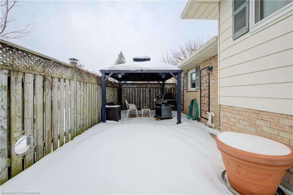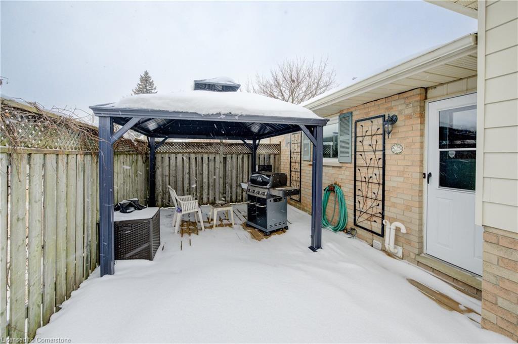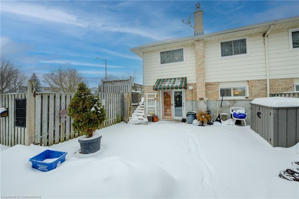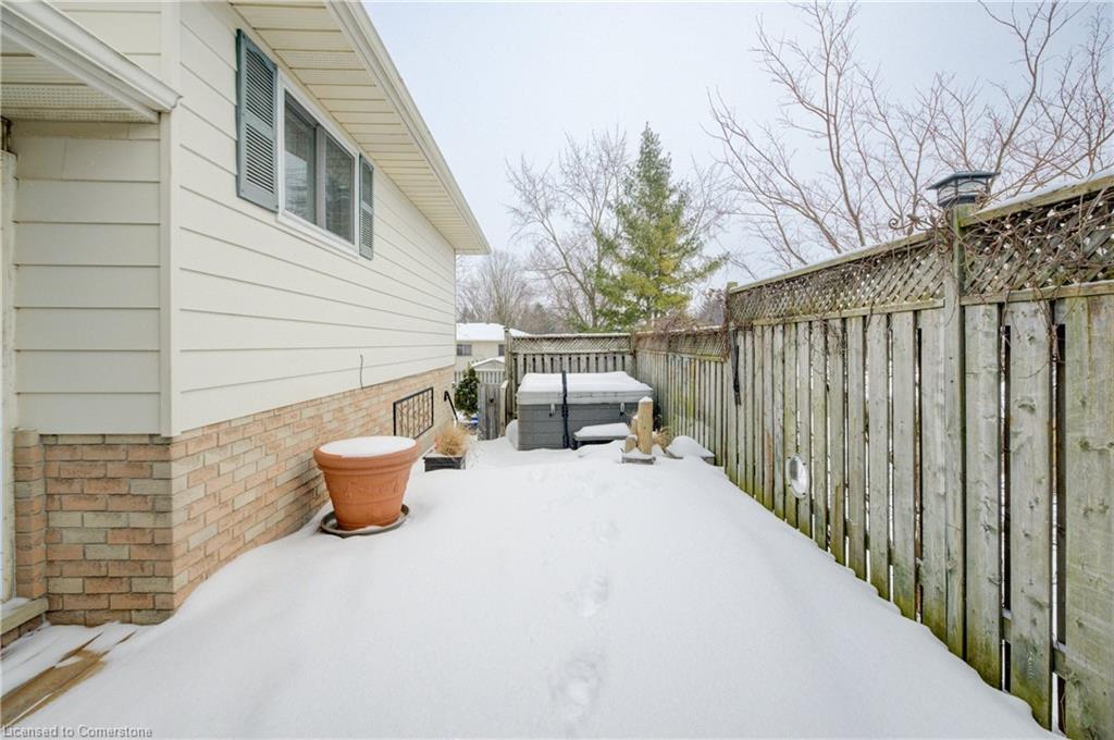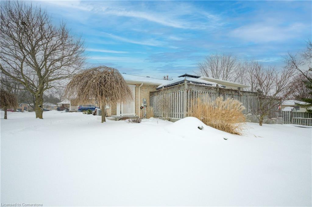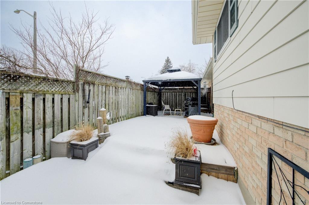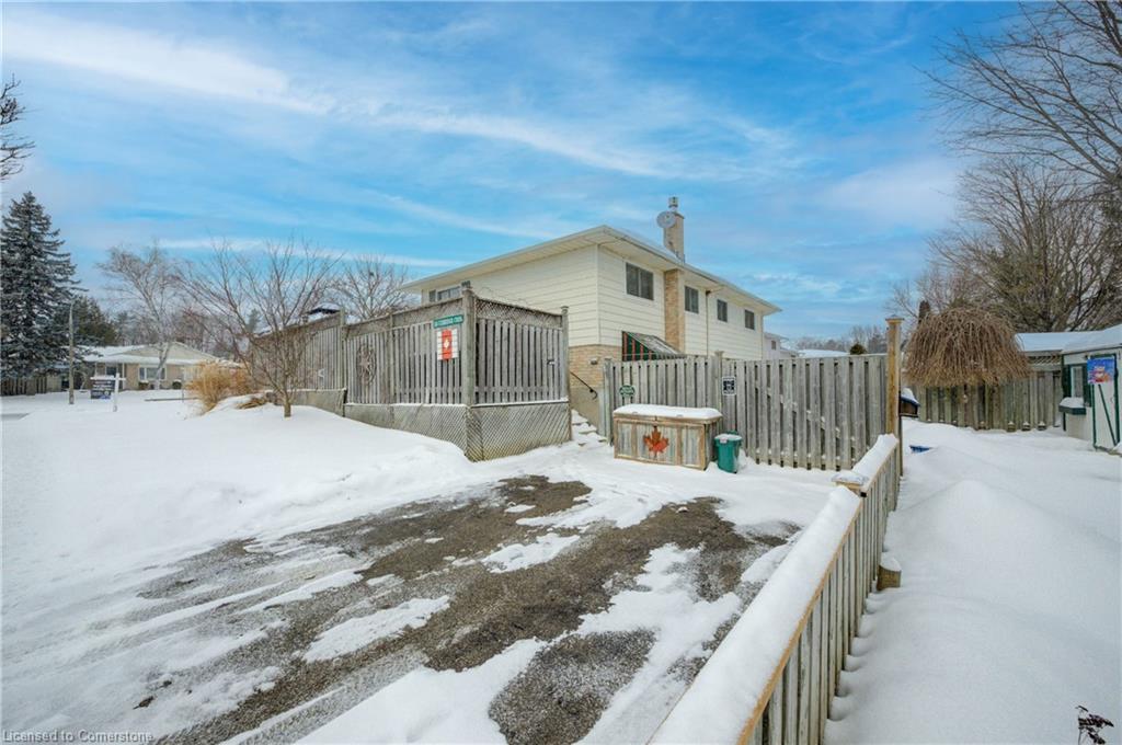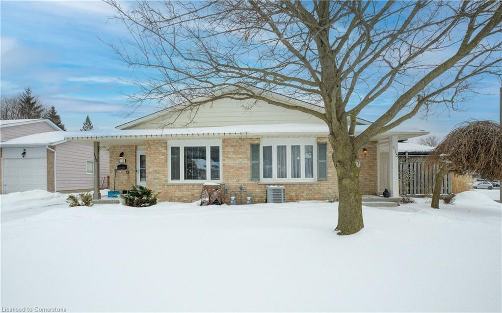 When does a semi-detached home feel like a detached home? When it is located at 115 Uxbridge Crescent! Situated on a full-sized 50×117 foot lot, with side parking off Erinbrook and front guest entry off Uxbridge, this superior corner property conveys the feeling of detached home with all the privacy and features you could hope for. The showpiece of this flexible 4-level backsplit design is the remodelled kitchen (Oct. 2014), complete with gorgeous cabinetry and backsplash, tasteful countertops, and bright, welcoming atmosphere. A half-wall opens from kitchen to the dining area, making it ideal to engage with family and guests. The warm, rich glow of hardwood flooring (Nov. 2016) flows throughout the living room and dining areas. Upstairs are three bedrooms with newer carpeting (May 2019). The main 4-piece bath was updated in 2023 with quality fixtures and finishes. A side door leads from the kitchen to a spacious deck with luxurious hot tub (June 2018), perfect for a soothing soak. The 10’x12’ metal gazebo provides elegant protection from the elements. A gas line for a barbecue is so convenient. A charming flexible space, the family room is complemented by the warm, cheerful glow of a freestanding gas fireplace. Also on this level is a full 3-piece bath with a corner shower–so handy. A rear walk-out from the family room gives easy access to a patio, fully-fenced yard with shed, and side-by-side parking for 2 vehicles. A larger gate is available to move/store big items. The lowest level is partly finished with space for a home office or guest bedroom. Windows and rear single swing door have been replaced, plus front bow window upgrade. Updates: front concrete walkway (2024); furnace (Jan. 2016), AC (June 2018), ducts cleaned (Sept. 2021); top 3 levels repainted (Sept. 2023). Nice mature neighbourhood, close to schools, public transit, shopping, and quick access to 401 or Conestoga College. Public trail/path system nearby with access to parks. OFFERS JAN. 27@1PM.