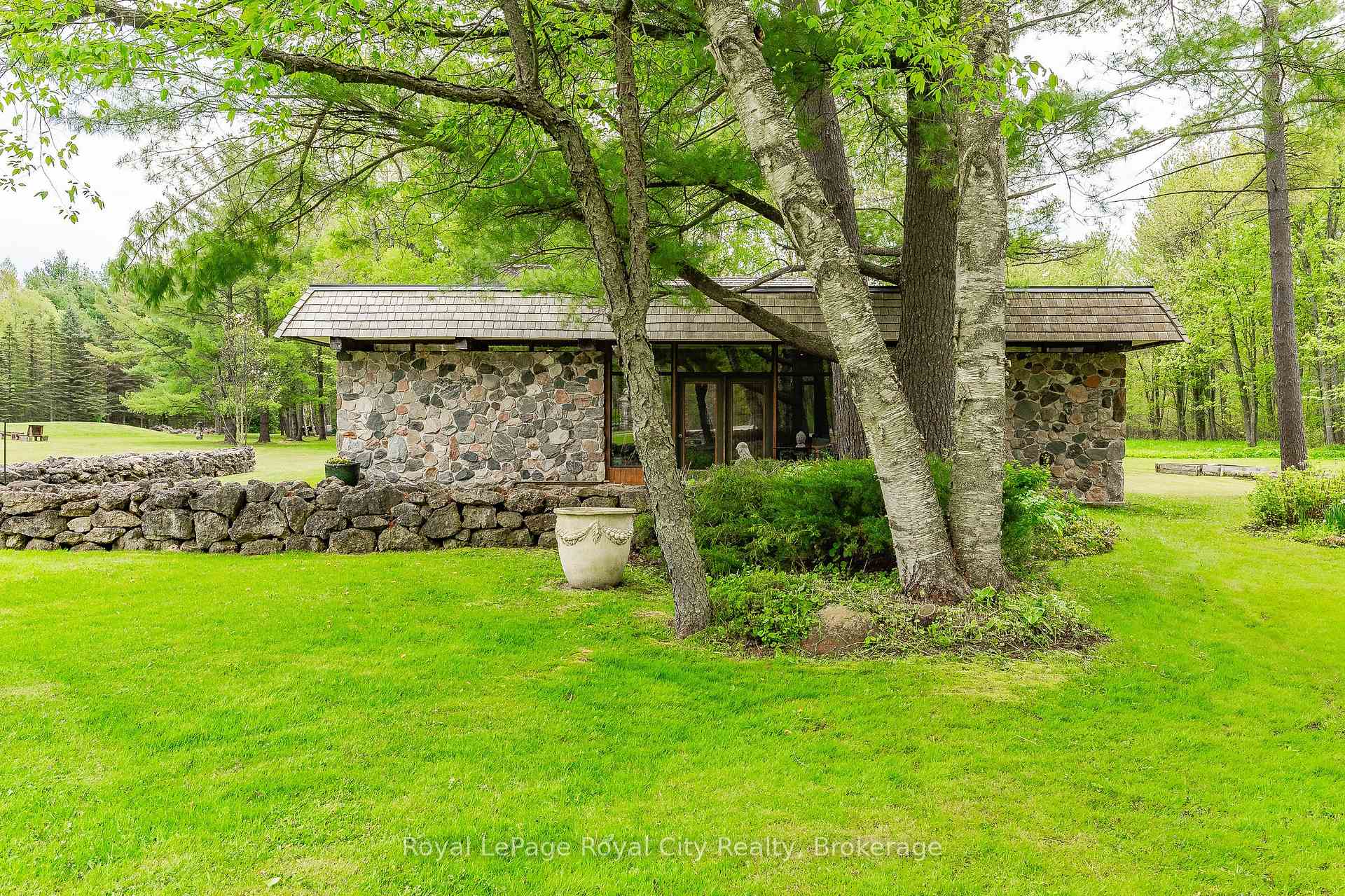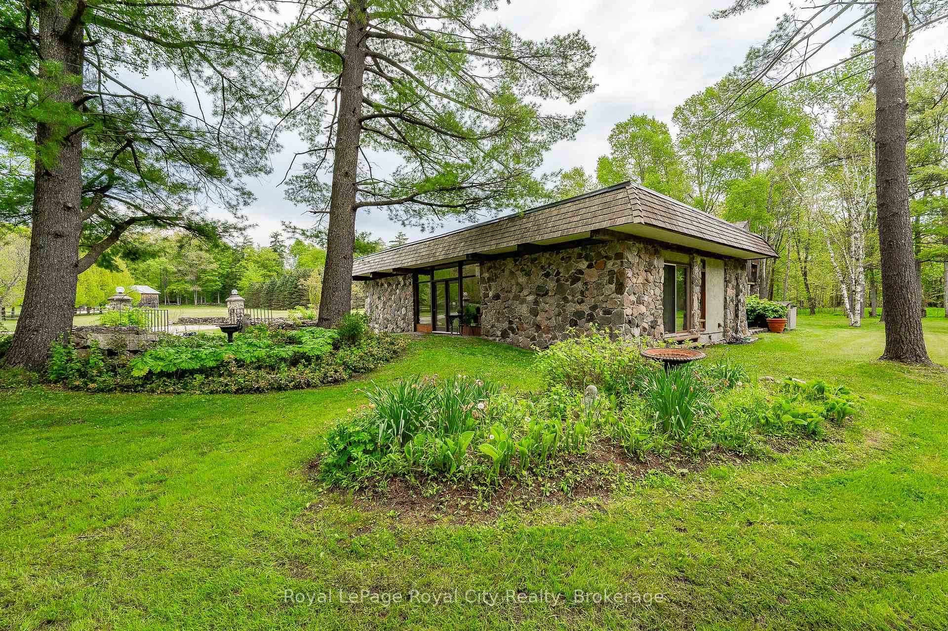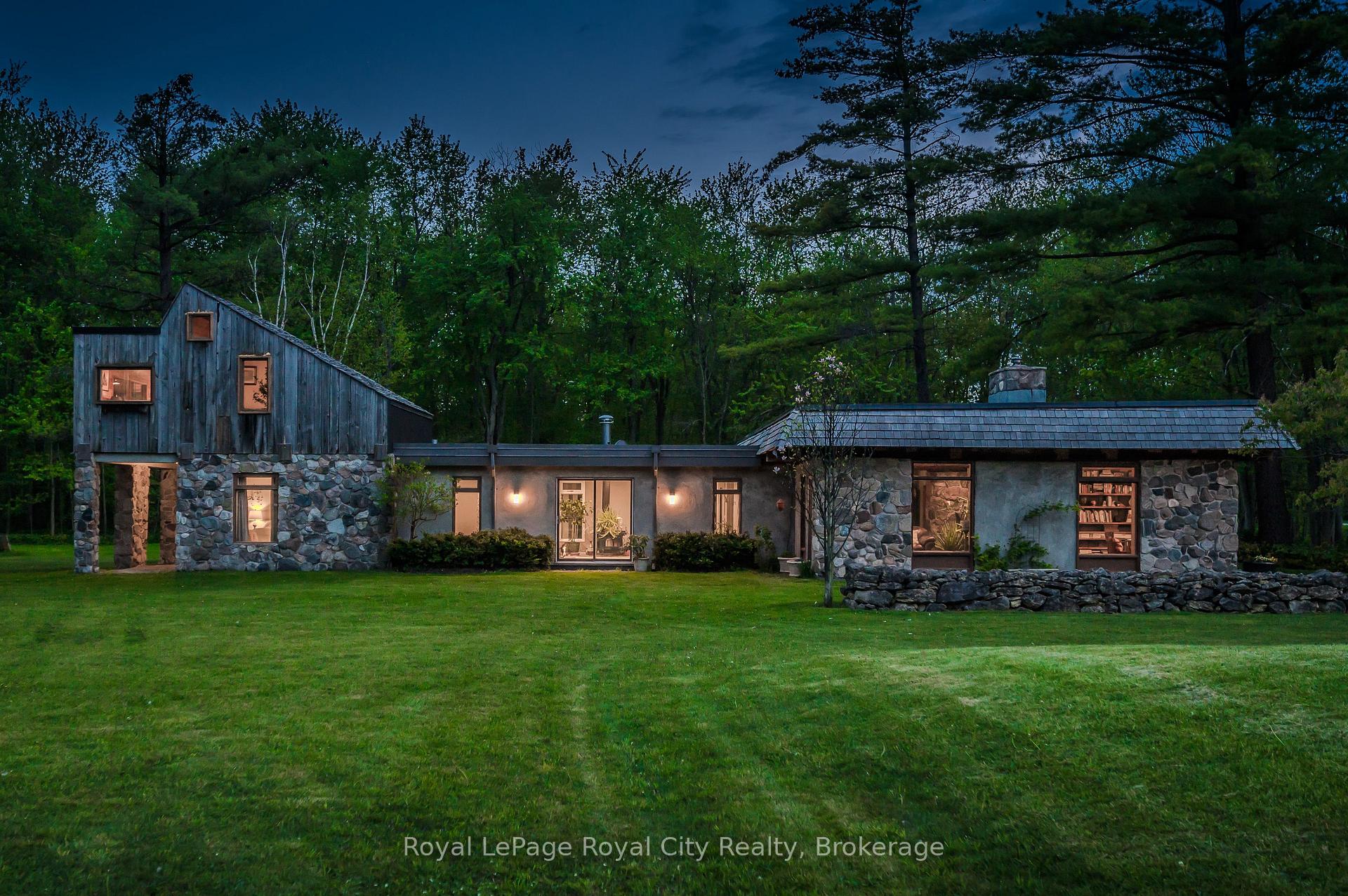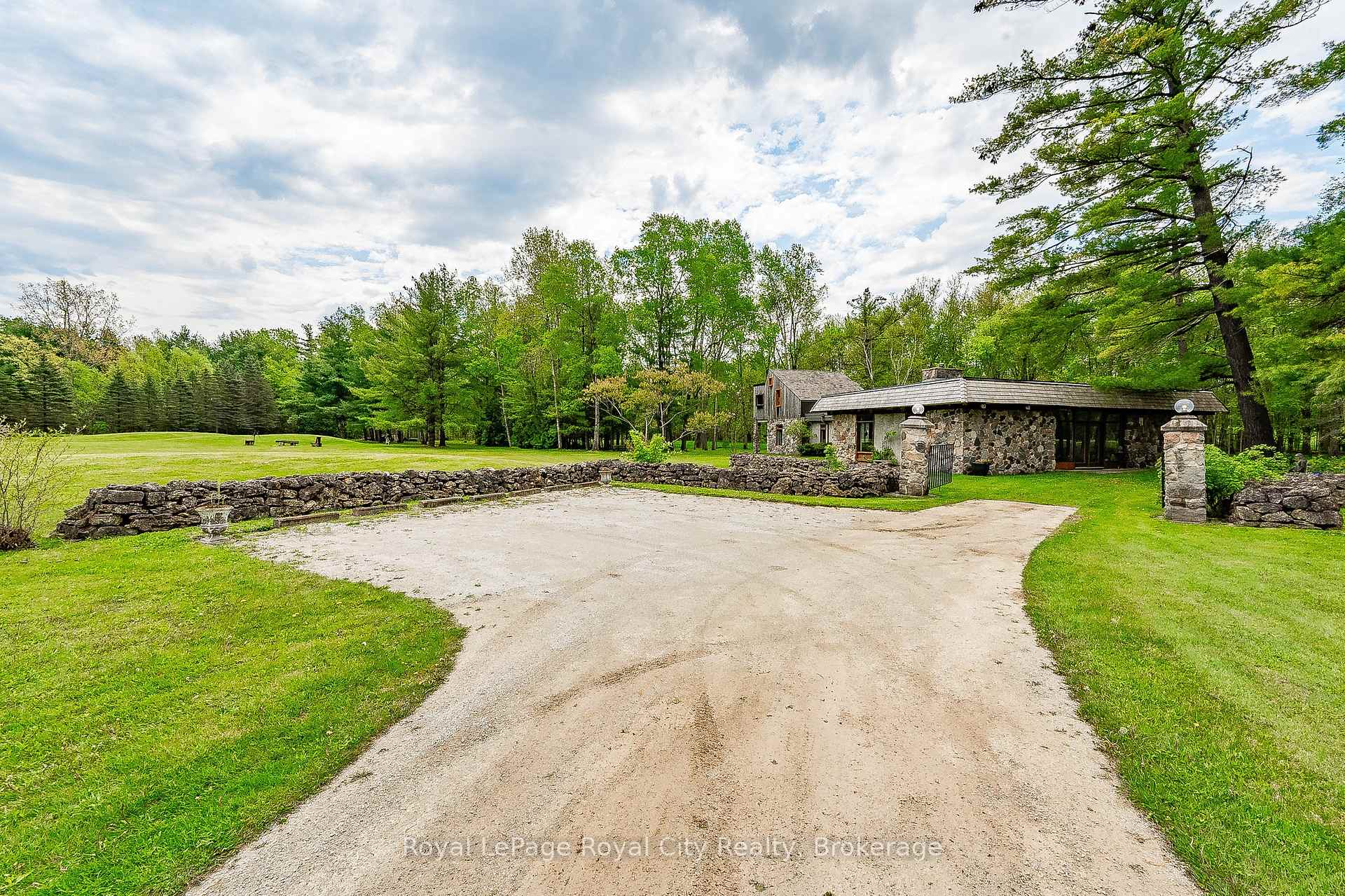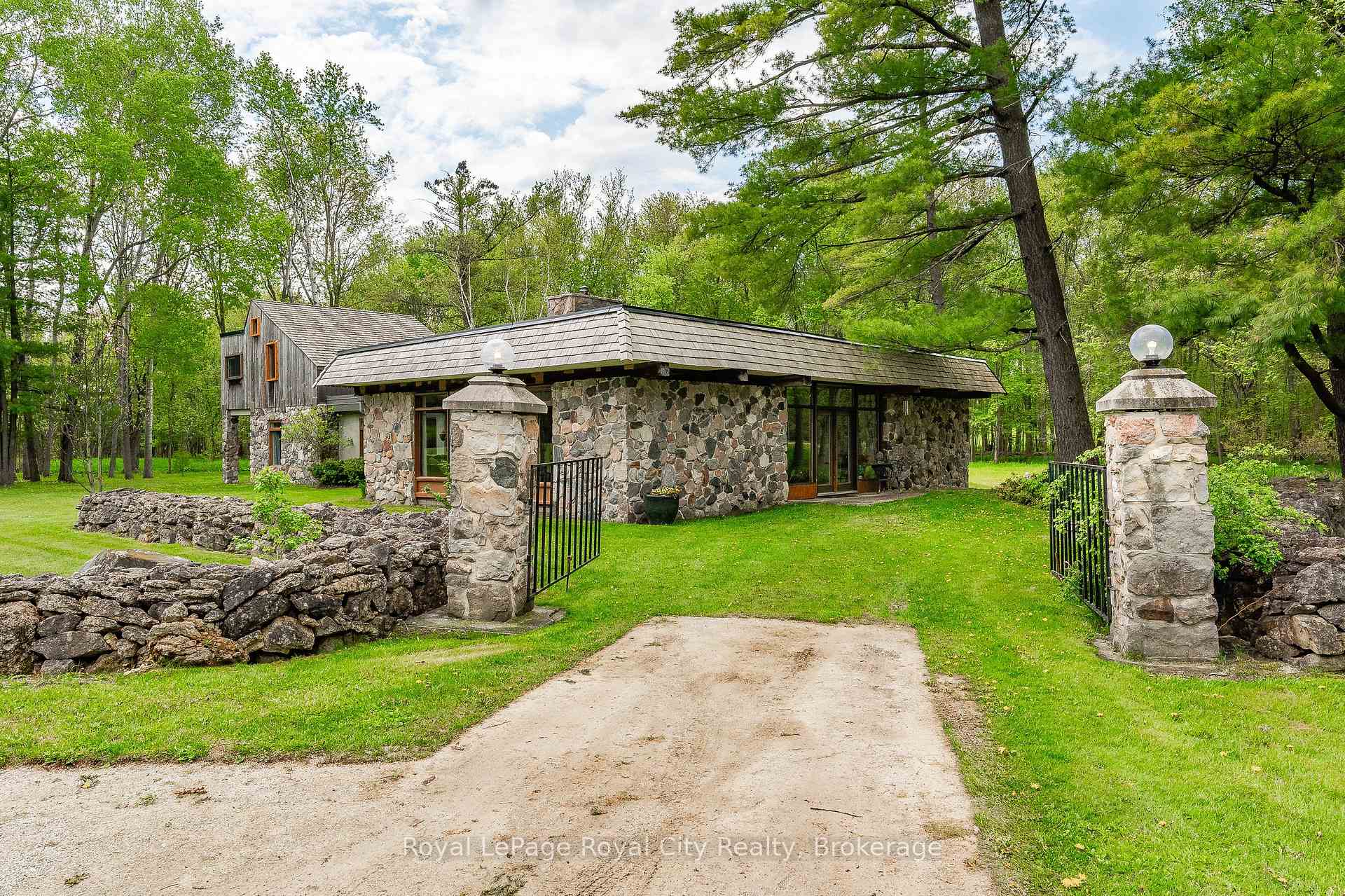 With approximately 1,286 feet of frontage and unmatched curb appeal, Fieldstone Hall is set on 11 breathtaking acres of manicured lawns, open meadows, a scenic woodlot, and a protected naturalized wetland thats home to herons, cranes, and mallards, captivating everyone who passes by. Inspired by the organic architectural style of Frank Lloyd Wright, the 2800 sq.ft.residence is designed to blend seamlessly with its natural surroundings. Built with natural and reclaimed materials, it showcases hand-split fieldstone gathered locally for both interior and exterior walls, reclaimed brick in the kitchens feature walls, and character-rich wood beams and brick floors that highlight the homes custom craftsmanship. Expansive windows and sliding glass doors flood the interiors with natural light while offering sweeping views of the serene landscape. A separate Linden tree-lined driveway leads to a charming two-storey outbuilding with 1,600 sq. ft. of open main-floor space. Complete with its own hydro meter and cobblestone floors, this versatile building is filled with potential, ideal for a studio, workshop, or conversion project. Whether you envision an organic market garden, a horticultural retreat, or a signature estate residence (subject to municipal approvals), this extraordinary property presents a rare opportunity to bring your vision to life. Ideally located just west of the Village of Campbellville and within easy reach of Mountsberg Conservation Area, Crawford Lake, Glen Eden Ski Area, major highways, Aldershot GO Station, Pearson International Airport, and the cities of Oakville, Burlington, Hamilton, Guelph, Kitchener-Waterloo, and the Town of Milton, Fieldstone Hall offers the perfect blend of peace, possibility, and accessibility. Please note: Photos were taken when the property was previously occupied.