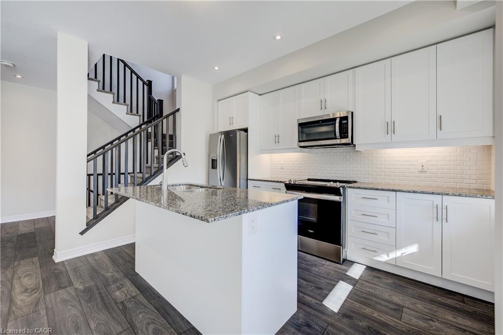STYLISH. SPACIOUS. STEPS FROM IT ALL. Welcome to your next chapter in this modern townhome—#116-10 Birmingham Drive, Cambridge. Tucked into a vibrant and walkable community, this home spans 3 thoughtfully designed levels and offers over 1,350 sq ft of sun-filled living space. From the moment you step inside, you’re greeted by contemporary finishes and a bright, open-concept layout that feels both welcoming and functional. The heart of the home is the main living area—anchored by a sleek kitchen featuring granite countertops, stainless steel appliances, custom 39” upper cabinetry with LED lighting, and a breakfast bar perfect for casual meals or morning coffees. The adjoining family room flows effortlessly to a private, covered terrace balcony—an ideal spot to relax and unwind. Upstairs, the primary retreat is your private escape, complete with a walk-in closet, private balcony, and upgraded blackout blinds. A second bedroom offers ample space for guests, family, or a home office, while designer carpet and mirrored closets elevate the space. The 4pc bathroom completes this level. The ground level offers bonus flexibility with in-suite laundry and convenient interior access to the garage—plus a second private entrance and your own driveway. With two-car parking (garage + driveway), upgraded pot lights, smart storage, smart exterior lights, 200AMP panel, and custom window treatments throughout, every detail has been carefully curated. Located just minutes from shops, restaurants, parks, schools, and highway access, this move-in-ready home checks every box. Whether you’re a first-time buyer, busy professional, or savvy investor—this is one you don’t want to miss. Photos are Virtually staged.