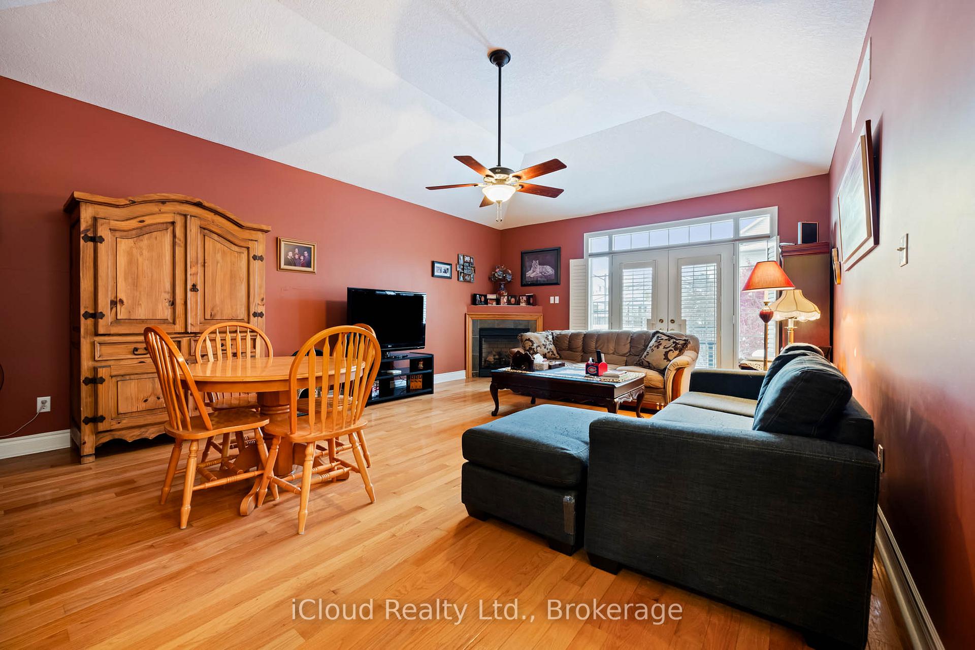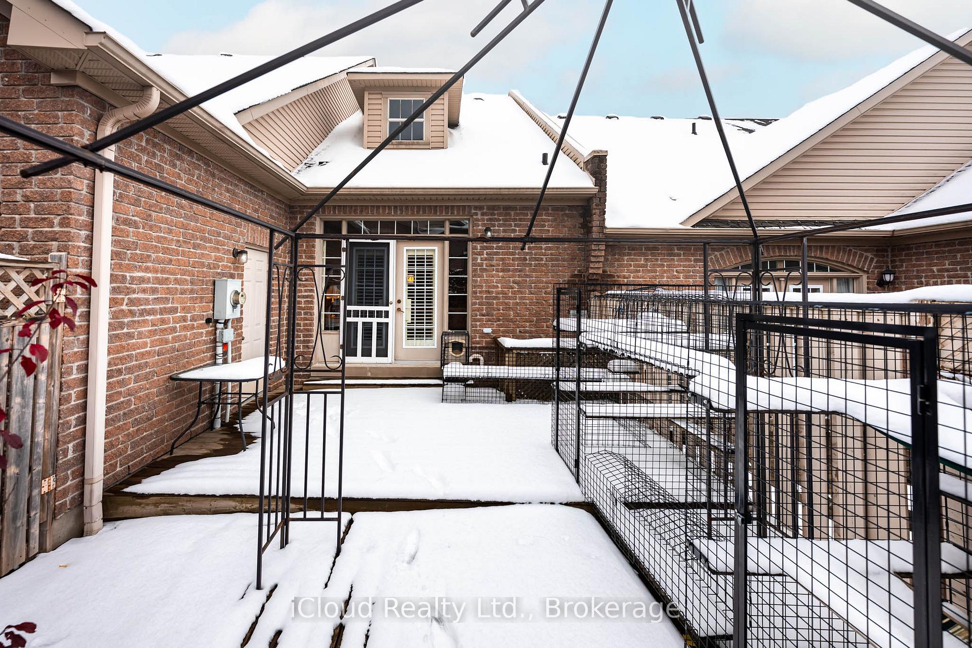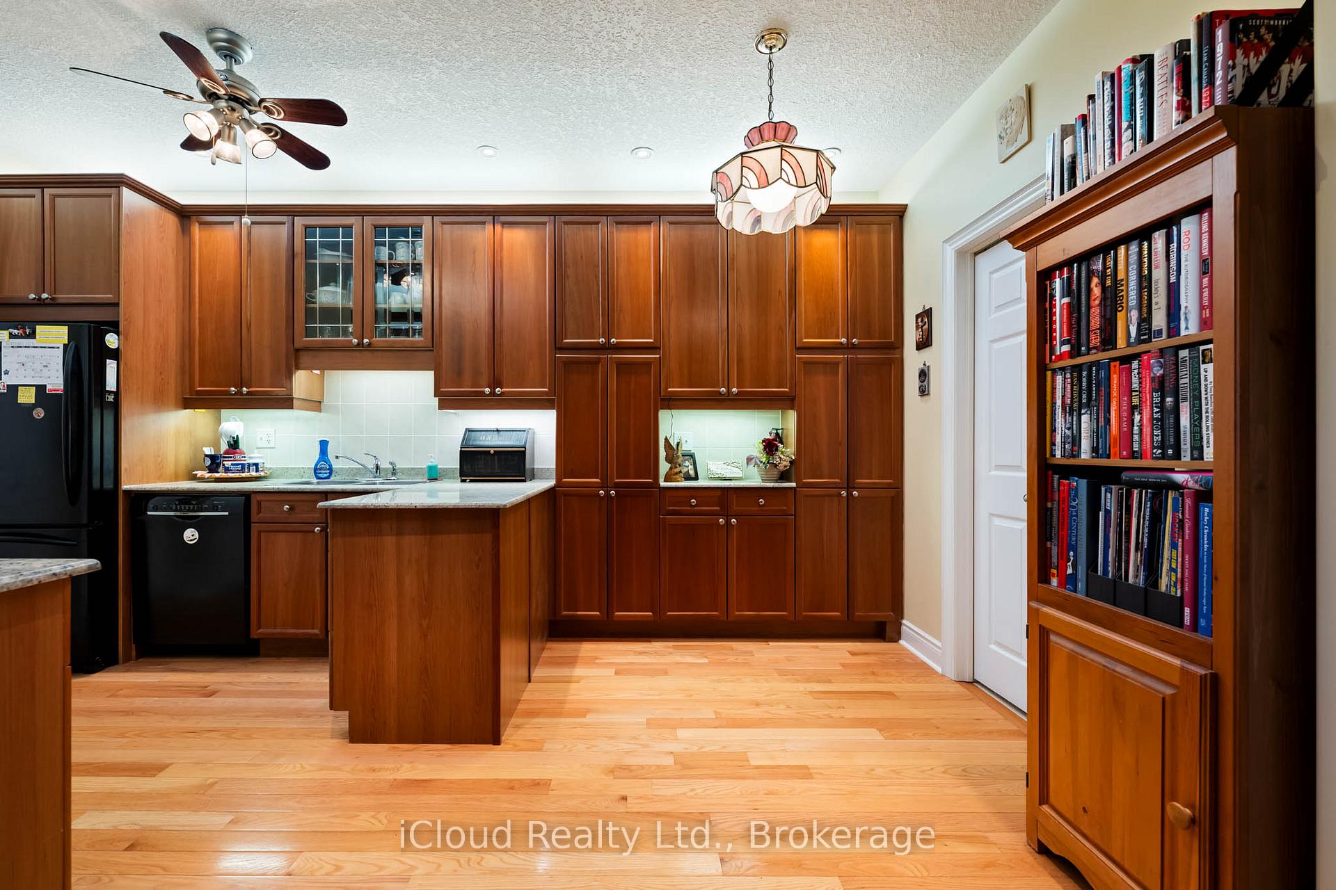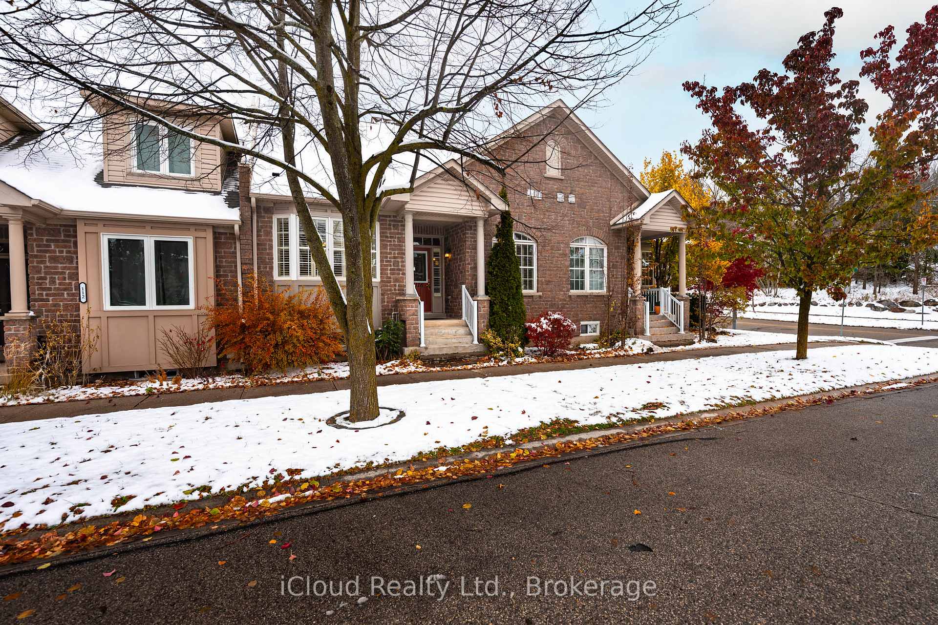 This welcoming BUNGALOW TOWNHOME is located on the outskirts of charming Rockwood. As you enter, the foyer has slate floors, crown molding and the 9′ ceilings carry throughout the entire home. The primary bedroom to the left has a large bay window, 3 piece ensuite with a generous glass shower and a large walk-in closet. Across the hall is the main 3 piece washroom and a bright sunny second bedroom currently used as a home office with a large window, built-in bookshelves and a double door closet. Beautiful hardwood floors carry throughout and all the windows have custom California shutters. The combination living/dining room boasts an impressive vaulted ceiling, corner gas fireplace and garden doors that overlook the private fenced yard. You will not lack storage in the well appointed kitchen with a wall of upgraded cabinetry, pantry, granite countertops and a breakfast area. Pot lights and both under and above cabinet lighting make it an inviting place to prepare meals and entertain. A laundry room with additional cabinets & broom/storage closet is conveniently located off the eat-in area. Access to the rear single car garage is from the kitchen as well as an outside door from the fenced in yard. Animal lovers will appreciate the pet door incorporated into the sidelight on the left side of the garden doors that allow their pet to safely enjoy the outside from the custom pet enclosure. This is a freehold bungalow townhome with a common elements condo corporation fee. Roof (2020) Water Heater (2022) Water Softener (2022) Dishwasher (2022) Sump Pump (2023)