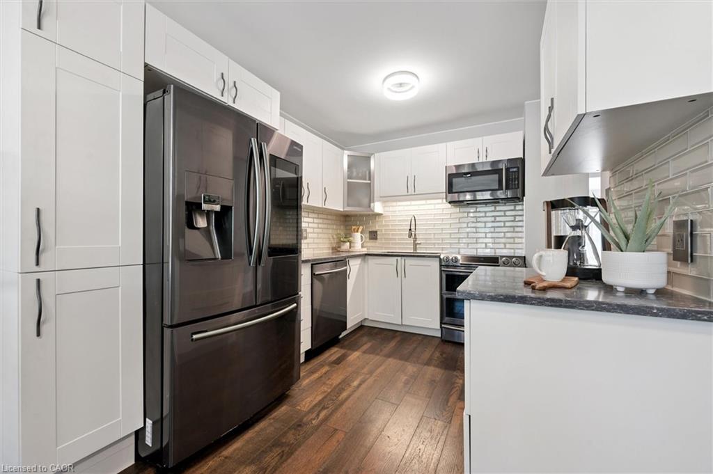 Beautifully renovated 3 bedroom 3 bathroom townhome in a desirable, quiet neighbourhood. Featuring gorgeous hardwood floors throughout, stunning kitchen with granite countertops, modern appliances and backsplash. Spacious living room with slider walkout to a private patio and peaceful backyard. The upper level hosts three well-sized bedrooms including a primary suite with built-in wardrobes, clothes organizers, and a large ensuite bath complete with a walk-in shower. Convenient location just steps from Superstore, public transit, trails, and amenities, with quick and easy access to the expressway.