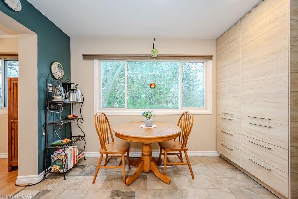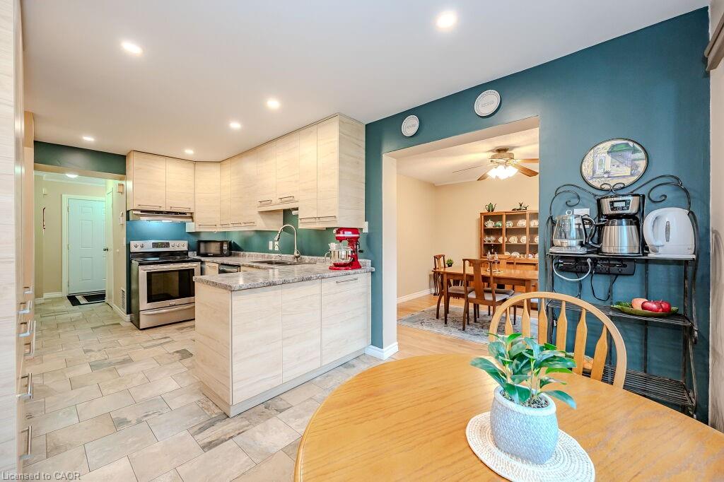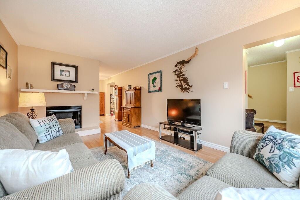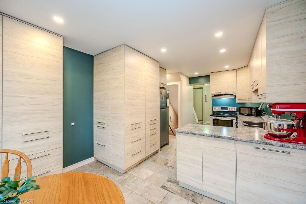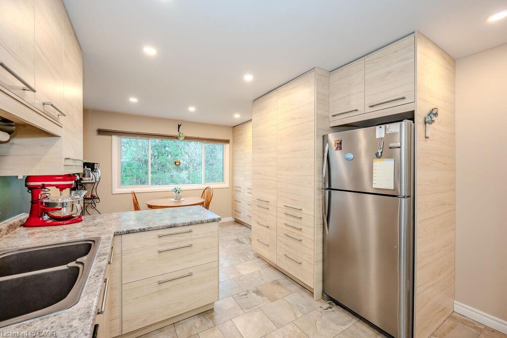 Welcome to maintenance free luxury living at Village on the Green. This spectacular home is almost 2100 sq/ft of above grade living space, backing onto lush greenery and Schneiders Creek. This unit enjoys one of the rare views of the spectacular property. It boasts a one of a kind gourmet kitchen that was custom designed and on point with detail and functionality. You could create the most amazing meals here with ease, you will be in awe when you enter this room. R/O water. There is also a formal dining room and spacious living room on this level. When you enter on the ground level you will find the laundry room and the family room walks out to an updated partially fenced private patio. The mature trees create a serene canopy for your enjoyment. The bedroom level is complete with 3 great sized bedrooms and two full bathrooms. The primary bedroom features a walk-in closet and a gorgeous updated ensuite. This complex has so much to offer, an outdoor heated swimming pool, shopping, close to the 401, Conestoga College, walking trails, golf course. The condo fees include ground level snow removal, roof, doors, windows, guest parking, water. Just move in, relax and enjoy. Home ownership without the worries or exterior maintenance.