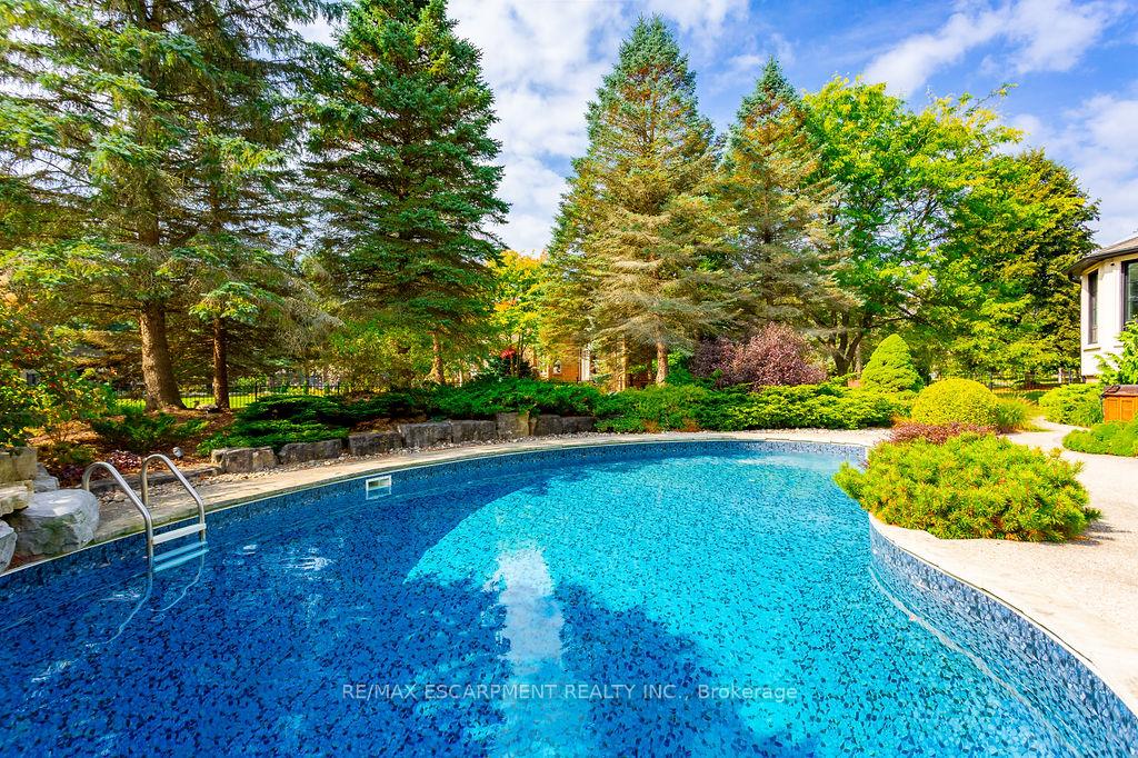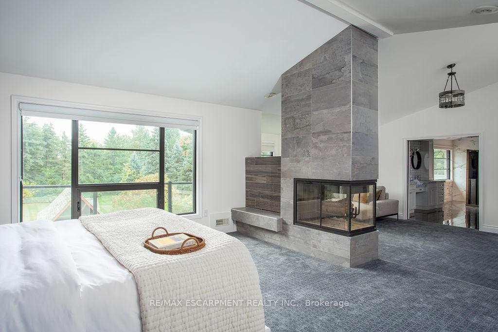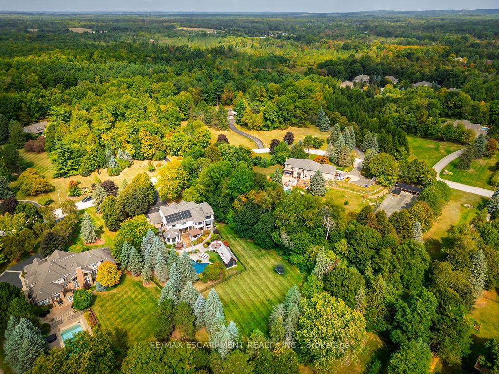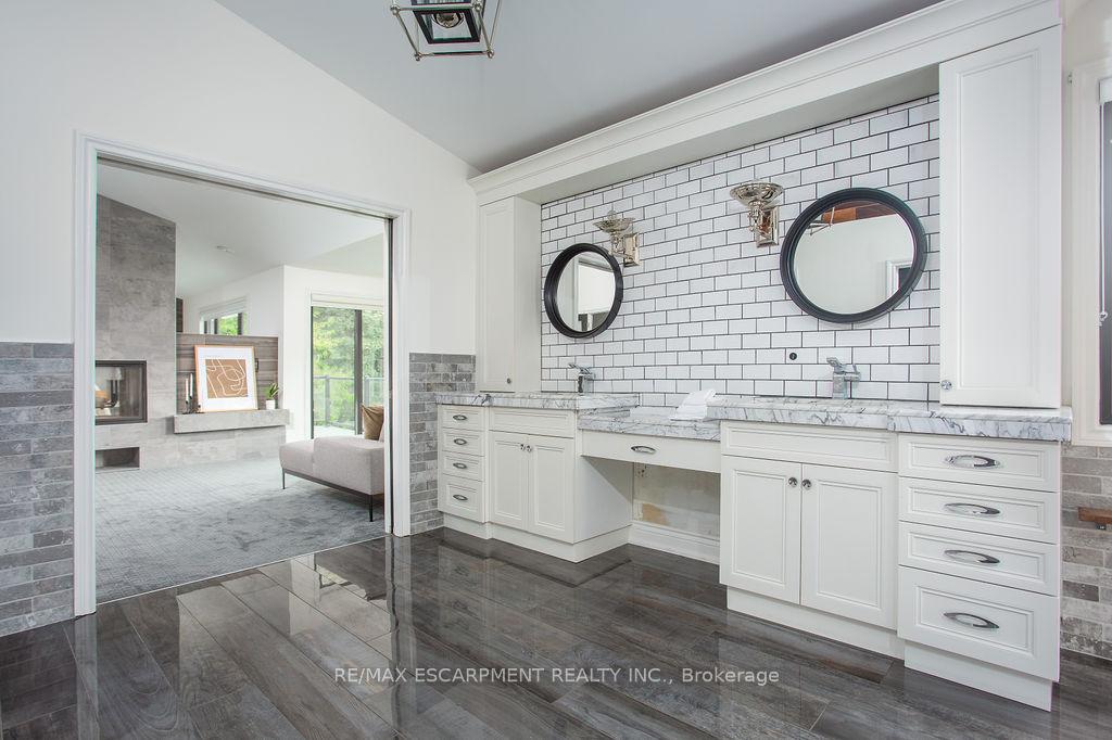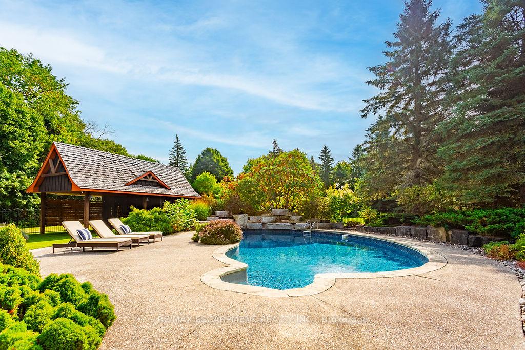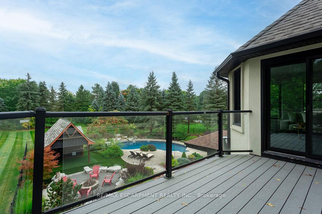 Set on a prestigious estate street, this one-of-a-kind residence captures the essence of Carlisle living. Soaring 22-foot foyer introduces over 5,400 sq ft above grade, plus an additional 2,900 sq ft on the lower level. The main floor offers a sunken oak-panelled office, expansive living room with 19-foot vaulted ceilings, and a formal dining room overlooking the backyard. Chefs kitchen features solid wood dovetailed cabinetry with soft-close finishes, marble counters, professional-grade appliances, a walk-in pantry, and a breakfast room. It seamlessly opens to the family room with a wood-burning fireplace, large glass sliders to the back deck, and a wet bar with beverage fridge. A cozy octagonal sunroom invites fresh breezes, while a main flr bedroom with ensuite (or additional office) and a full laundry room with new washer and dryer add convenience. Upstairs, a sweeping staircase leads to the double-door entry of the primary retreat. This elevated suite boasts a seating area, vaulted ceilings, a two-sided wood-burning fireplace, a private balcony, and a spa-like ensuite with heated floors, marble counters, infrared sauna, water closet, walk-in shower with dual rain heads, and a generous walk-in closet. Three additional bedrooms, each with soaring ceilings, share a stylish 4-pce bath. A second staircase connects to the mudroom landing. The newly renovated lower level offers flexible living with a media rm/6th bedrm, gym, 4-piece bath, and a walk-up to the backyard. Outdoors, the south-facing yard is a true entertainers paradise: an IPE refinished deck, stone outdoor kitchen with wood-fired pizza oven, saltwater pool, fire-pit, and a cabana complete with bar, change-room, and storageall surrounded by extensive landscaping. Updates include most windows and doors (2016), dual furnaces and A/C units (2022), and newer appliances (2024). A heated 4-car garage and exceptional curb appeal complete this remarkable property.Carlisle living at its finest. Luxury Certified