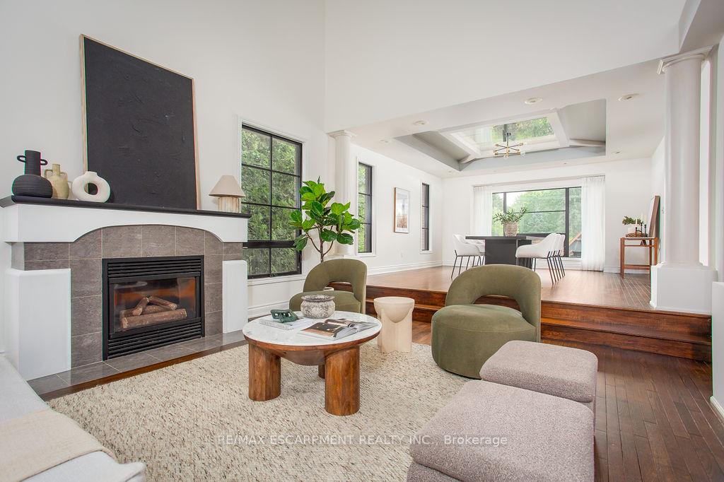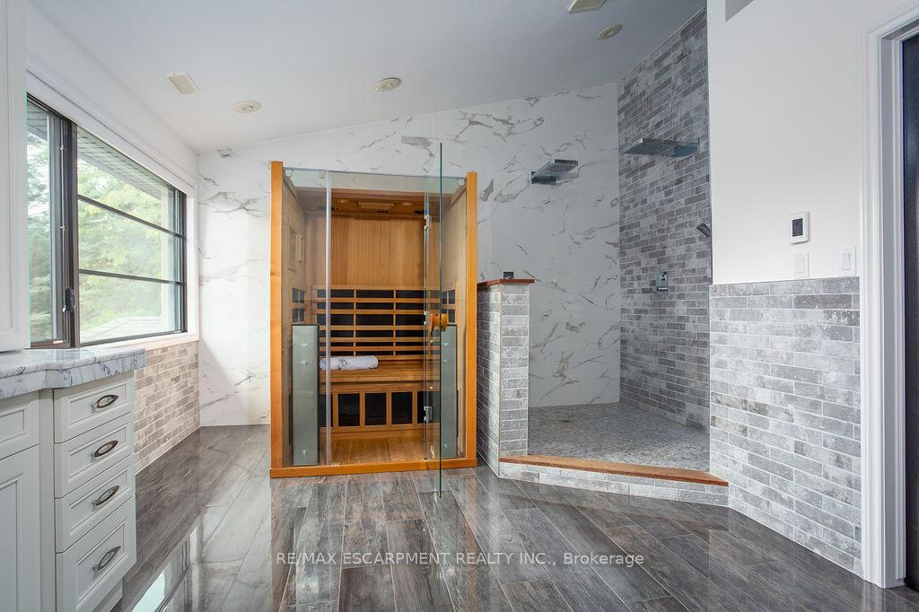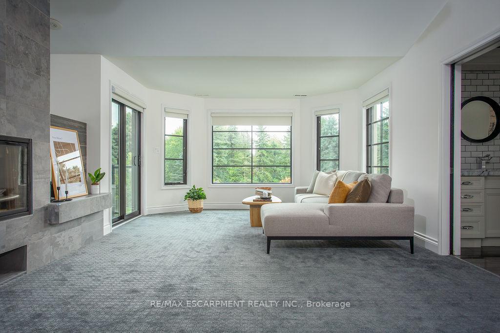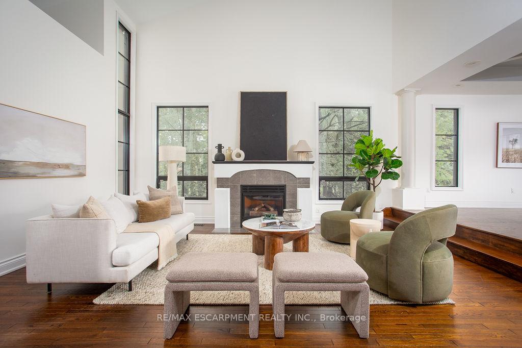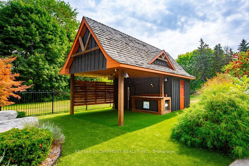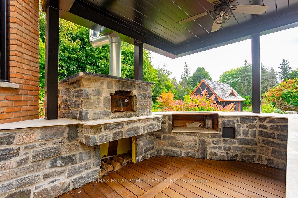 Set on a prestigious estate street, this one-of-a-kind residence captures the essence of Carlisle living. Soaring 22-foot foyer introduces over 5,400 sq ft above grade, plus an additional 2,900 sq ft on the lower level. The main floor offers a sunken oak-panelled office, expansive living room with 19-foot vaulted ceilings, and a formal dining room overlooking the backyard. Chefs kitchen features solid wood dovetailed cabinetry with soft-close finishes, marble counters, professional-grade appliances, a walk-in pantry, and a breakfast room. It seamlessly opens to the family room with a wood-burning fireplace, large glass sliders to the back deck, and a wet bar with beverage fridge. A cozy octagonal sunroom invites fresh breezes, while a main flr bedroom with ensuite (or additional office) and a full laundry room with new washer and dryer add convenience. Upstairs, a sweeping staircase leads to the double-door entry of the primary retreat. This elevated suite boasts a seating area, vaulted ceilings, a two-sided wood-burning fireplace, a private balcony, and a spa-like ensuite with heated floors, marble counters, infrared sauna, water closet, walk-in shower with dual rain heads, and a generous walk-in closet. Three additional bedrooms, each with soaring ceilings, share a stylish 4-pce bath. A second staircase connects to the mudroom landing. The newly renovated lower level offers flexible living with a media rm/6th bedrm, gym, 4-piece bath, and a walk-up to the backyard. Outdoors, the south-facing yard is a true entertainers paradise: an IPE refinished deck, stone outdoor kitchen with wood-fired pizza oven, saltwater pool, fire-pit, and a cabana complete with bar, change-room, and storageall surrounded by extensive landscaping. Updates include most windows and doors (2016), dual furnaces and A/C units (2022), and newer appliances (2024). A heated 4-car garage and exceptional curb appeal complete this remarkable property.Carlisle living at its finest. Luxury Certified