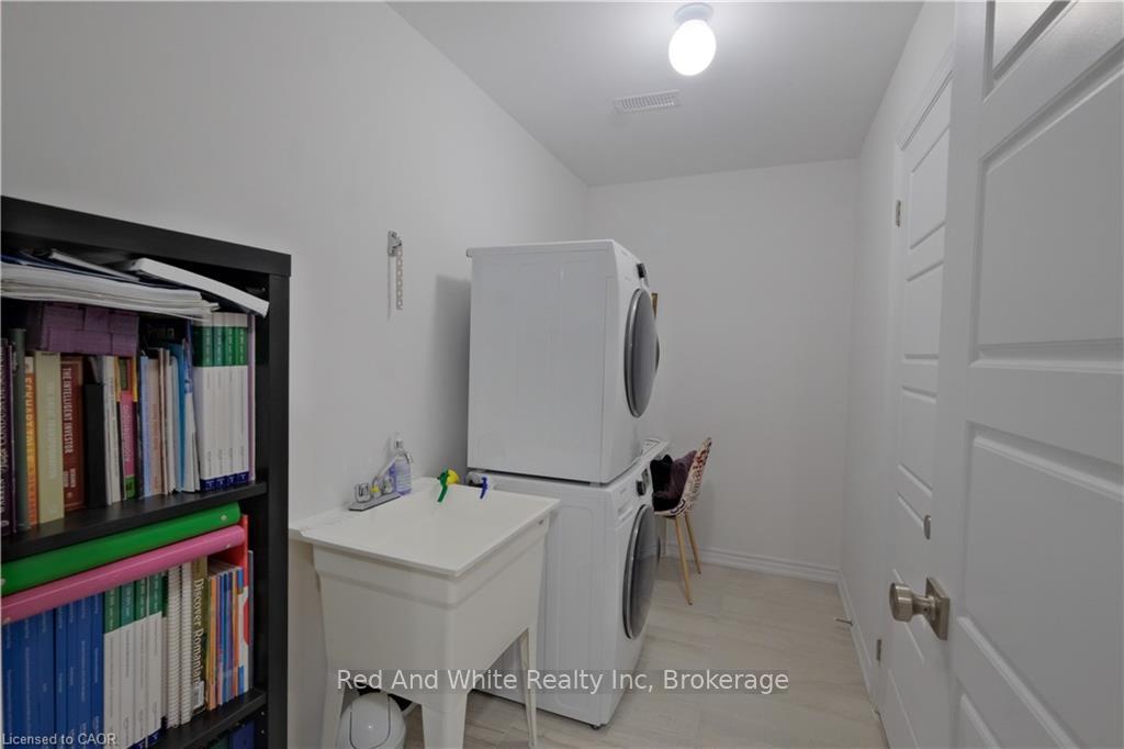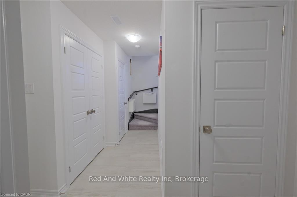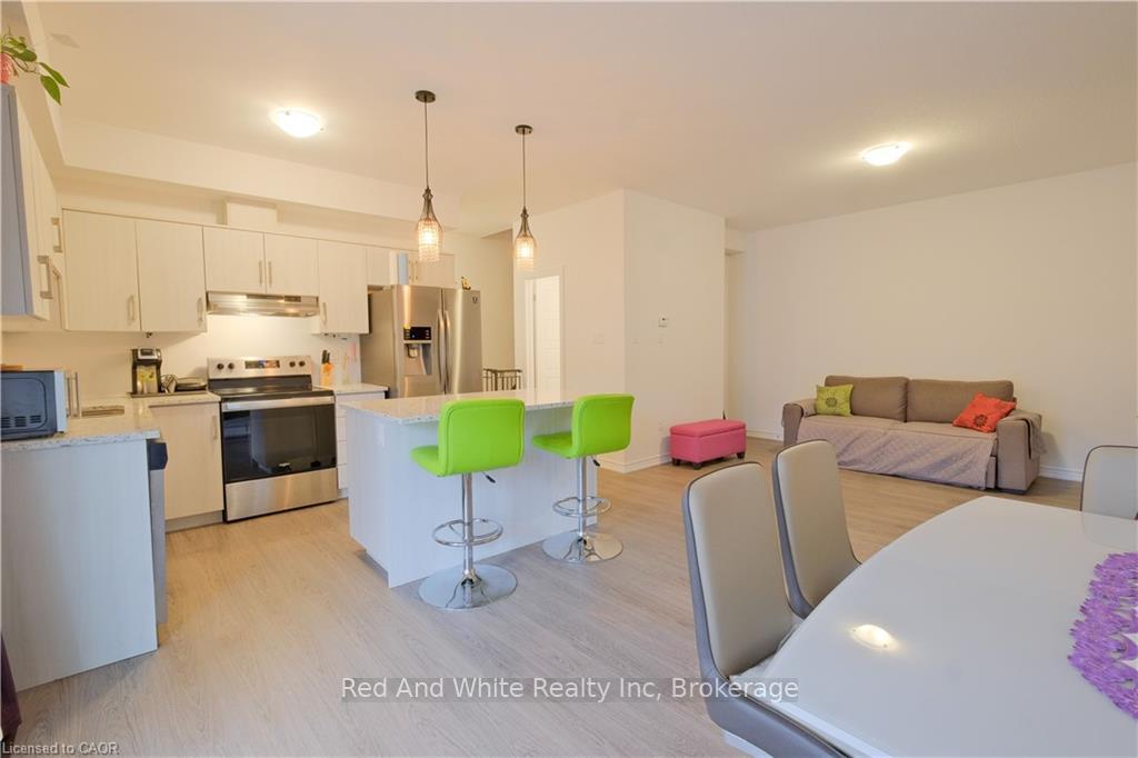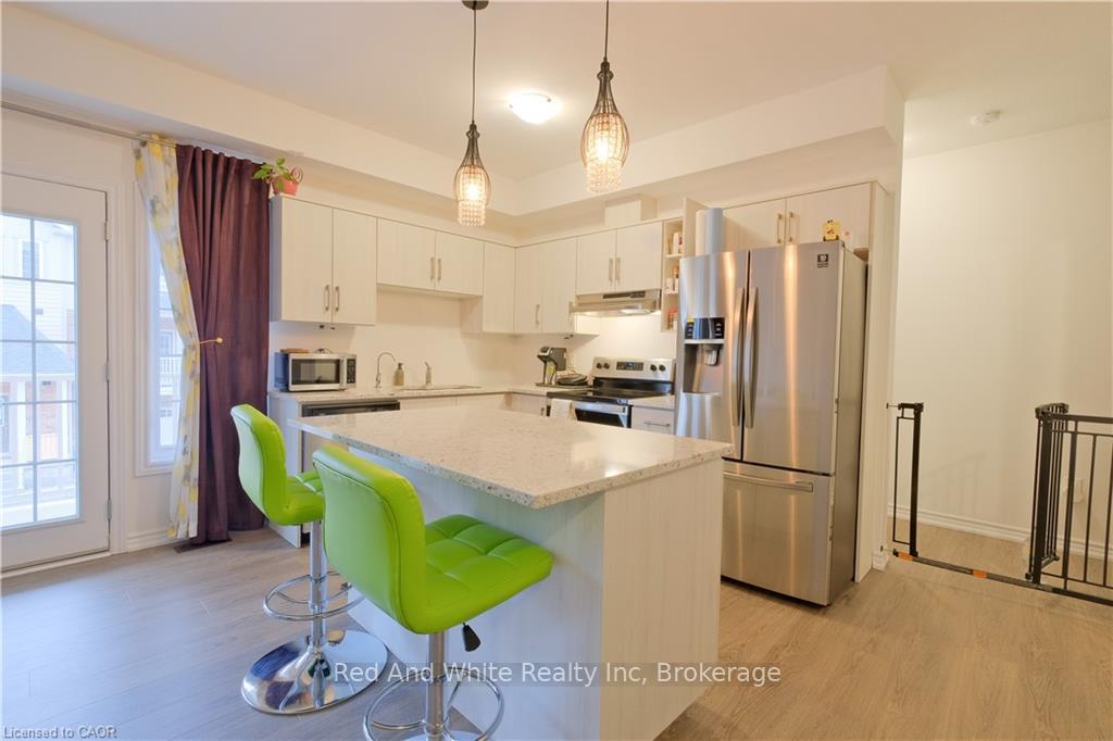 Welcome to this beautifully upgraded, three-storey townhouse located in the desirable Heritage Park neighbourhood of Kitchener. This modern home offers 2 bedrooms, 2 bathrooms, and a one-car garage that has been thoughtfully converted into a fully functional living space, adding exceptional flexibility for today’s lifestyle. The main level features a bright, open-concept layout with 9-foot ceilings and upgraded laminate flooring throughout. The contemporary kitchen is both stylish and functional, showcasing stainless steel appliances, granite countertops, a large island, a beautiful stylish backsplash, and a generous walk-in pantry that can also be used for additional storage. The dining area opens onto a spacious balcony-perfect for morning coffee, outdoor dining, or summer BBQs. A convenient two-piece powder room completes this level. Upstairs, you’ll find two well-appointed bedrooms, each with its own large walk-in closet, along with a modern four-piece main bathroom. The lower level includes a laundry room and a dedicated office setup, ideal for working from home. The converted garage provides a versatile bonus living area that can be used as a playroom, gym, office, or additional family room, and can easily be reverted back to a garage if desired. A move-in-ready home offering style, space, and flexibility in a fantastic location.