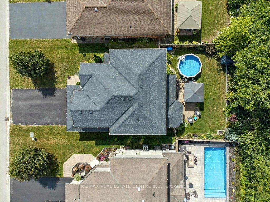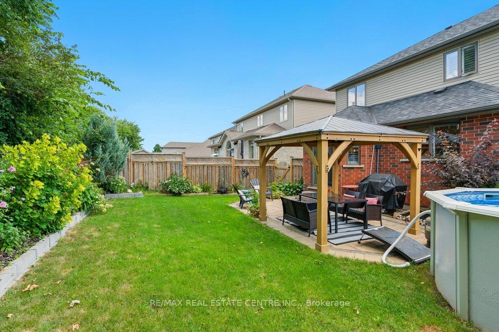 Welcome to this beautiful two-storey detached home set in a sought-after neighborhood, offering the perfect mix of privacy and convenience. Nestled close to a park and backing onto walking trails, surrounded by tall trees and landscaped gardens, this property is a true family retreat. Step inside to a welcoming foyer that opens to a bright, open-concept living and dining room with hardwood floors. The upgraded kitchen features custom cabinetry, newer stainless steel appliances, riverbed granite counters, a raised breakfast bar, and a sunny breakfast area with walkout to the backyard. A cozy family room with fireplace, guest bathroom, and laundry with garage access complete the main floor. Upstairs, the private primary suite includes a fireplace, a massive walk-in closet, and a spa-like ensuite with soaker tub, glass shower, double vanity, and water closet (private toilet room). Three additional bedrooms with ample closets and a full bathroom provide plenty of family space.The fully finished basement adds versatility with a spacious rec room, guest or in-law bedroom, full 3-piece bathroom, plus options for a home office, gym, or extra bedroom.Outdoors, enjoy a double driveway, double garage, and a private backyard retreat with colorful gardens and a gazebo.Located close to Fergus, Guelph, Waterloo/Kitchener, schools, shopping, and major amenities, this home blends comfort, style, and convenience in one exceptional package.