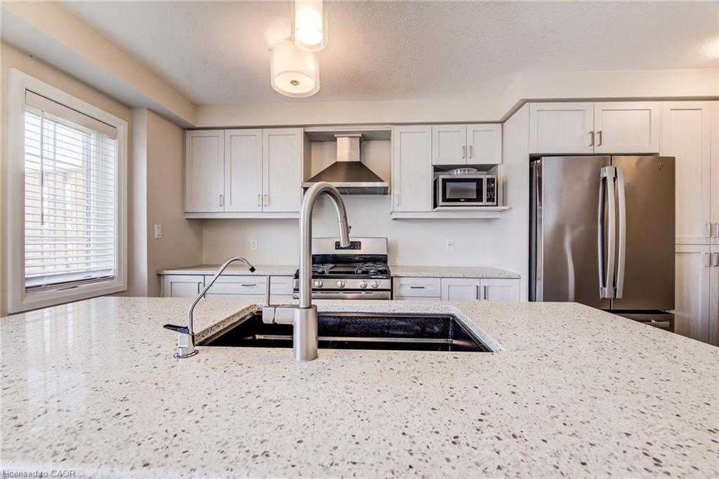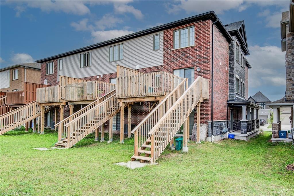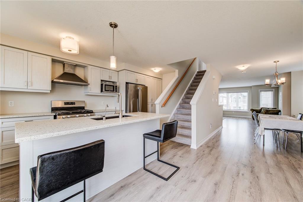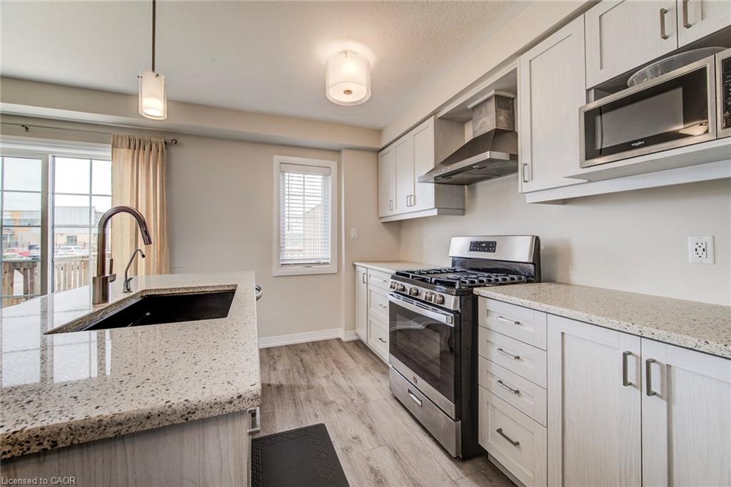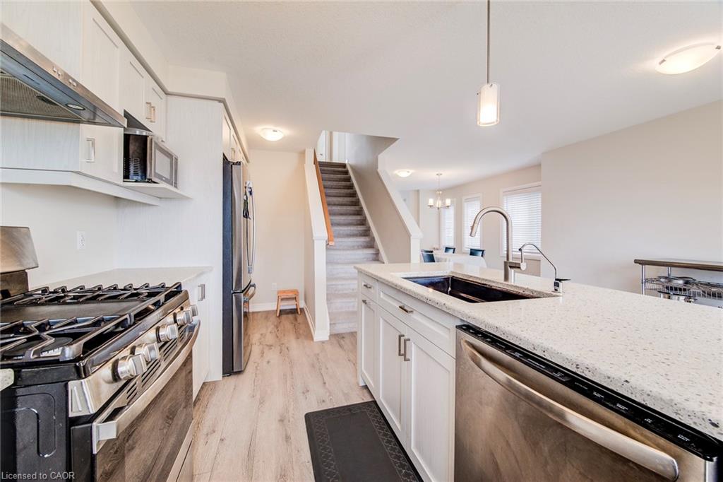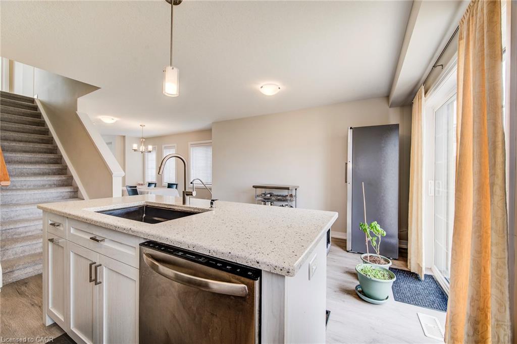 LARGE END UNIT TOWNHOME CLOSE TO 2000SF WITH WALKOUT BASEMENT & 2 CAR GARAGE. Welcome to this beautiful 3 bedroom, 3 bathroom end-unit townhome located in the sought-after Doon South community. This home offers a 2-car garage with a double driveway, providing parking for 4 vehicles. The entry level features a versatile room—perfect as a 4th bedroom, playroom, home office, or extra living space—with a walkout to the backyard, plus laundry and utility room for convenience. The main floor boasts an open-concept layout filled with natural light from the large living room windows. The modern white kitchen offers a pull out trash bin, a deep cabinet pantry, ample cabinet and countertop space, an eat-in island, stainless steel appliances, and a walkout to a deck for outdoor enjoyment. A spacious dining area completes this inviting level. Upstairs, you’ll find a flexible loft-style space ideal for a home office or play area, 3 generous bedrooms, and a full 4-piece bathroom with granite countertops and new faucet. The primary suite includes a walk-in closet and a private 3-piece ensuite which also includes granite countertops and new faucet. Situated in a family-friendly neighborhood, minutes to the 401, close to schools, parks, trails, shopping, this home is the perfect blend of comfort and convenience.