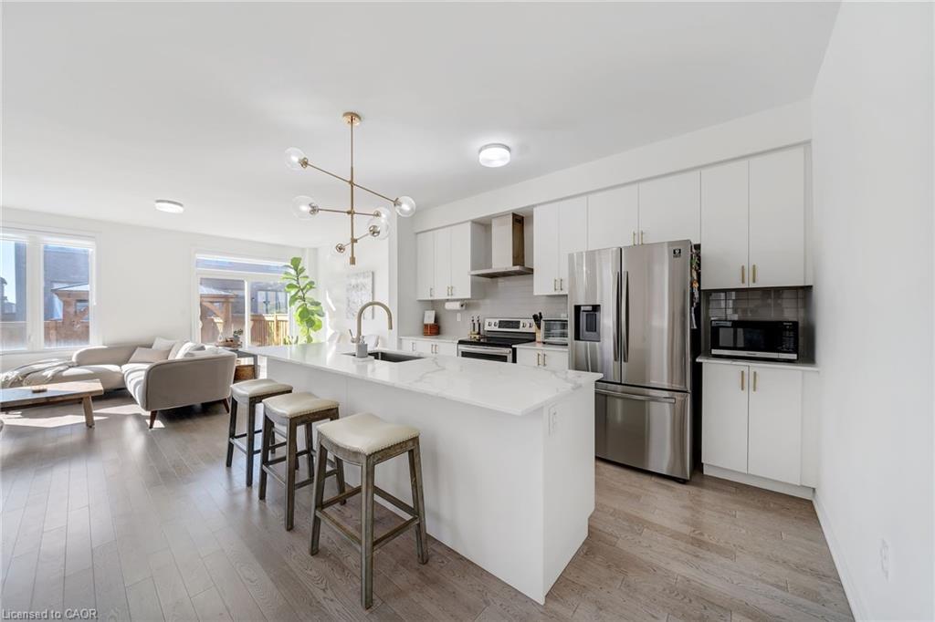 Welcome to 1264 Chee Chee Landing in Milton, a beautifully maintained 3-bedroom, 3.5-bath semi-detached home built by Country Homes offering 2,269 sq. ft. of bright and functional living space. Situated on a quiet, family-friendly side street, this home sits on a fully fenced pie-shaped lot featuring a hardscaped patio and gazebo—perfect for outdoor entertaining. The open-concept main floor boasts 9’ ceilings, a chef-inspired kitchen with an oversized island ideal for gatherings, and a separate dining area overlooking the spacious family room filled with natural light. Upstairs, the primary retreat includes a 4-piece ensuite and walk-in closet,