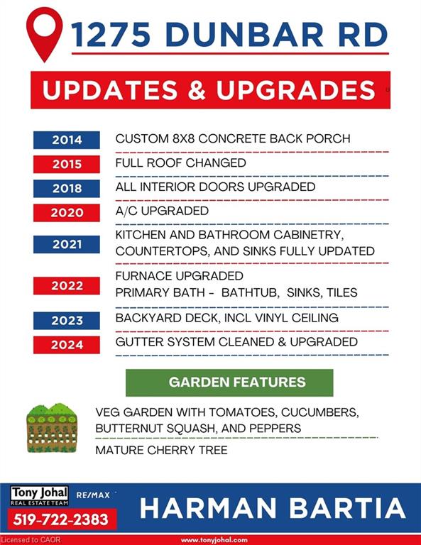 Welcome to 1275 Dunbar Rd, a well-maintained 4-level side split on a spacious CONER LOT in Cambridge, proudly owned by the original owners. This 4-bedroom, 2-bathroom home offers bright, comfortable living with a large, sun-filled living room and a fully fenced backyard perfect for entertaining. Located across from greenspace and down the road from Hespeler and Farm Boy Plaza, it combines privacy with convenience. Key updates include a full roof replacement (2015), interior door upgrades (2018), A/C upgrade (2020), and a fully updated kitchen and bathroom with new cabinetry, countertops, and sinks (2021). The furnace was also upgraded in 2021, with the primary bath refreshed in 2022 and a new backyard deck with vinyl ceiling added in 2023. The gutter system was cleaned and upgraded in 2024. The backyard features a custom 8×8 concrete porch (2014), a vibrant vegetable garden with tomatoes, cucumbers, butternut squash, and peppers, plus a mature cherry tree. A perfect blend of charm, space, and thoughtful upgrades—don’t miss this opportunity!