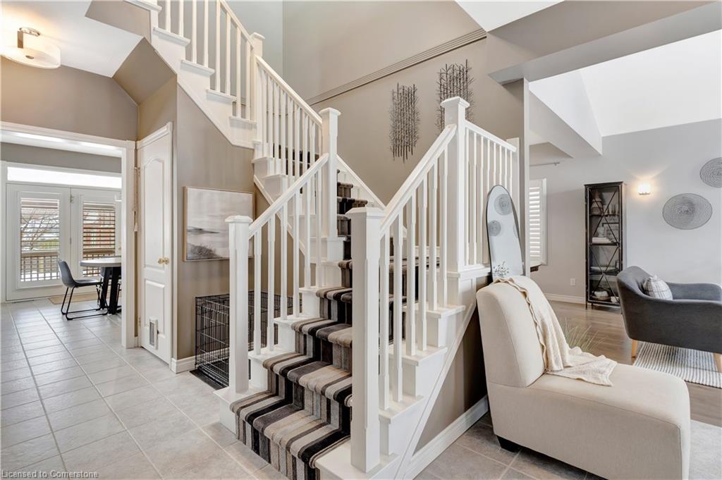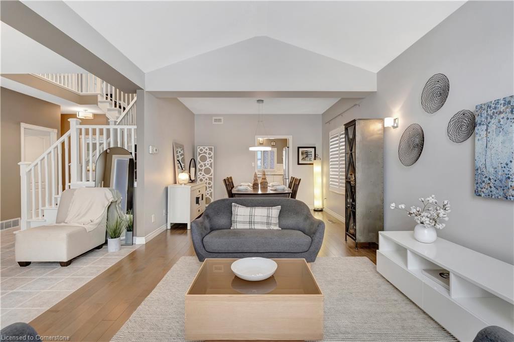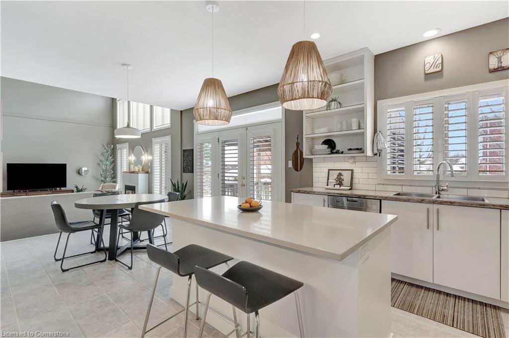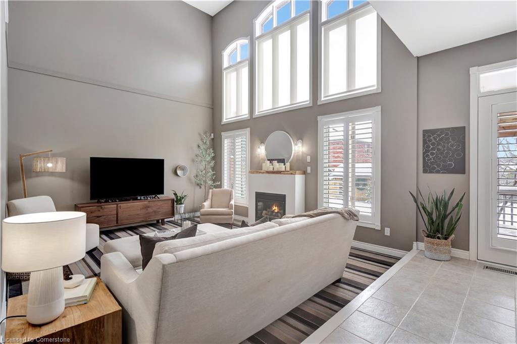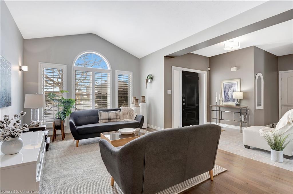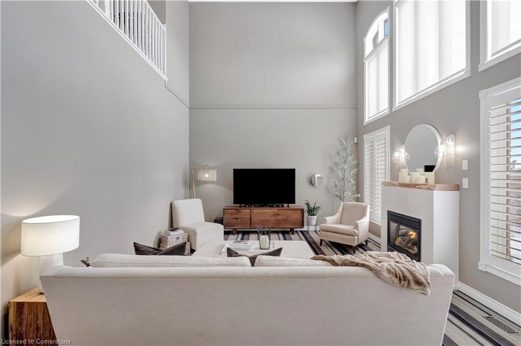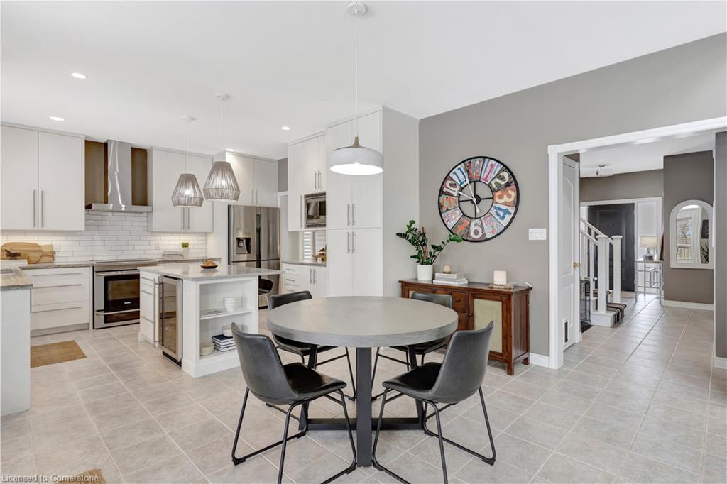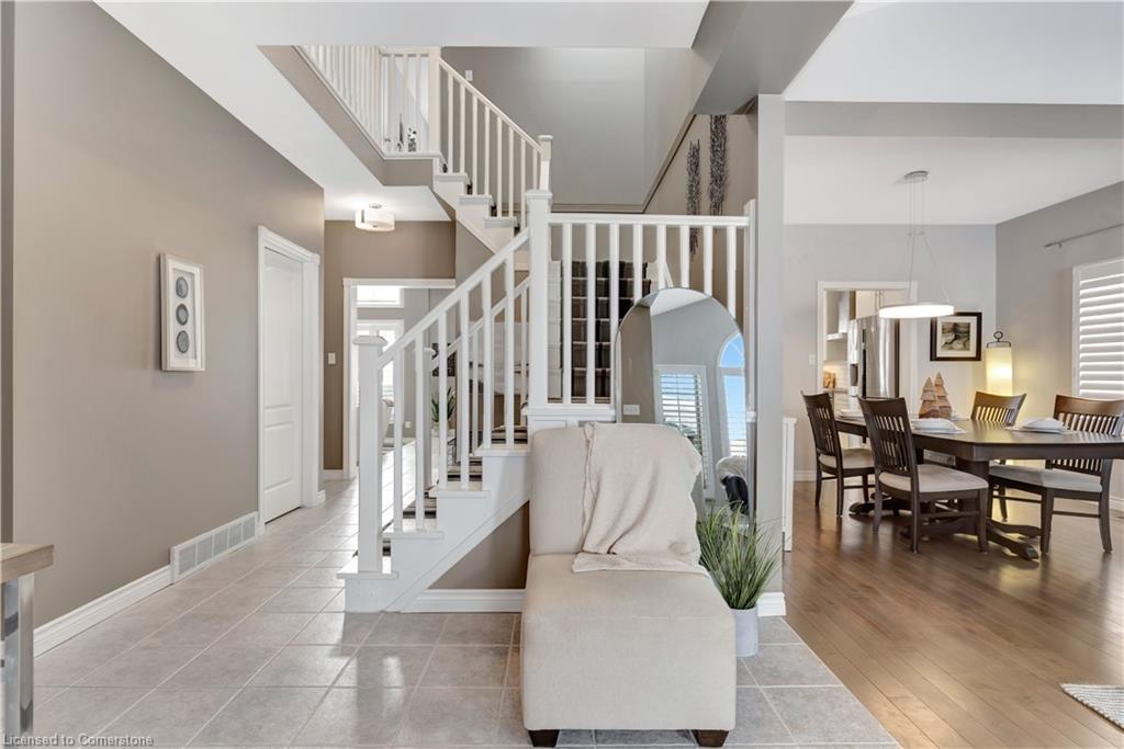 Located the Clemens Mills/Saginaw neighbourhood, this beautifully updated four-bedroom, four-bathroom detached home has a spacious two-car garage, lots of natural light and is perfect for a growing family. Large foyer leading to an open-concept living and formal dining area featuring vaulted ceiling, expansive windows, and hardwood floors. The eat-in kitchen is a chef’s and entertainer’s dream, featuring a large island, stainless steel appliances, and ample cupboard space. The kitchen opens into the family room, with soaring 18 ft ceilings, a gas fireplace, and oversized windows with California shutters. The main floor also offers a large office with hardwood flooring, a powder room and a combined laundry/mudroom with direct access to the garage. A skylight brightens the staircase as you make your way to the second floor, where three generously sized bedrooms provide plenty of space for the whole family. The updated main bathroom features a sleek quartz countertop, while the primary suite has big windows, a spacious walk-in closet, and a luxurious five-piece ensuite, complete with a soaker tub, dual sinks, and a glass shower. The fully finished basement expands the living space with a large recreation room, a fourth bedroom, and a versatile media room or additional office. A three-piece bathroom with a new toilet and fresh vinyl flooring adds to the functionality of the space, while a sizable utility room and extra storage under the stairs ensure there’s plenty of room for storage. Outside, the fully fenced backyard is an ideal space for entertaining, children, and pets. A well-maintained deck and patio offer plenty of room to relax, while the front yard is enhanced by an irrigation system for easy upkeep. This home is perfectly situated near top-rated schools, parks, and shopping, with easy access to the 401 for commuters. Outdoor enthusiasts will love being just minutes from Shade’s Mills Conservation Area, where hiking trails, kayaking, and picnicking await!