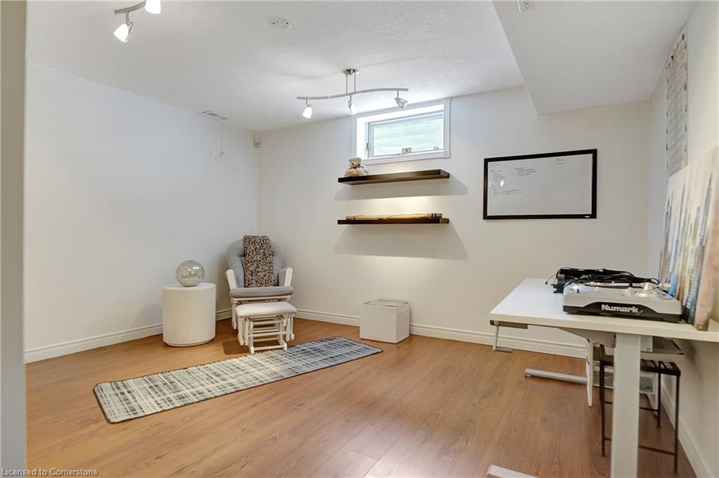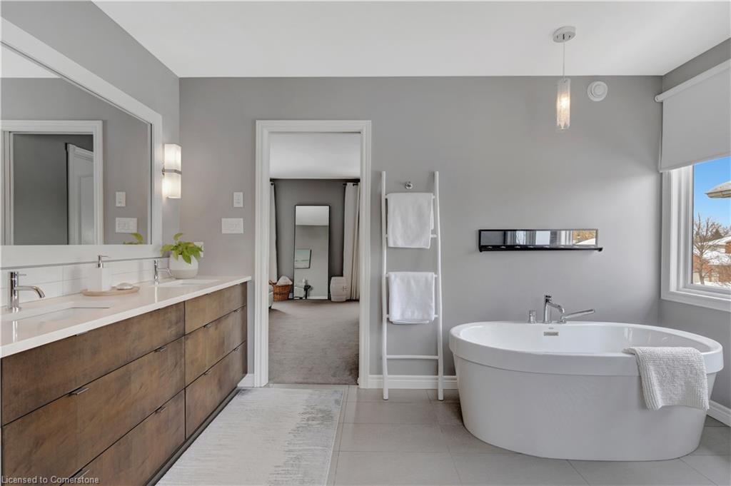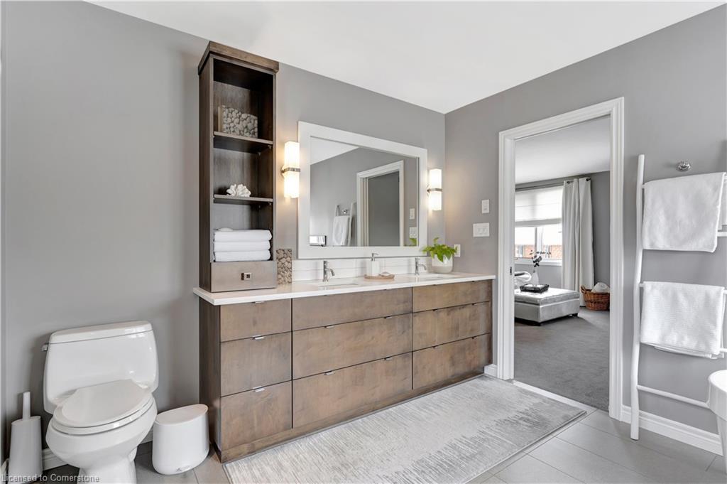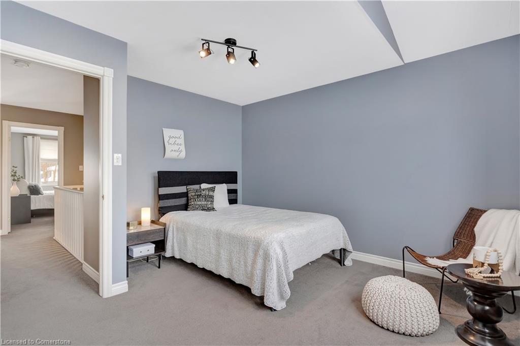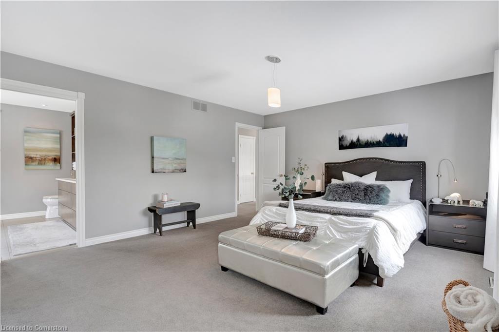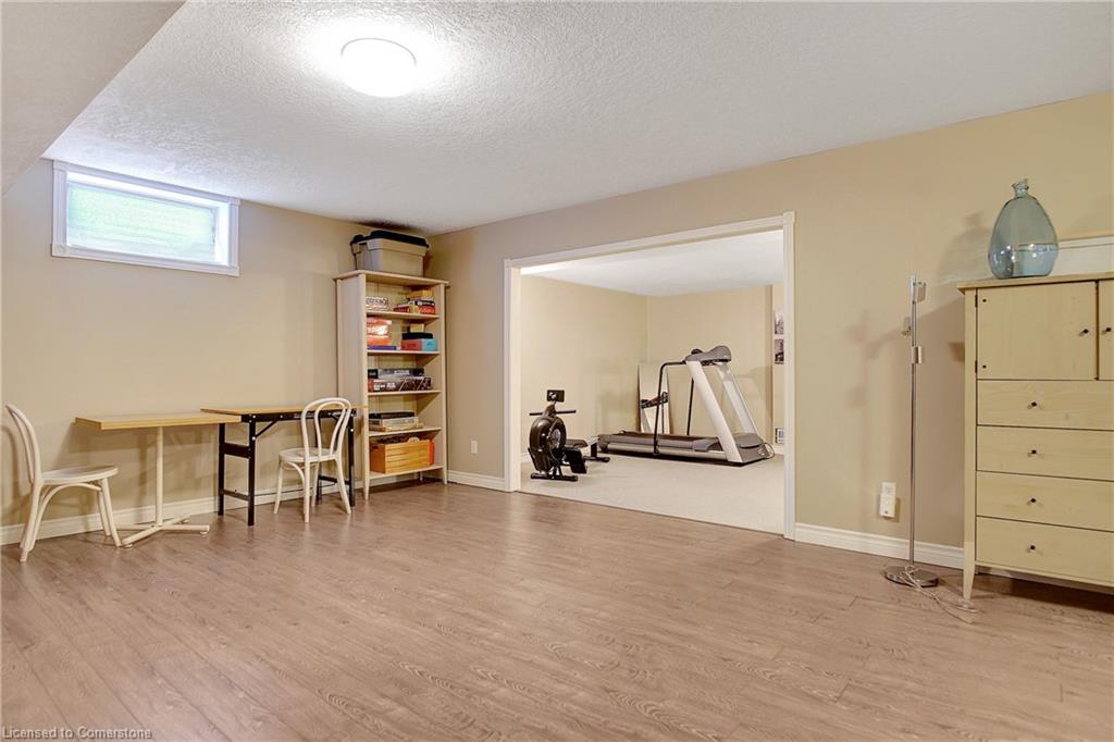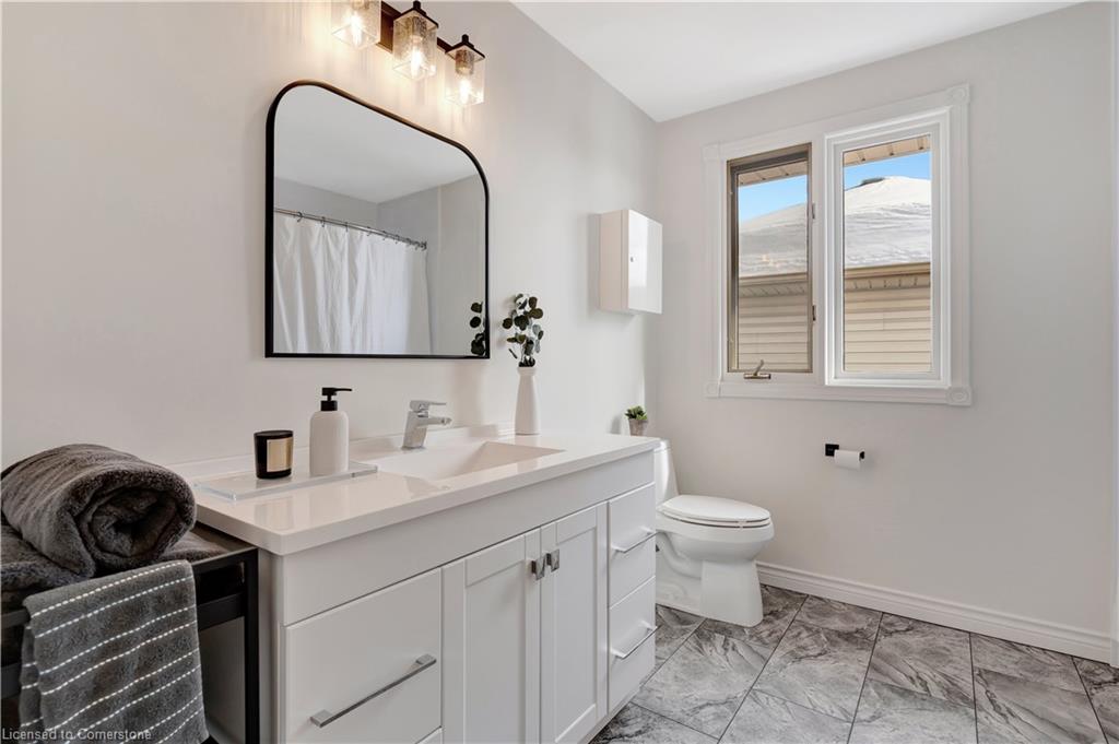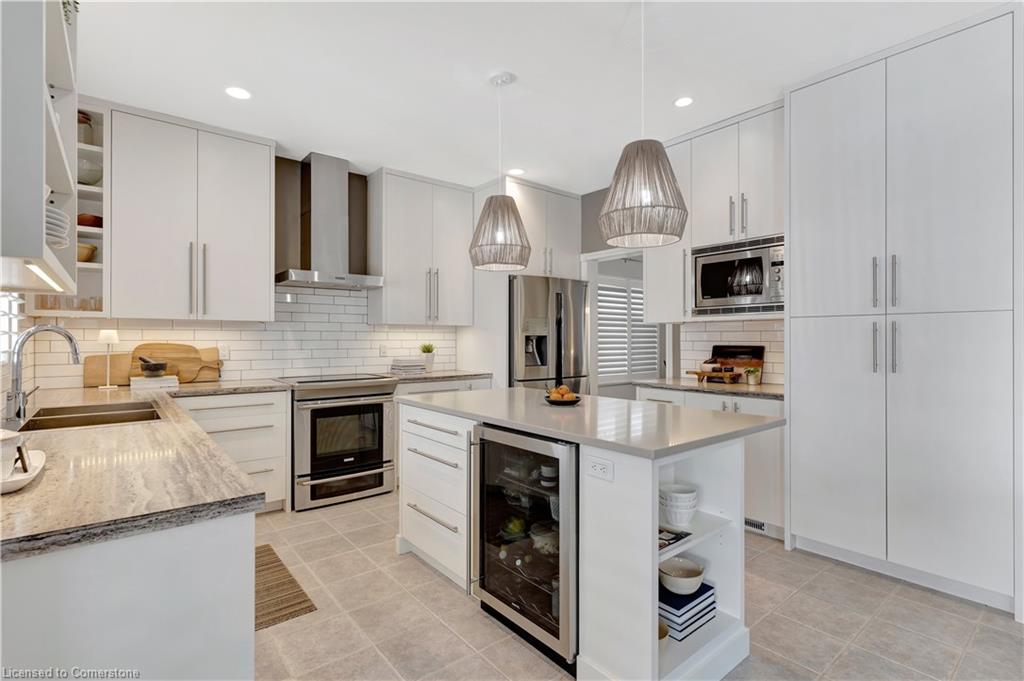 Located the Clemens Mills/Saginaw neighbourhood, this beautifully updated four-bedroom, four-bathroom detached home has a spacious two-car garage, lots of natural light and is perfect for a growing family. Large foyer leading to an open-concept living and formal dining area featuring vaulted ceiling, expansive windows, and hardwood floors. The eat-in kitchen is a chef’s and entertainer’s dream, featuring a large island, stainless steel appliances, and ample cupboard space. The kitchen opens into the family room, with soaring 18 ft ceilings, a gas fireplace, and oversized windows with California shutters. The main floor also offers a large office with hardwood flooring, a powder room and a combined laundry/mudroom with direct access to the garage. A skylight brightens the staircase as you make your way to the second floor, where three generously sized bedrooms provide plenty of space for the whole family. The updated main bathroom features a sleek quartz countertop, while the primary suite has big windows, a spacious walk-in closet, and a luxurious five-piece ensuite, complete with a soaker tub, dual sinks, and a glass shower. The fully finished basement expands the living space with a large recreation room, a fourth bedroom, and a versatile media room or additional office. A three-piece bathroom with a new toilet and fresh vinyl flooring adds to the functionality of the space, while a sizable utility room and extra storage under the stairs ensure there’s plenty of room for storage. Outside, the fully fenced backyard is an ideal space for entertaining, children, and pets. A well-maintained deck and patio offer plenty of room to relax, while the front yard is enhanced by an irrigation system for easy upkeep. This home is perfectly situated near top-rated schools, parks, and shopping, with easy access to the 401 for commuters. Outdoor enthusiasts will love being just minutes from Shade’s Mills Conservation Area, where hiking trails, kayaking, and picnicking await!