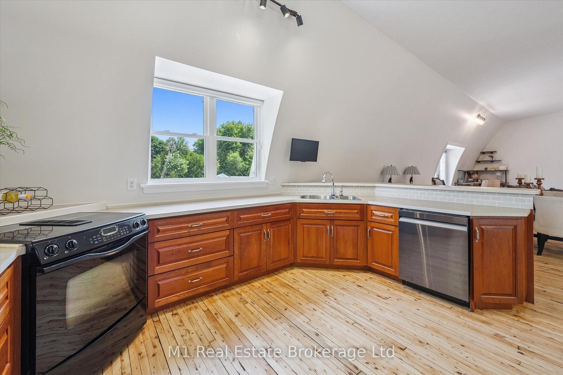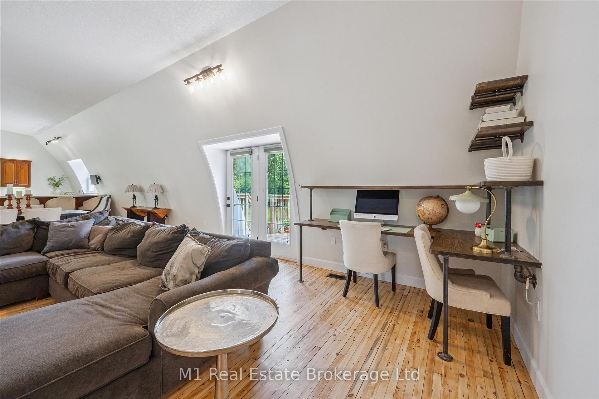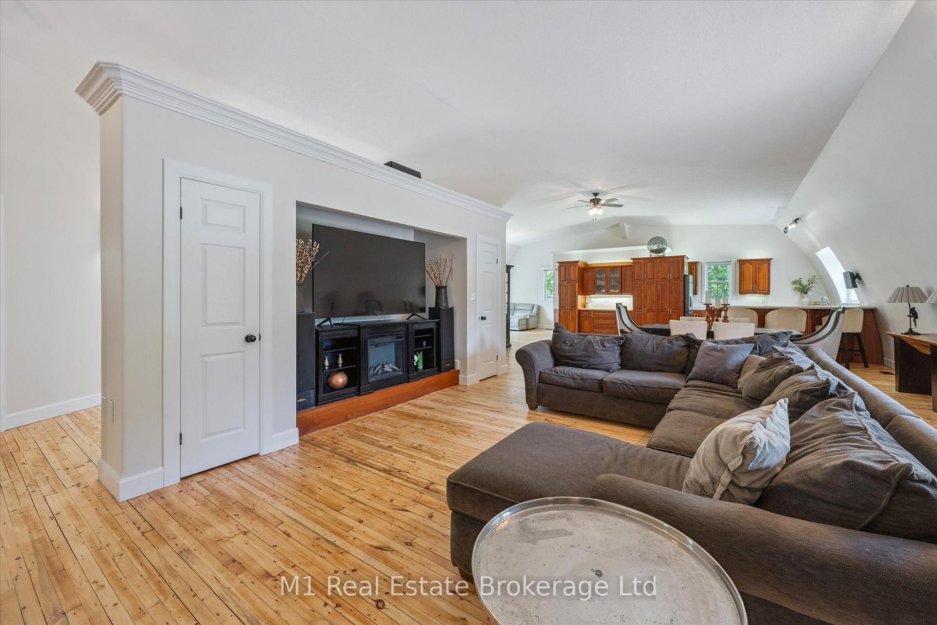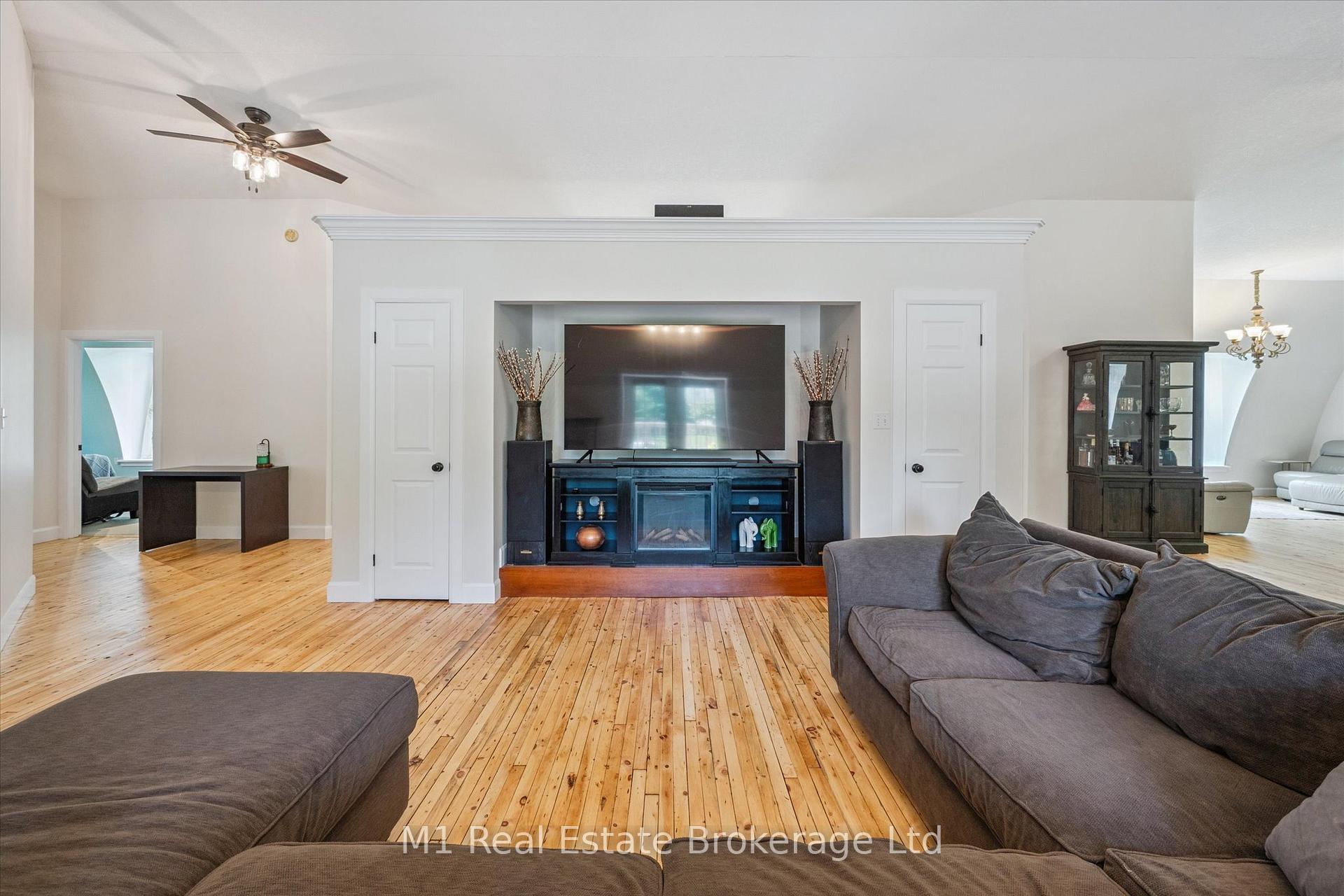 This one-of-a-kind property is ideal for home-based entrepreneurs and investors. Potential to be severed into TWO lots. Plans to extend town services past the property also open up a world of possibilities. Set on 1.8 prime acres on the edge of Elora, this architecturally gem of a building has been completely renovated and reimagined by the current owners to offer both stunning residential space and versatile commercial potential.The upper level boasts over2,500square feet of beautifully finished, open-concept living with soaring 13-foot ceilings, original hardwood floors, and an abundance of natural light. A chefs kitchen anchors the space, while the expansive primary suite offers a private retreat. Two additional bedrooms and a full bath complete the residential layout. Recent upgrades include two large new windows, a brand-new front door, and updated stone and vinyl siding for a modern, refreshed exterior. The lower level, also above grade, features more than 1,700squarefeet of open-span finished space perfect for a workshop, studio, rec room or business. It includes two oversized garage bays, a utility/storage bay, and a bathroom. With the proper approvals, this level could potentially be converted into a residential rental unit. In total, the property offers over 4,200 square feet of usable space. Two separate paved driveways and a large rear parking area provide ample room for vehicles, clients, or equipment. A generous green space out back offers potential for an accessory structure and now features a new above-ground pool, perfect for relaxing or entertaining.