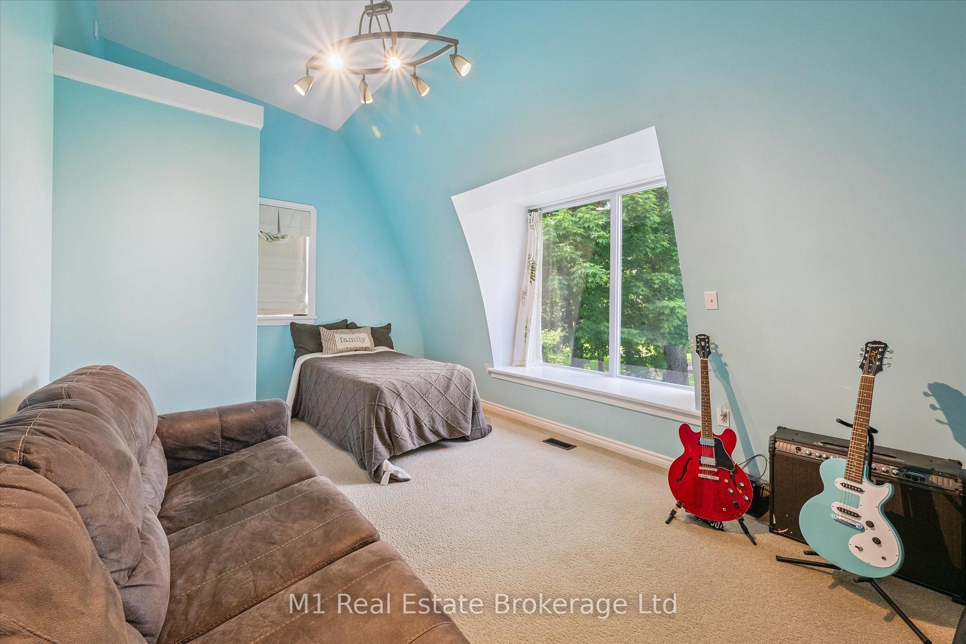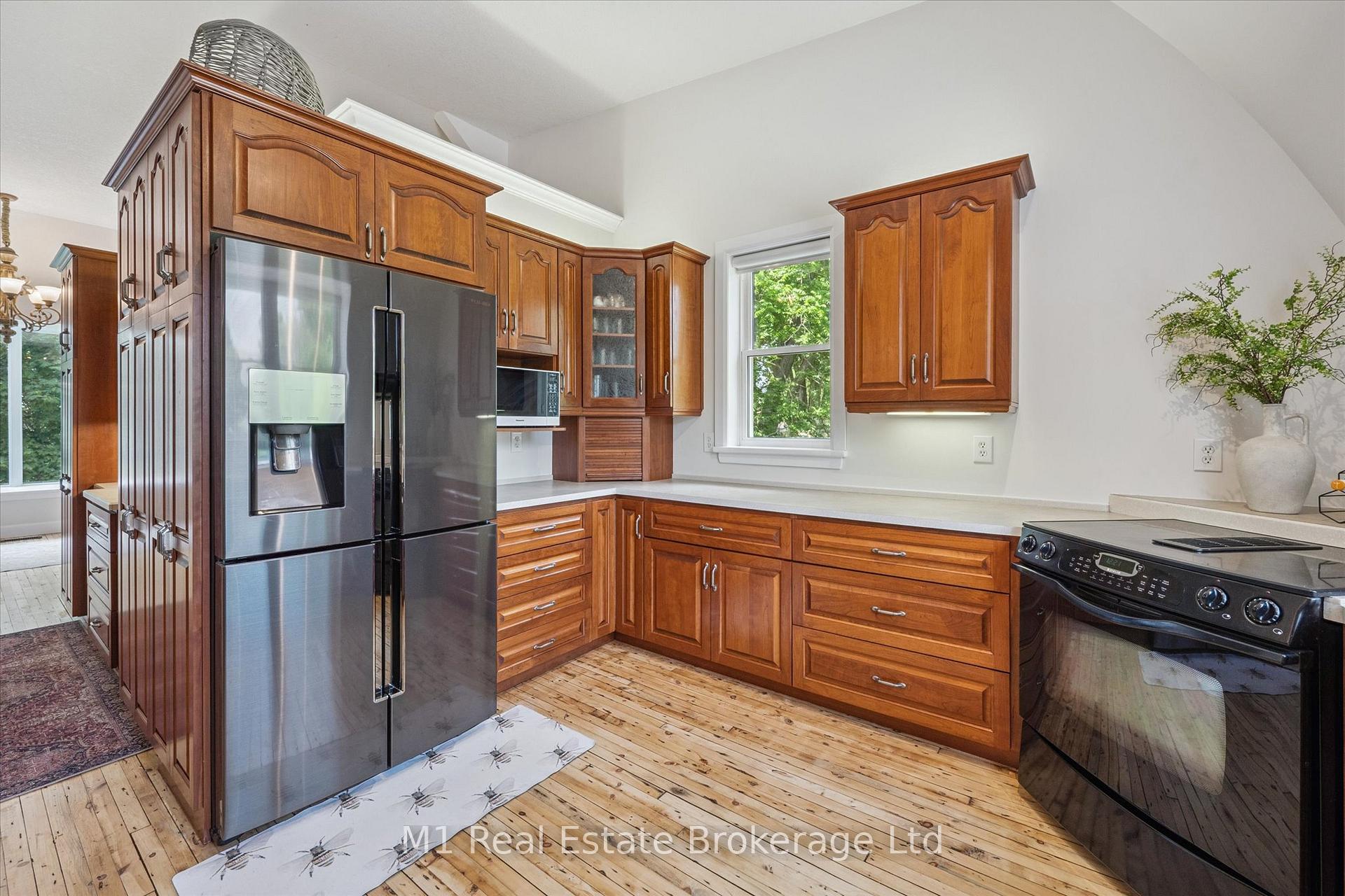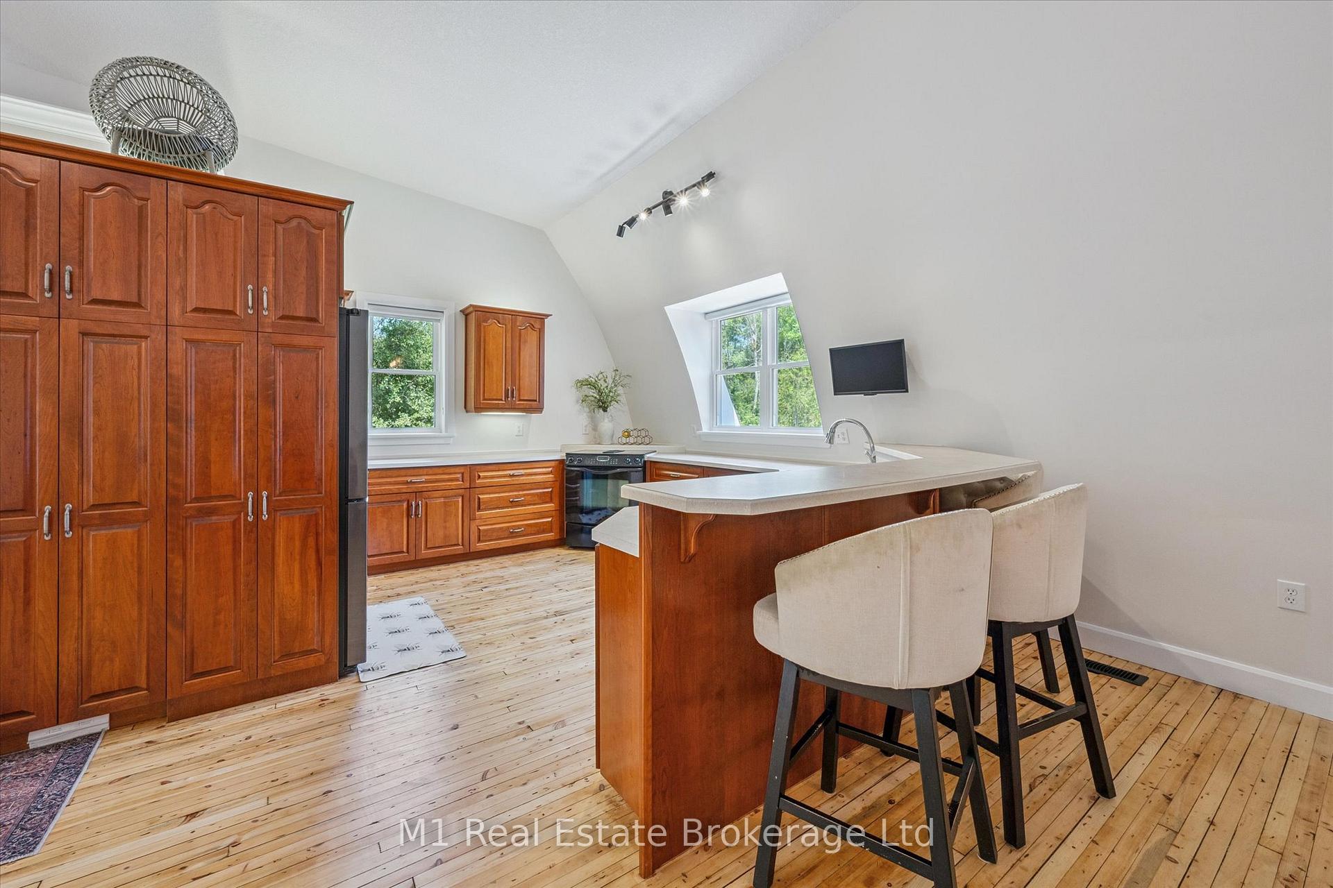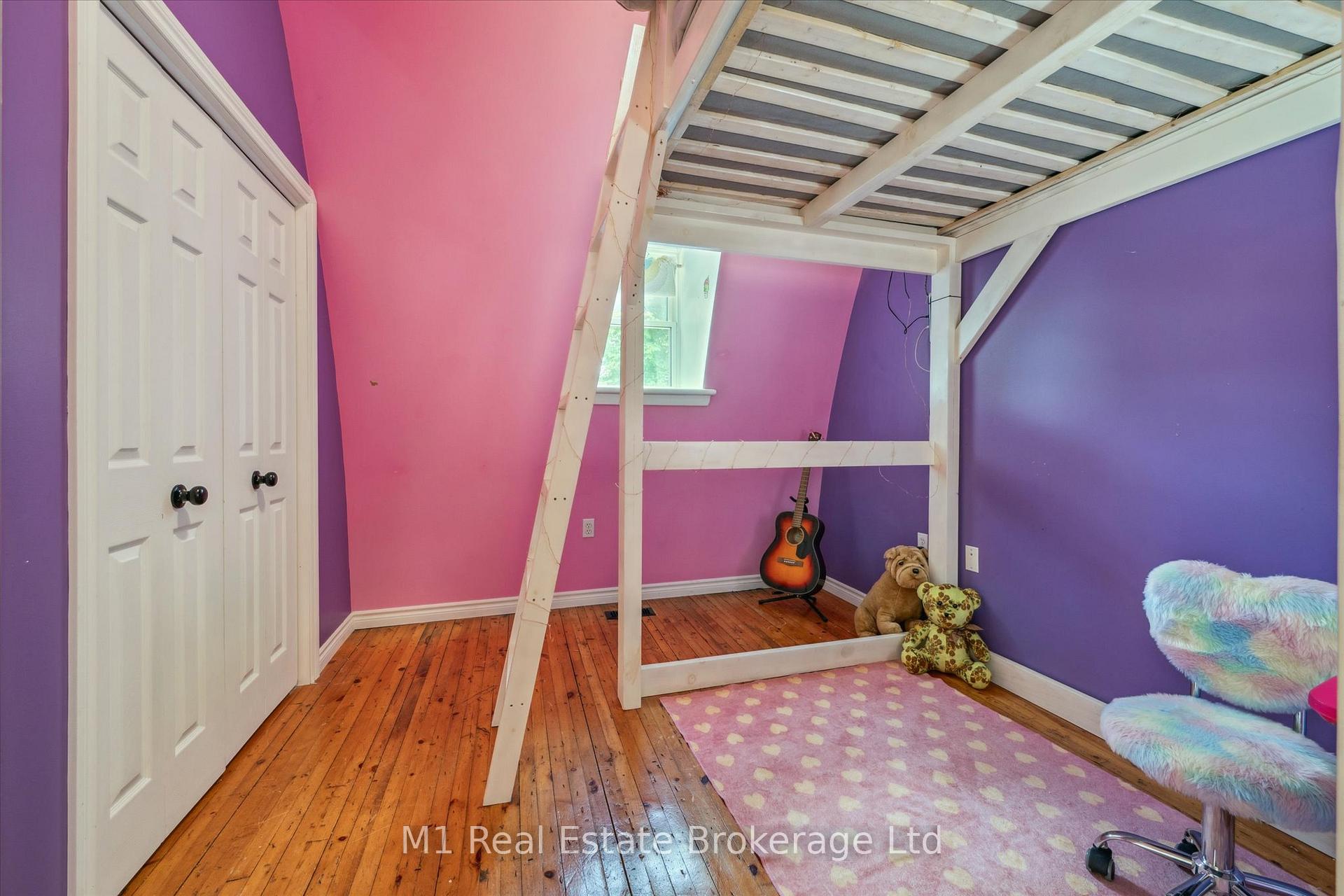 This one-of-a-kind property is ideal for home-based entrepreneurs and investors. Potential to be severed into TWO lots. Plans to extend town services past the property also open up a world of possibilities. Set on 1.8 prime acres on the edge of Elora, this architecturally gem of a building has been completely renovated and reimagined by the current owners to offer both stunning residential space and versatile commercial potential.The upper level boasts over2,500square feet of beautifully finished, open-concept living with soaring 13-foot ceilings, original hardwood floors, and an abundance of natural light. A chefs kitchen anchors the space, while the expansive primary suite offers a private retreat. Two additional bedrooms and a full bath complete the residential layout. Recent upgrades include two large new windows, a brand-new front door, and updated stone and vinyl siding for a modern, refreshed exterior. The lower level, also above grade, features more than 1,700squarefeet of open-span finished space perfect for a workshop, studio, rec room or business. It includes two oversized garage bays, a utility/storage bay, and a bathroom. With the proper approvals, this level could potentially be converted into a residential rental unit. In total, the property offers over 4,200 square feet of usable space. Two separate paved driveways and a large rear parking area provide ample room for vehicles, clients, or equipment. A generous green space out back offers potential for an accessory structure and now features a new above-ground pool, perfect for relaxing or entertaining.