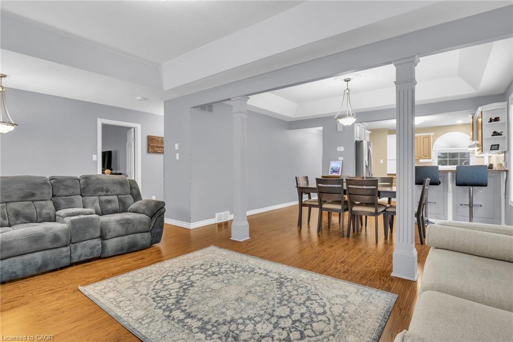 A stunning residence nestled in the highly sought-after, quiet community of South Parkwood Estates in Elmira. This 4-bedroom, 2.5-bathroom home offers the perfect blend of small-town tranquility and modern convenience, with easy access to the charming village of St. Jacobs and the bustling Kitchener-Waterloo area. As you step inside, you are greeted by a sizable foyer that sets an inviting tone. The main level features a desirable open-concept layout, anchored by a warm gas fireplace—the perfect focal point for hosting guests or enjoying quiet evenings. The spacious kitchen is a chef’s delight, boasting ample counter and cabinet space. For ultimate accessibility, the primary bedroom is located on the main floor, featuring a large walk-in closet, alongside a dedicated main floor laundry room. The fully finished basement expands your living space significantly. Here, you will find three additional sizeable bedrooms, ideal for a growing family or a home office. The cozy rec room, complete with a woodstove, provides a rustic retreat for chilly Ontario winters. A standout feature is the walk-up access from the basement directly to the oversized 2-car garage, offering incredible functionality and potential for a secondary entrance. Step outside into a backyard that is truly a rare find. Professionally landscaped gardens surround a peaceful waterfall feature, creating a serene atmosphere. Backing onto a lush woodlot with no rear neighbors, you can enjoy ultimate privacy on the large deck or under the gazebo. The exterior is completed by a resurfaced driveway with plenty of parking for family and friends. Experience the best of Elmira living in this beautifully maintained and thoughtfully designed property.