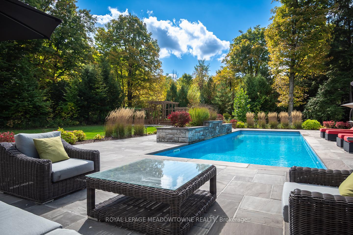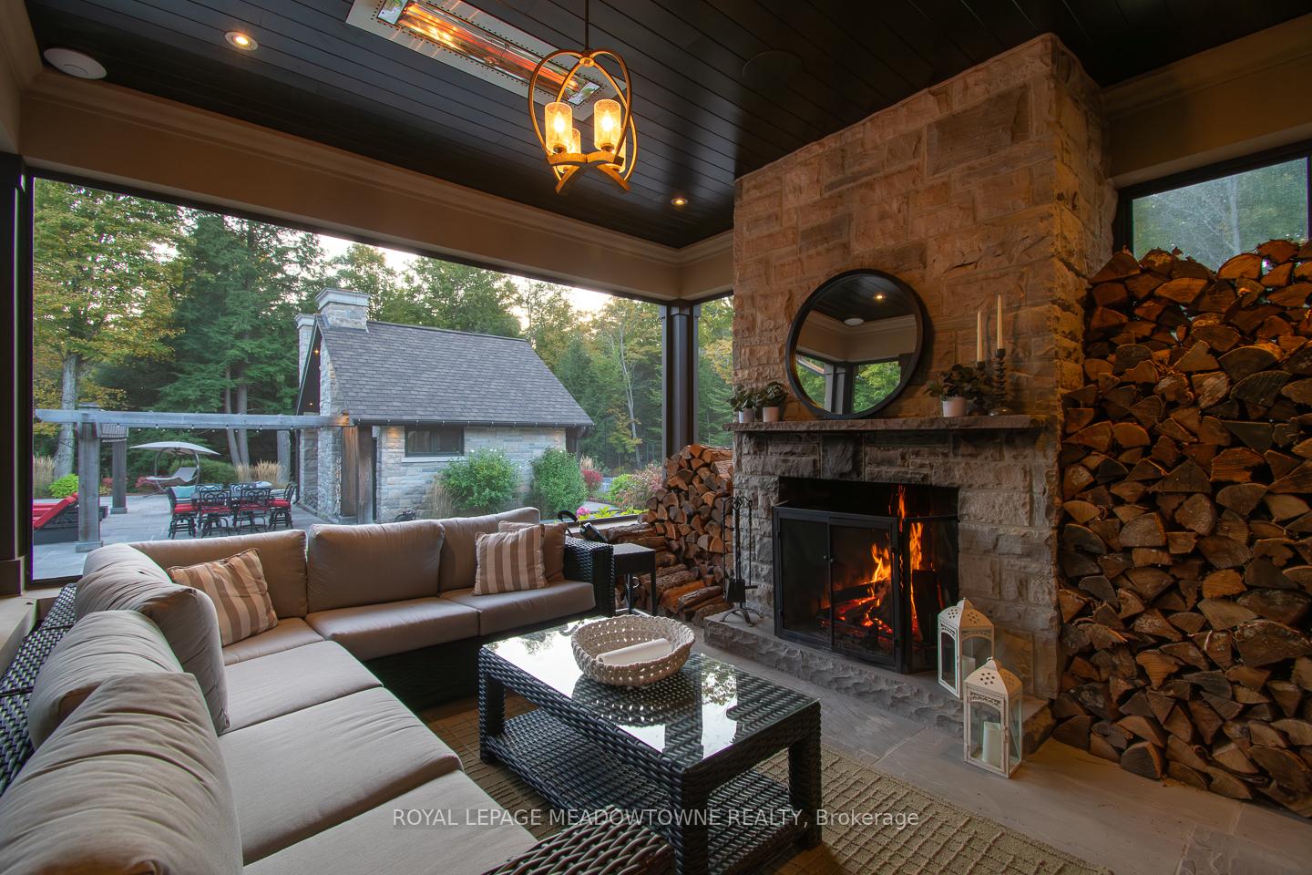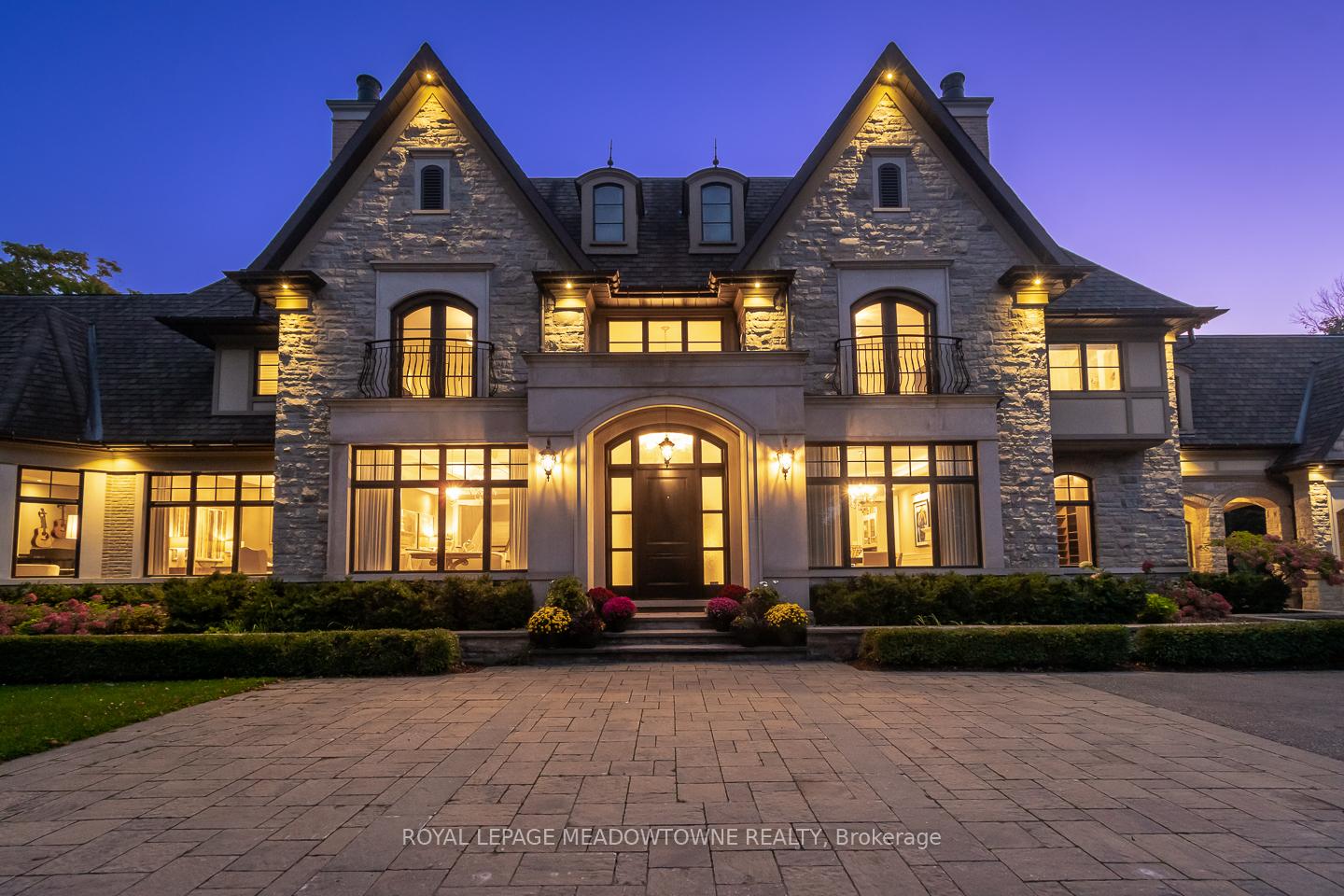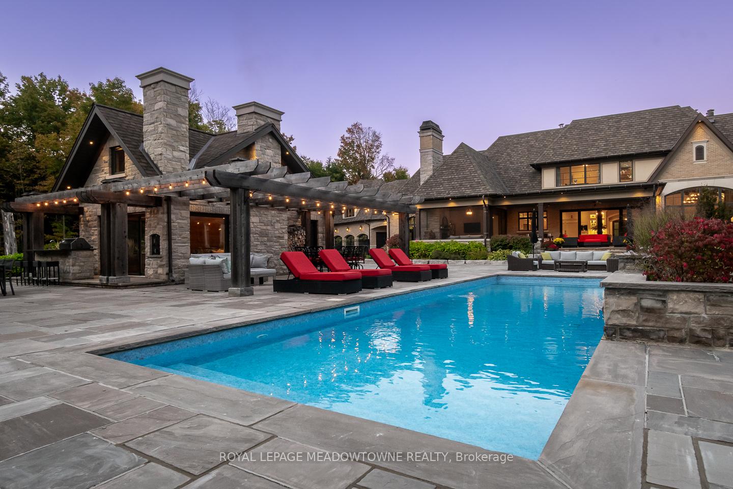 A forested 5-acre sanctuary where architectural brilliance meets resort-style living. This estate is a masterclass in design, indulgence, and lifestyle. With over 16,000 sq ft of finished space, it offers a rare blend of grandeur and warmth. The main floor primary wing is a retreat unto itself, featuring dual dressing rooms, library, spa-inspired ensuite, sauna, and walkout to a private deck with hot tub. Formal living and dining rooms, a vaulted family room, and chef’s kitchen with butler’s servery anchor the home’s heart. Entertainment spaces include a bowling alley, golf simulator, cinema, arcade, spa room, bar and billiards lounge all connected by elevator across three levels. A separate nanny/in-law suite via breezeway offers seamless multi-generational living. Outdoors, discover a saltwater pool, pavilion, casita, pool house, pizza oven, fire pit, vegetable garden, and Raptors-inspired basketball court. Geothermal heating, smart home integration, and lush landscaping elevate every moment. This is more than a home, it’s a legacy property, a lifestyle statement, and a rare opportunity to live expansively, with privacy, prestige, and purpose.