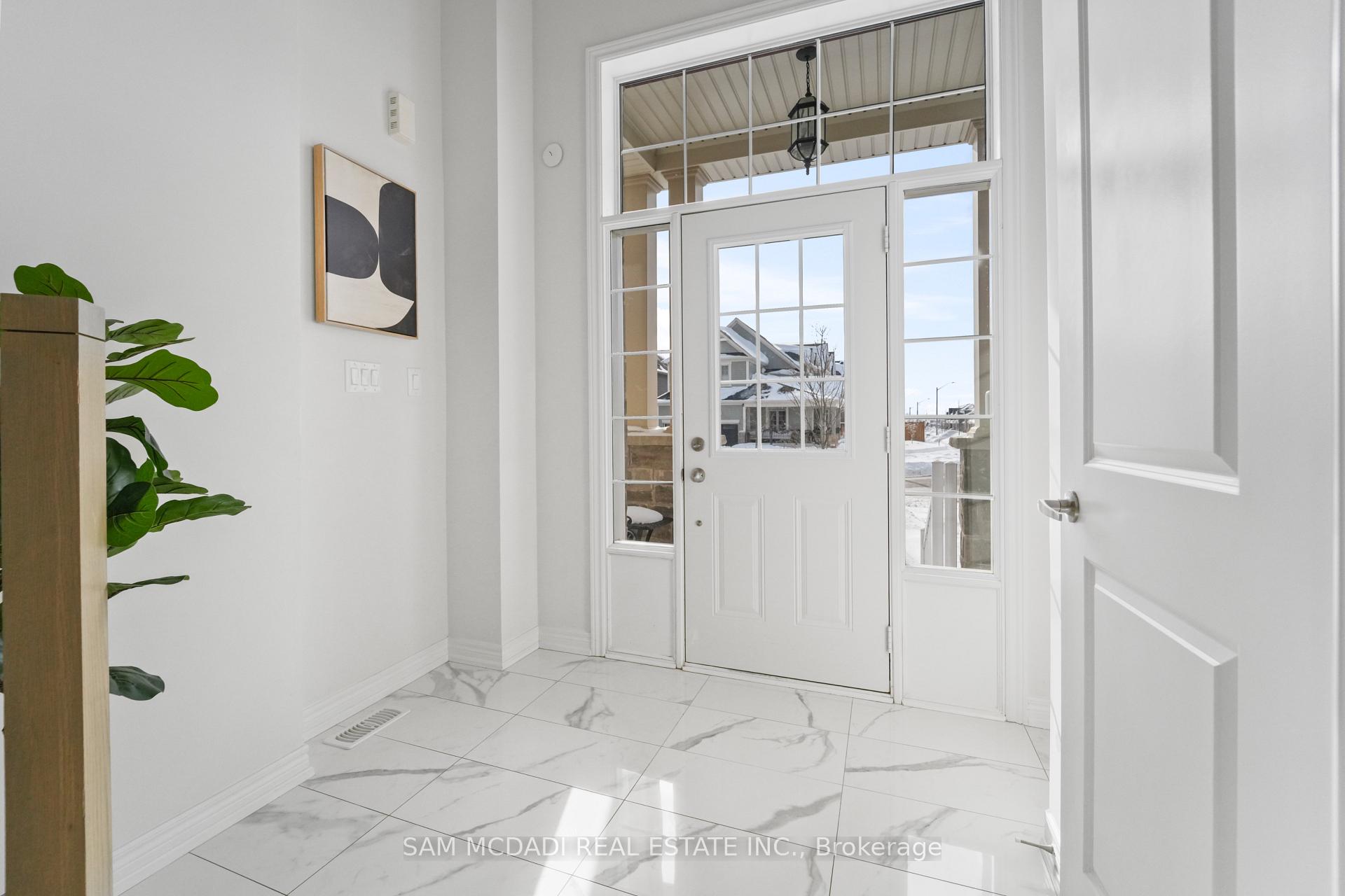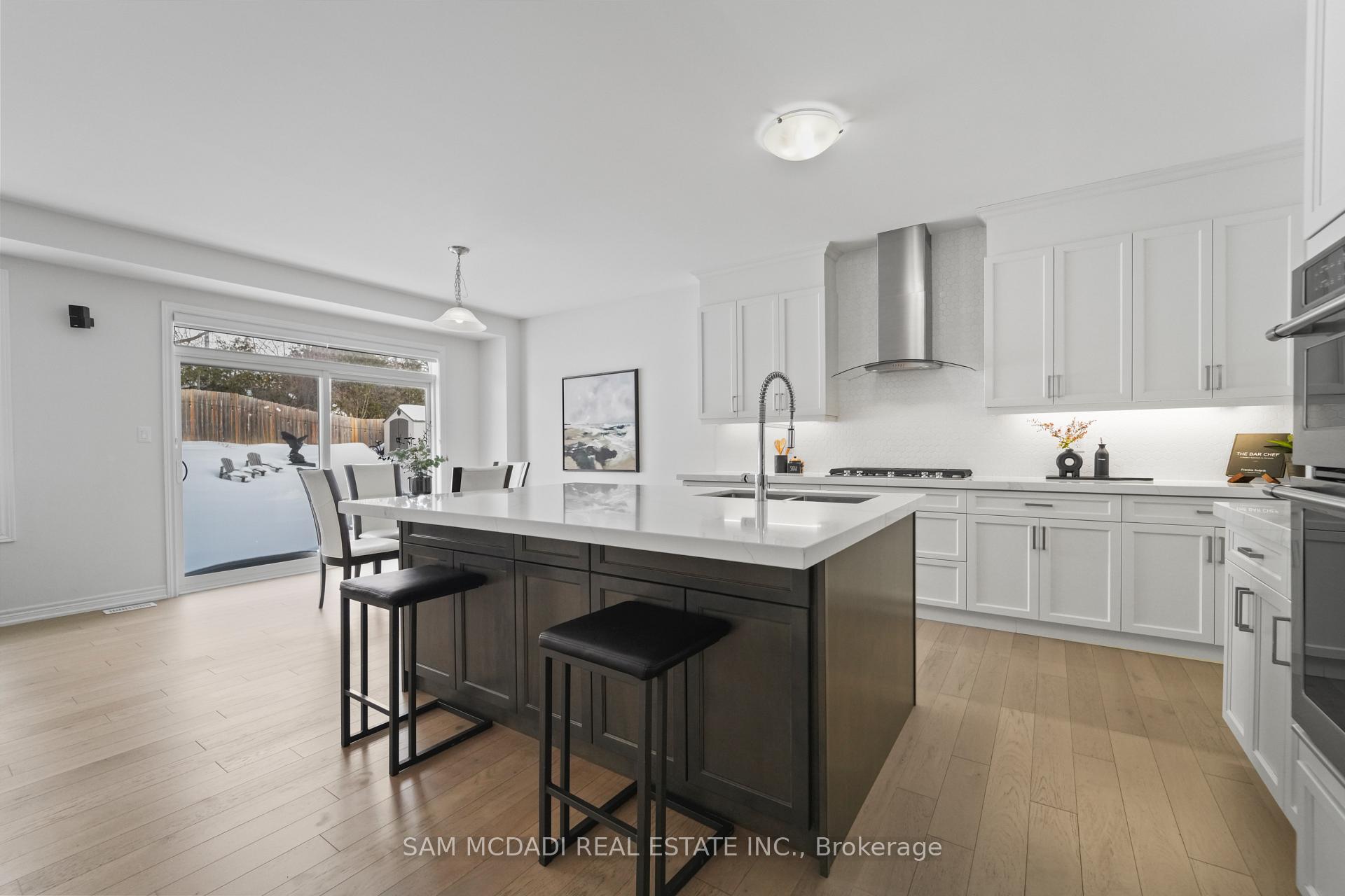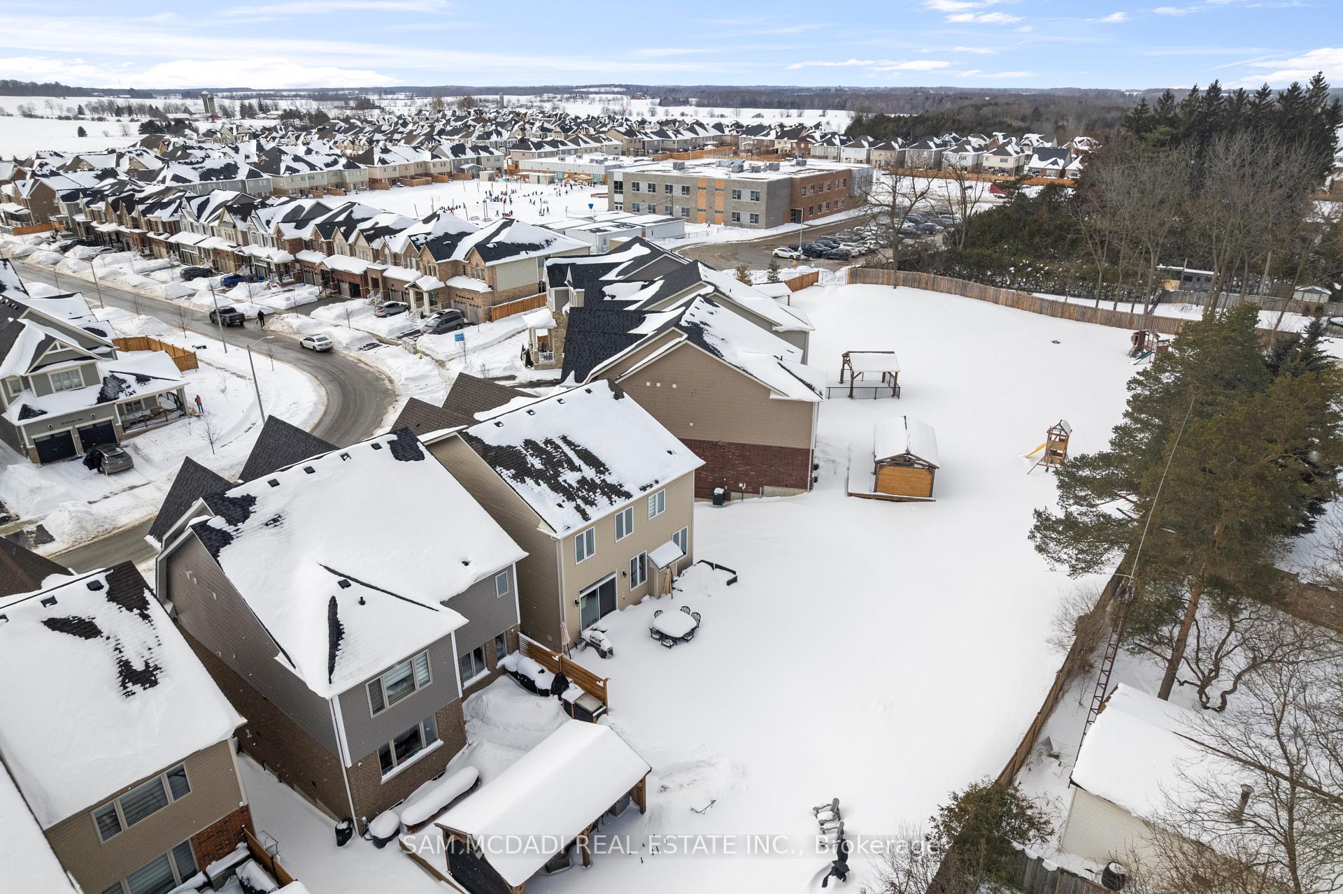 Meticulously maintained and truly stunning, this 4-bedroom, 4-bathroom detached home offers 2,763 sq. ft. of beautifully designed above-grade living space on a large pie-shaped lot in a quiet, family-friendly neighbourhood. A grand foyer with soaring 16-foot ceilings creates an impressive welcome, leading to an elegant main floor filled with natural light from expansive front entry glass, large windows and nine-foot ceilings. Rich hardwood flooring, and oak staircases with wrought iron pickets add warmth and sophistication throughout.The upgraded chef-inspired kitchen is the heart of the home, featuring extended cabinetry, a walk-in pantry, quartz countertops, stylish backsplash, centre island with breakfast bar, and built-in appliances-perfect for everyday living and entertaining. The open-concept main floor flows seamlessly, highlighted by a cozy gas fireplace in the family room, a formal dining area ideal for hosting, and a separate front living room offering a quiet retreat. Upstairs, four generously sized bedrooms each enjoy direct access to a bathroom-ideal for growing families. The primary suite features a spacious walk-in closet and a luxurious 5-piece ensuite. The lower level includes a finished foyer with double closets, double-door basement entry, and direct access to the double-car garage.With a 2-car garage and additional driveway parking, there is ample space for vehicles and storage. The expansive pie-shaped lot provides plenty of room for outdoor activities, entertaining, or gardening.Ideally located within walking distance to Rockmosa Park, Rockwood Child & Family Centre, local schools, and the library, and just minutes from Rockwood Conservation Area, this exceptional home offers the perfect blend of space, style, and convenience for family living.