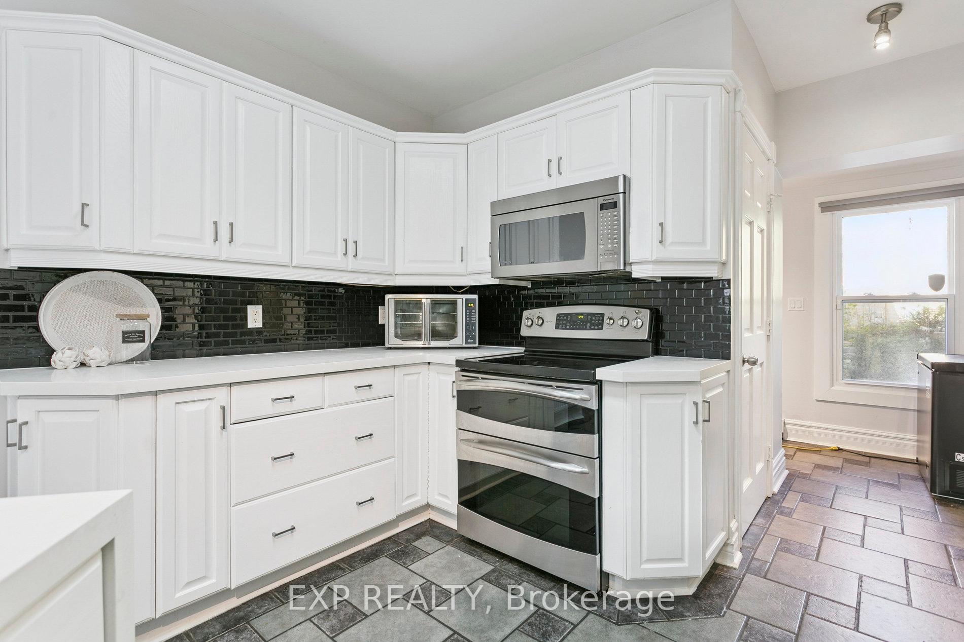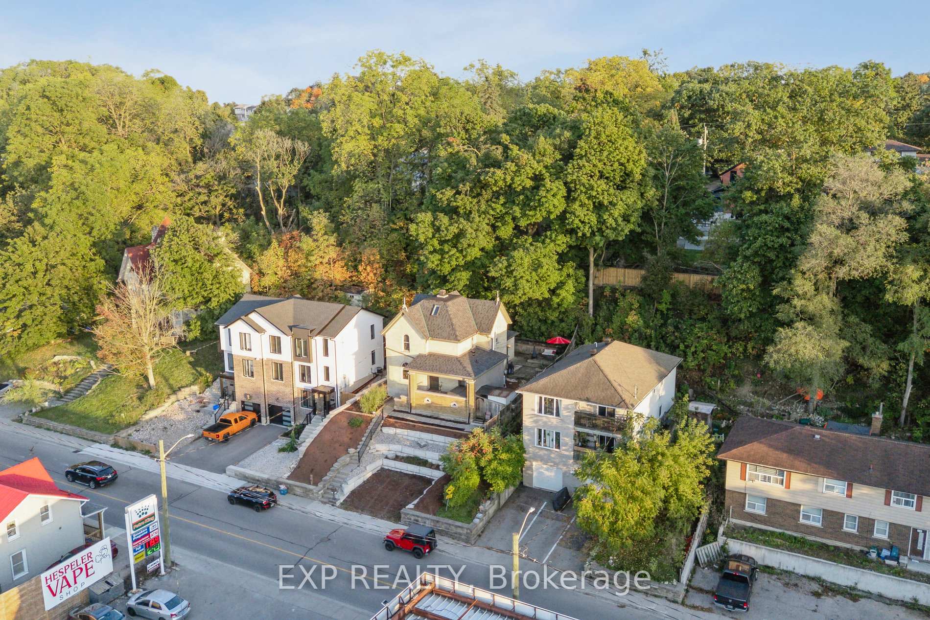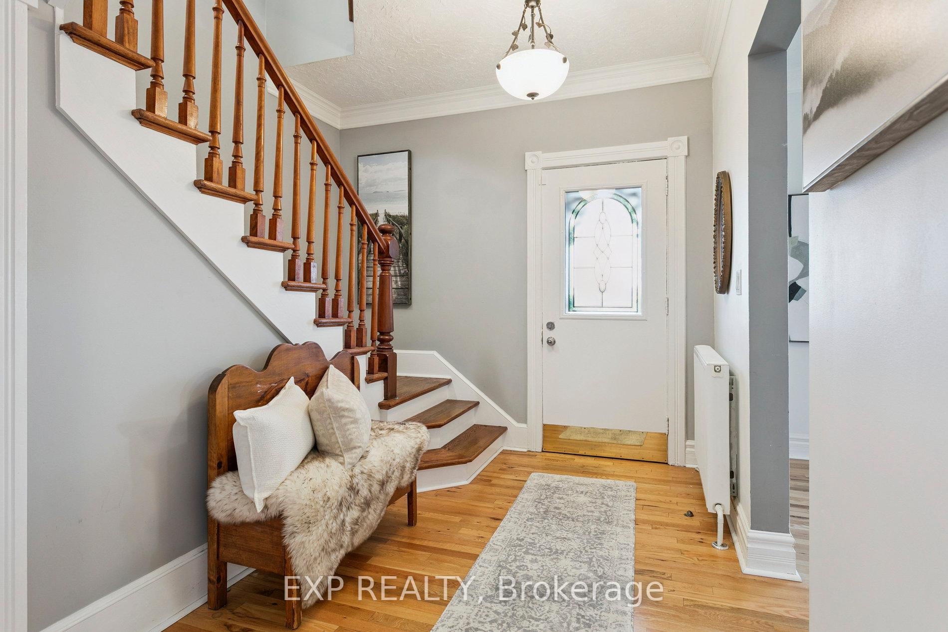 This beautifully maintained 2000 sq. ft. double-brick home, built circa 1900’s, blends historic character with modern updates. Features include hardwood floors, crown mouldings, high ceilings, stained-glass windows, and the original staircase railings. The spacious kitchen offers new appliances and a walkout to the wrap-around deck. With 3 bedrooms and 1.5 bathrooms, a versatile loft with skylights, a gas fireplace, and approximately 500 sq. ft. of basement storage, this home is both functional and charming. 200 amp electrical service, plumbing, and roof shingles (approx. 6 years old) have all been updated. Enjoy a private backyard backing onto a wooded area and sunset views from the elevated front patio. Walking distance to downtown Hespeler, schools, parks, and trails, and only five minutes to Hwy 401.