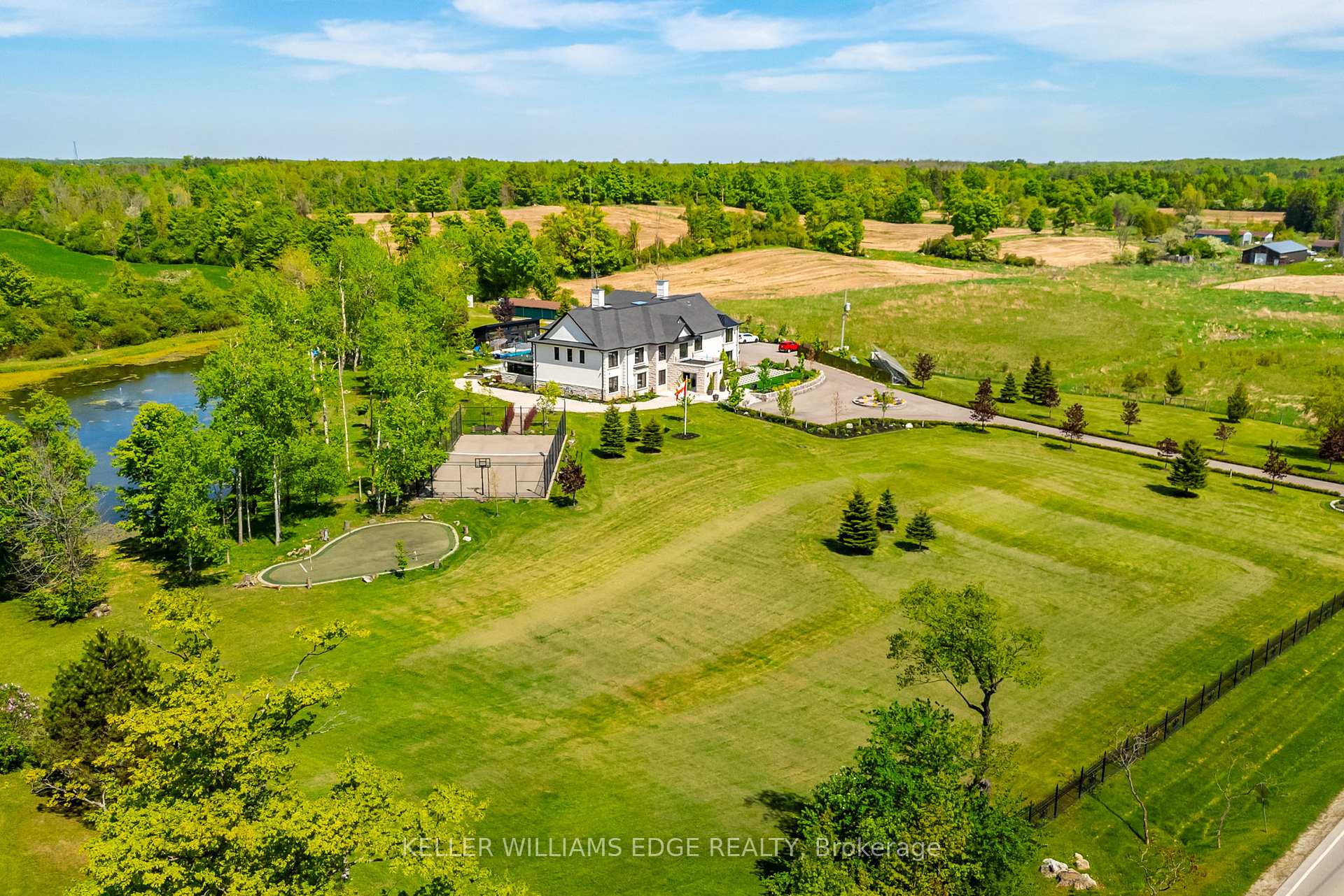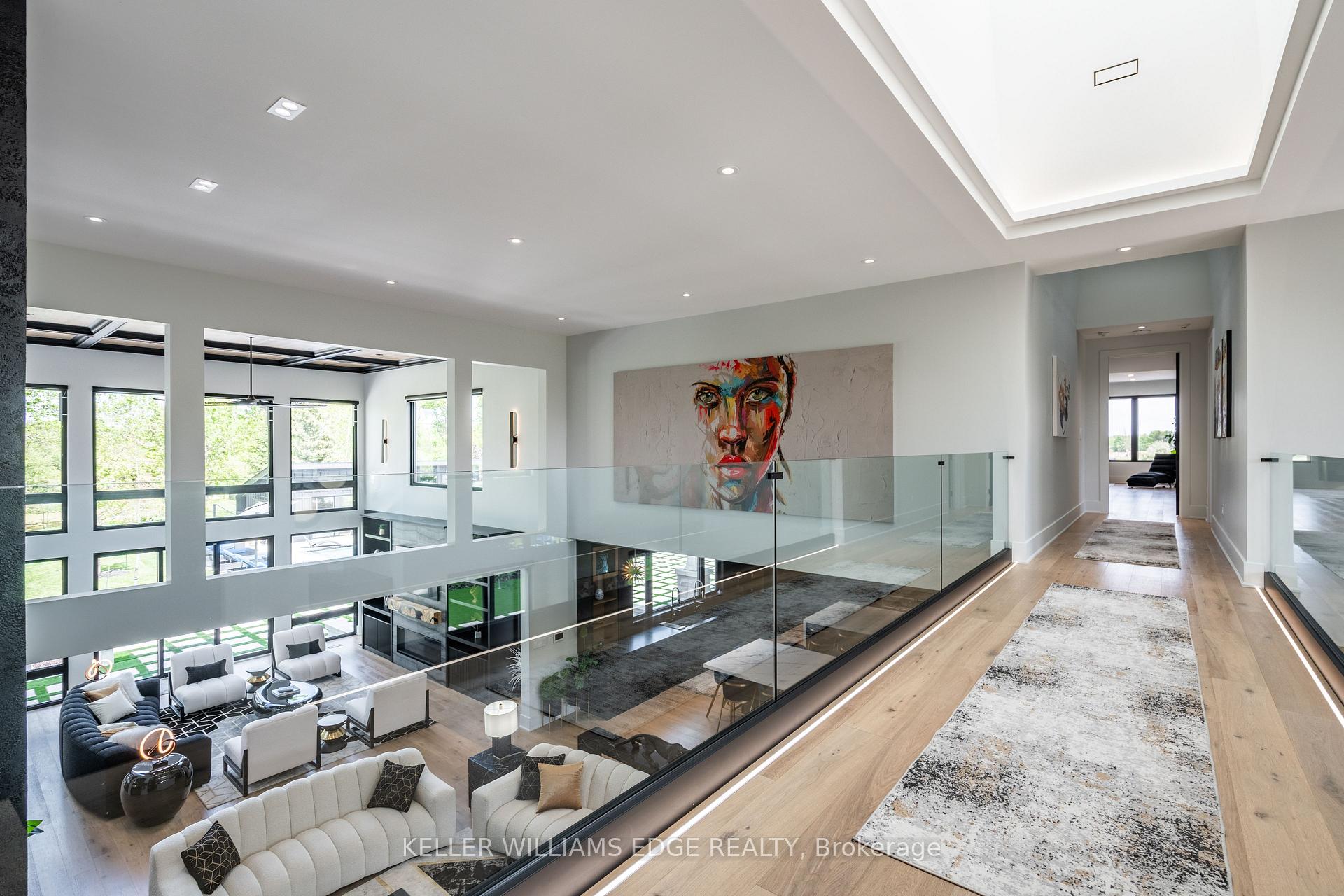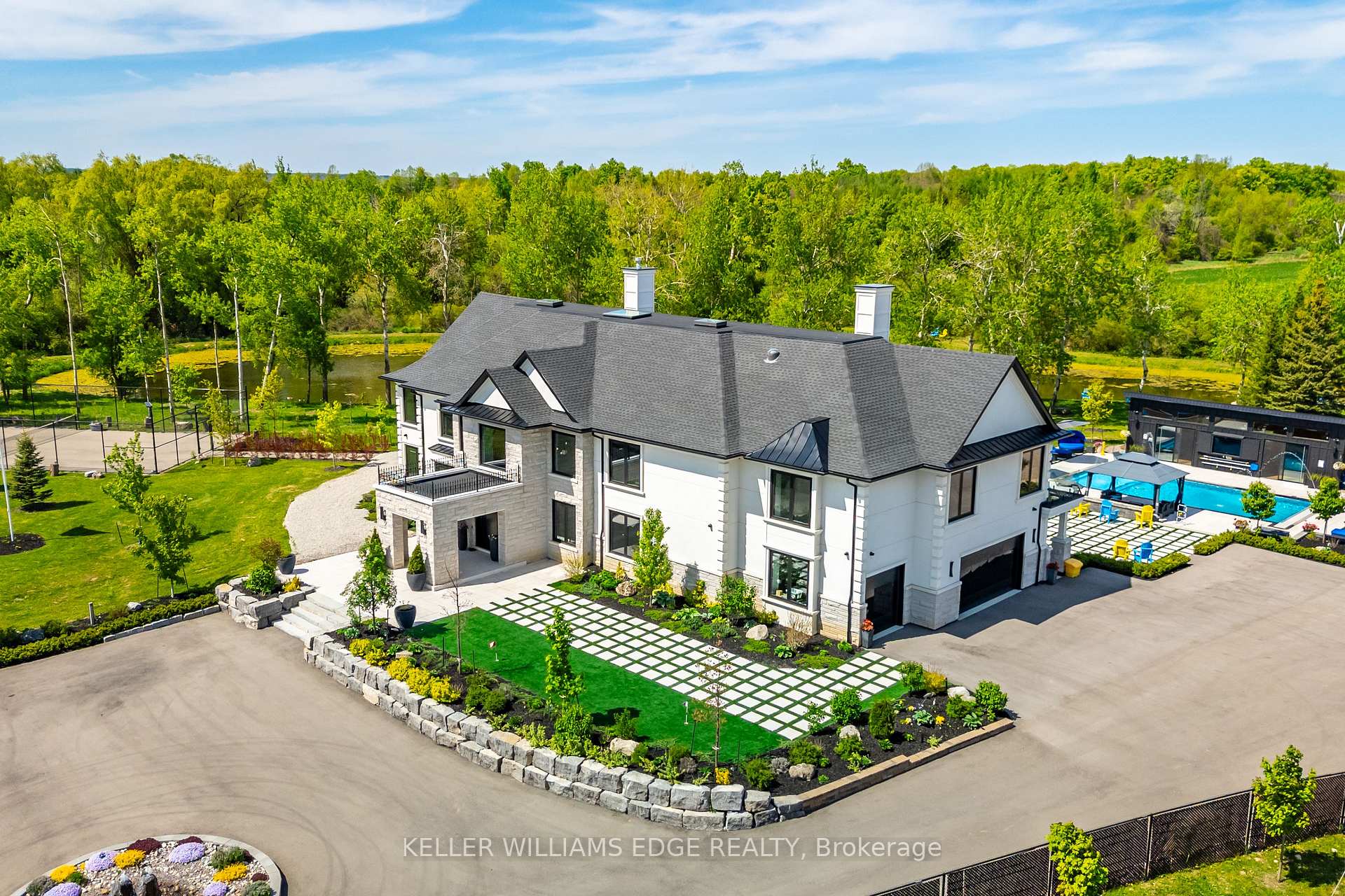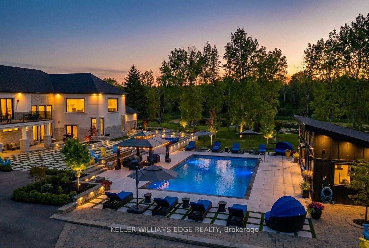 A truly rare offering. Set on 5.76 acres of private, tree-lined grounds, this custom-built estate presents an exceptional opportunity to own a secluded executive retreat minutes from the GTA. Thoughtfully designed and meticulously crafted by its original owners, the residence balances architectural presence with everyday livability, offering space, privacy, & quality that is difficult to replicate. A dramatic 22-foot foyer with a striking floating staircase creates a commanding first impression, while expansive floor-to-ceiling windows frame serene natural views & flood the home with sunshine. The layout is intentionally designed for both grand-scale entertaining and comfortable family living. At the centre of the home is a remarkable chef’s kitchen featuring dual oversized islands with seating for up to fourteen, premium appliances, & seamless flow to the sunroom & outdoor kitchen, ideal for hosting, gatherings, & year-round entertaining. This estate offers an extensive collection of resort-style amenities, including a private spa with a 10-person jacuzzi, steam room, & sauna, plus a fully equipped home theatre, gym, games area, & full bar. A private elevator enhances convenience across all levels. Above the garage, a three-bed guest suite provides flexibility for extended family, guests, or live-in support. The outdoor experience is equally impressive: heated saltwater pool, two fire pit areas, tennis & basketball courts, walking trails surrounding a tranquil private pond, & multiple outdoor spaces designed for relaxation and entertaining, all within complete privacy. The property is equipped with solar & geothermal systems, full smart-home integration, & dual septic systems, reflecting a commitment to sustainability, efficiency, & long-term ownership. A rare legacy estate offering privacy, land, & lifestyle without sacrificing proximity to major urban centres. An exceptional opportunity for the discerning buyer seeking space, discretion, & enduring value.