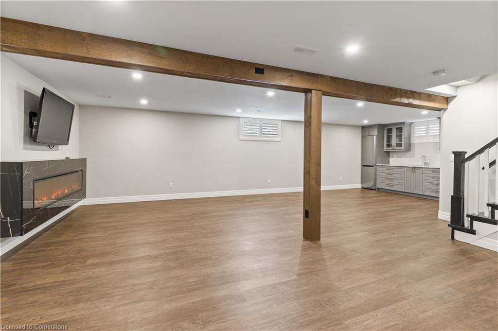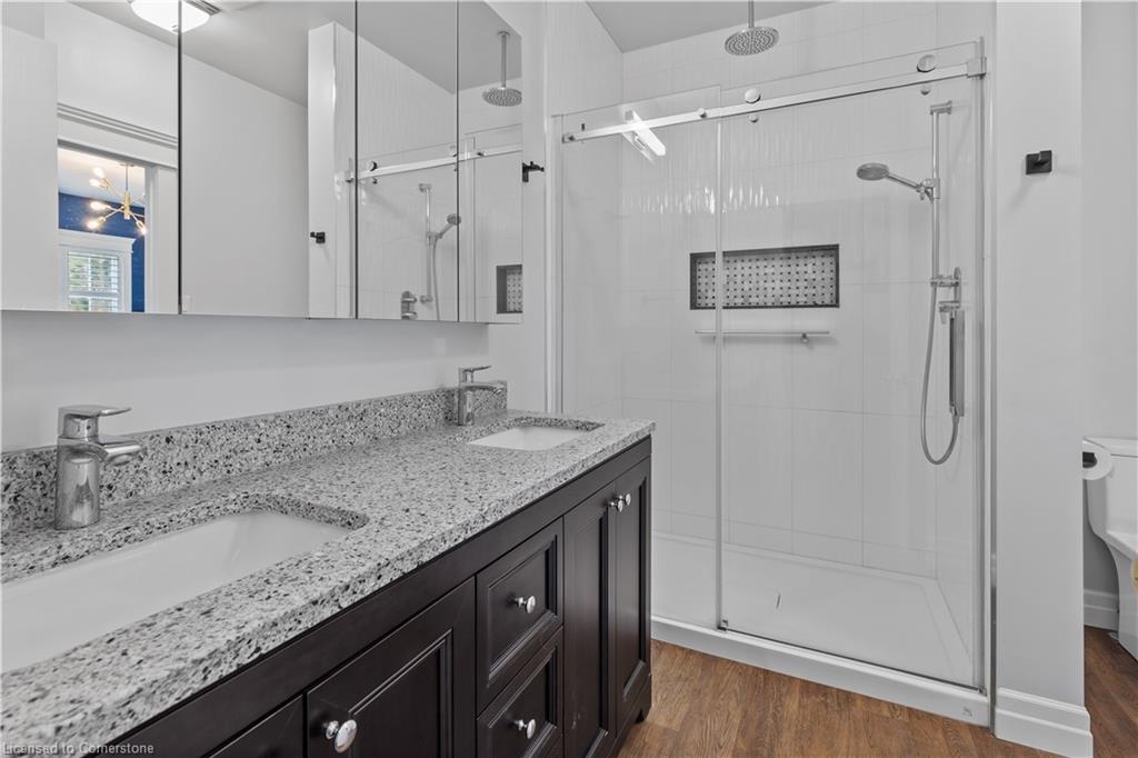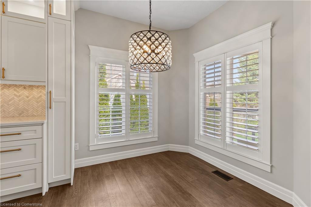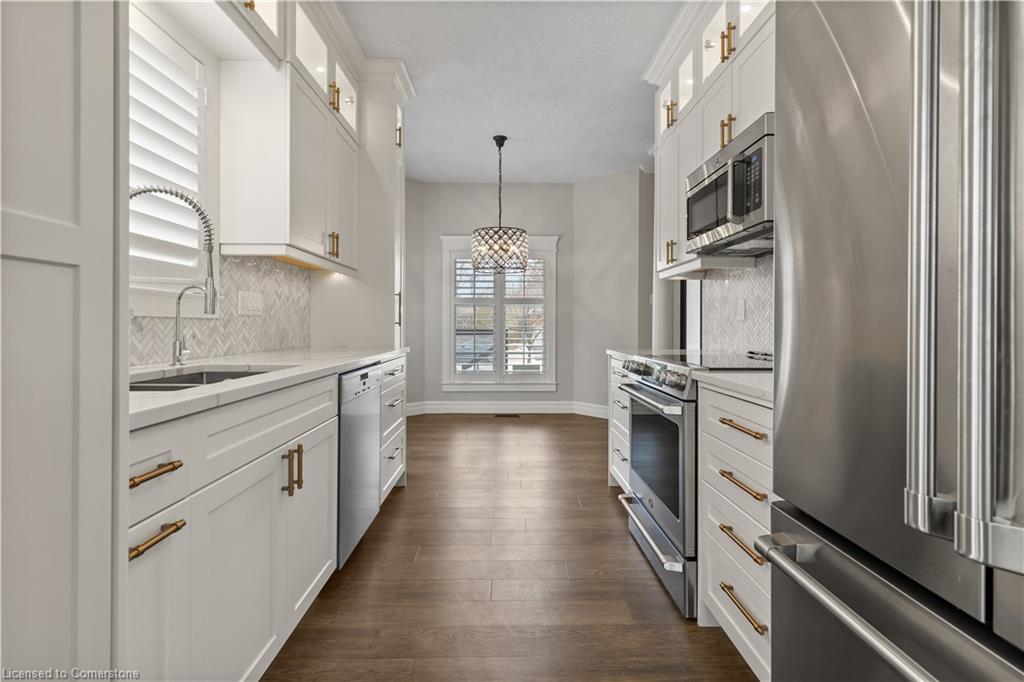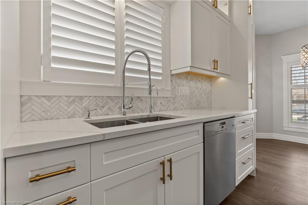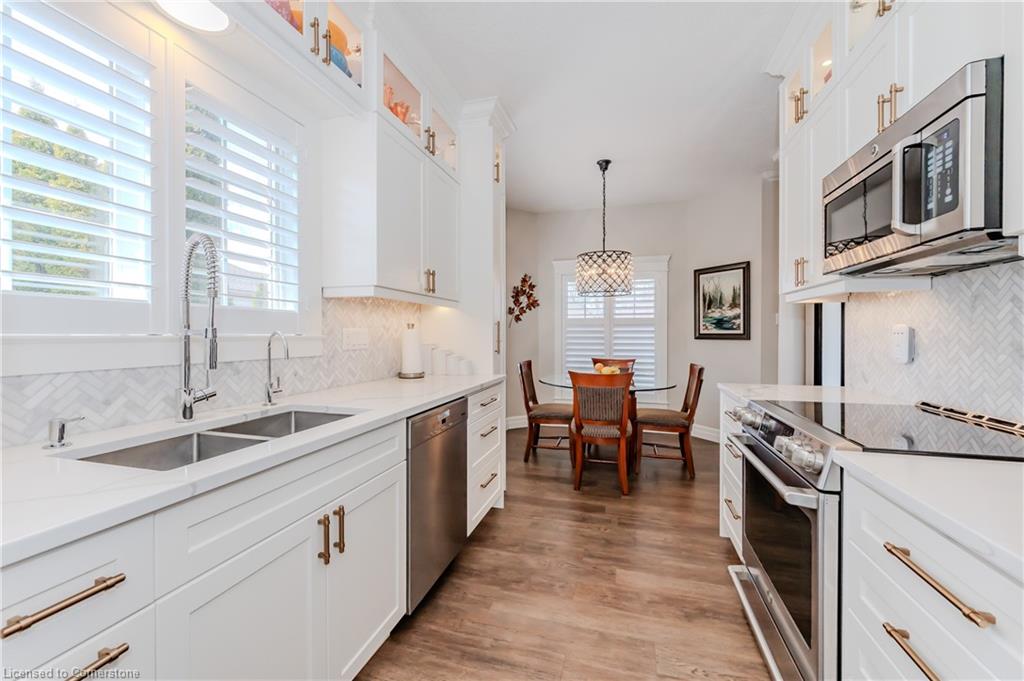 The absolute BEST that Beechwood West has to offer! THIS is the one you’ve been searching for. This end unit, FREEHOLD townhome has been upgraded & improved from top to bottom and inside out. With over $350,000 invested in improvements over the last 5 years YOU get to inherit the home of your dreams. A formal dining room boasting a crystal chandelier & superb wainscoted walls, a main floor primary bedroom with walk-in closet & ensuite privilege door to a stunning 4 piece bath accented with a granite topped vanity with double undermount sinks and oversized shower with glass sliding doors. You are going to fall in love with the custom designed Chef’s kitchen! It’s bright and white & features quartz countertops and marble backsplash this kitchen has THREE pull out cutting boards and 2 huge pull out cutlery organizer drawers! Other extras include a double undermount sink, soap dispenser & pantry faucet plus a pull out recycle bin. Your living room has a gas fireplace surrounded by a gorgeous white mantle & a walkout to your patio retreat! Let’s explore the lower level. An amazing, spacious recreation room with a stunning black wall mounted electric fireplace & the perfect games area complimented with a wet bar finished with a 9’6″ granite counter. Be sure to explore the ample drawers in the cabinet. Deep drawers plus 3 unique wine storage drawers too! Lastly tons of storage & a full 4 piece bathroom. There is a 2nd bedroom or guest room on the lofted area that offers a large walk-in closet & a 3 piece ensuite with a quartz undermount sink. The exterior of the home offer very little maintenance for you. A double wide concrete drive, recent concrete walkways and a superb concrete and stone patio and handy storage shed! Here are just some of the extras…ALL flooring has been replaced with hardwoods, ceramics & luxury vinyl plank. California shutter throughout (even the garage), all new light fixtures, epoxy floor in the garage & so much more. A complete list is available.