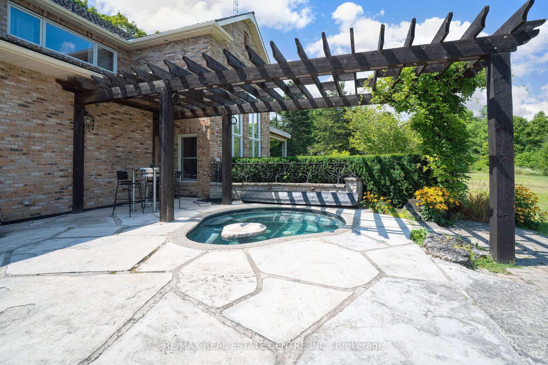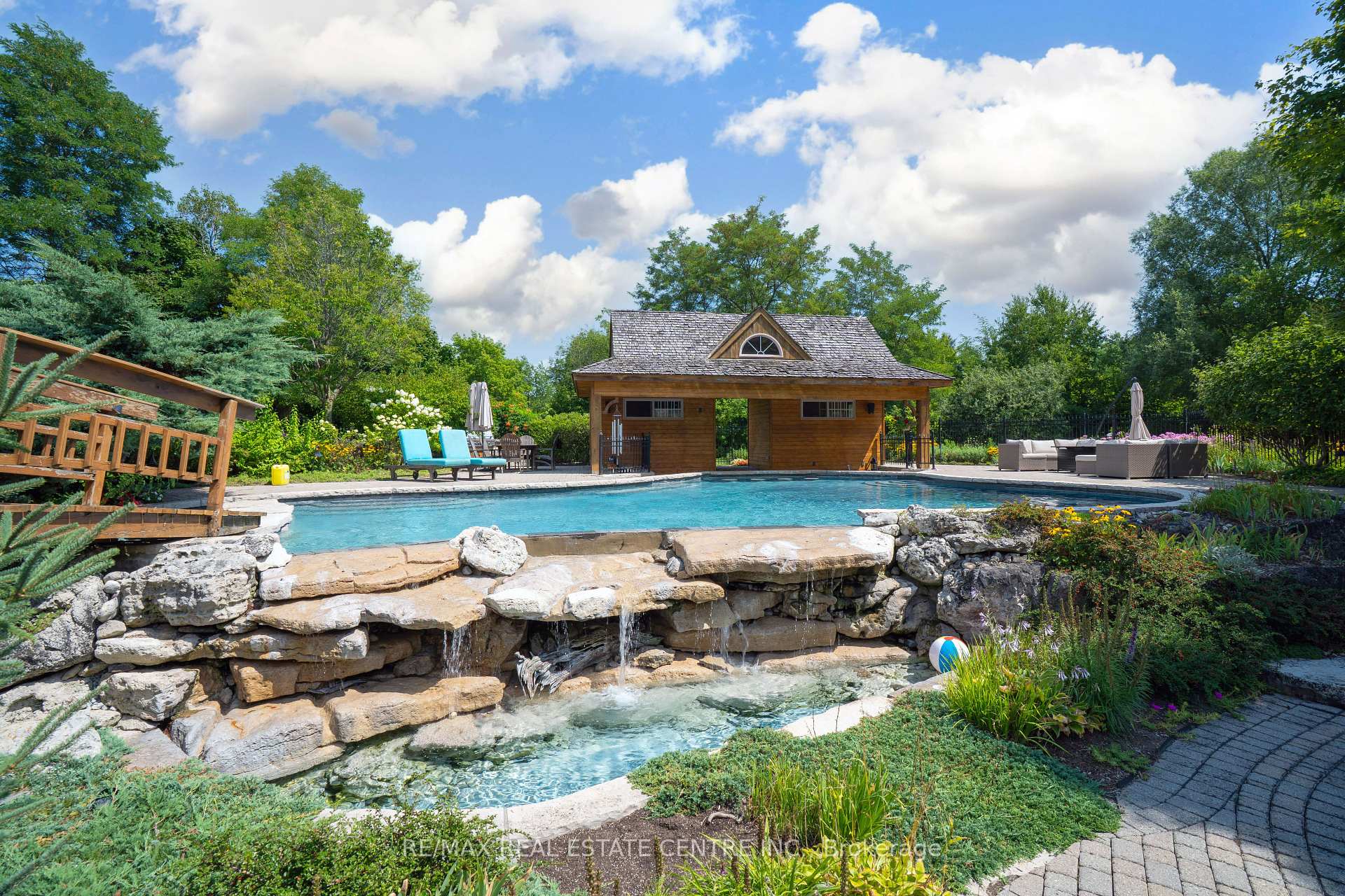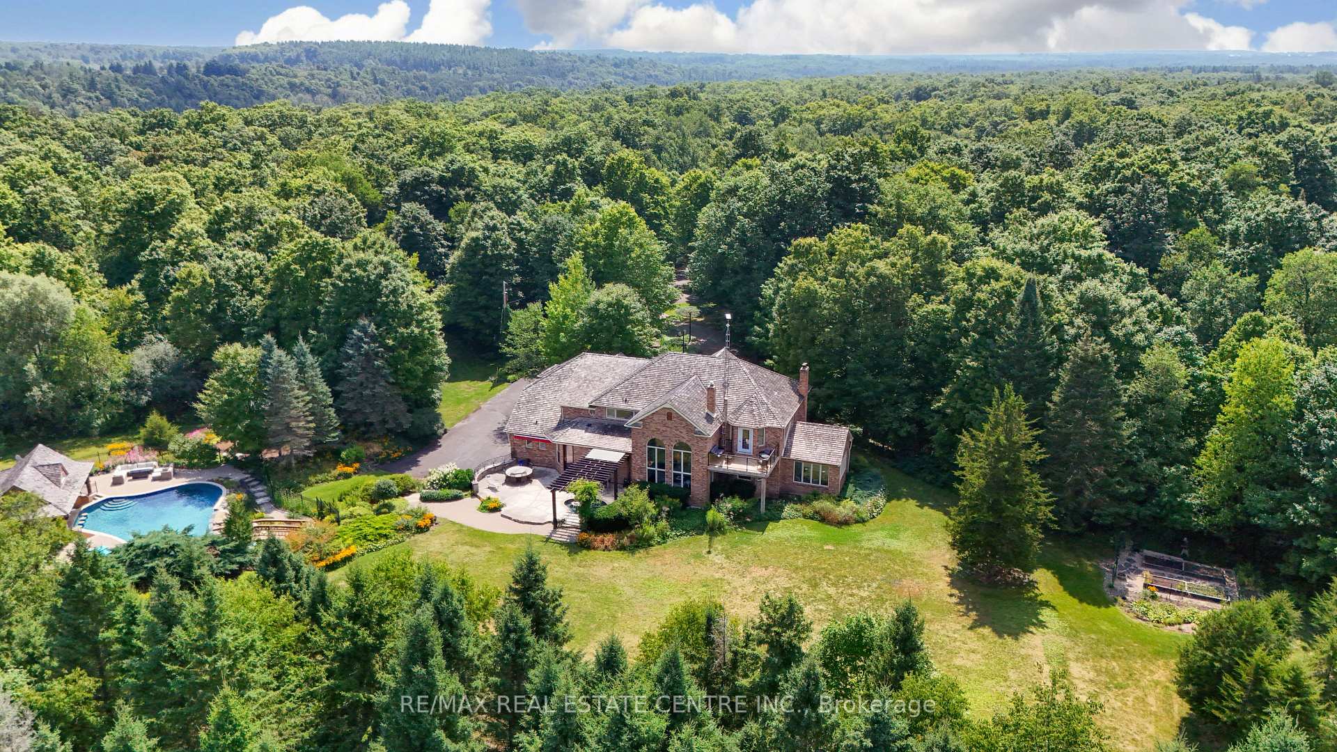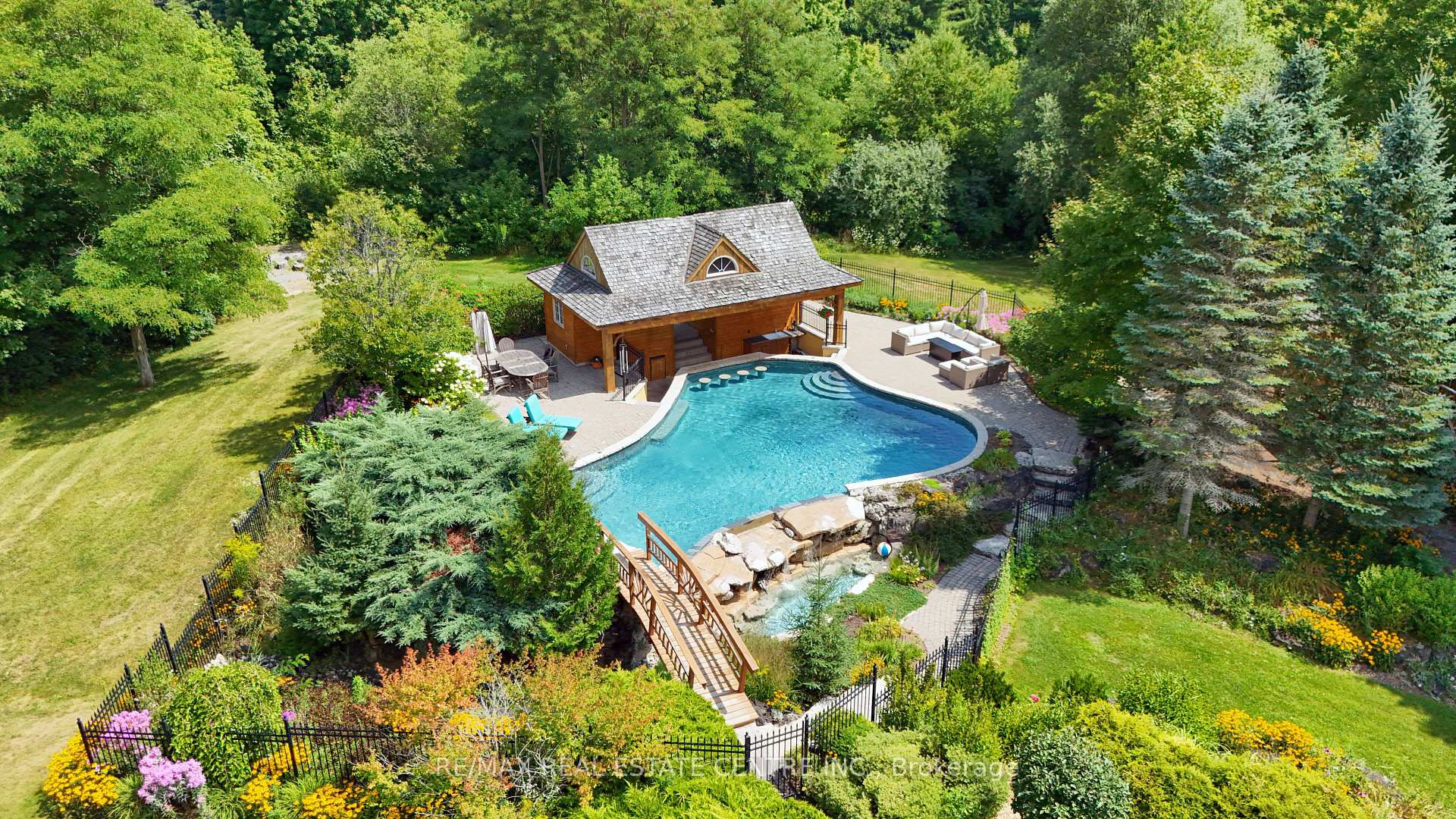 A Signature Estate in Nassagaweya. Set at the end of a long, tree-lined drive, this remarkable custom-built 4-bedroom, 7-bathroom residence delivers over 6,100 sq. ft. above grade plus approx 2,000 sq. ft. finished walk-out lower level. The grand two-storey foyer leads to a striking great room with floor-to-ceiling stone fireplace, a light-filled conservatory, private office, and a sunken living room. The chefs kitchen showcases premium appliances, live-edge granite surfaces, an oversized island, and a sunny breakfast nook, while the formal dining room offers a two-sided stone fireplace and custom cabinetry. A billiards lounge with lava rock bar, waffle ceiling, and bespoke built-ins adds to the main floors appeal. Upstairs, the primary suite features a spa-like ensuite and a custom walk-in closet, while three additional bedrooms each have their own designer baths. A secondary staircase provides direct access to the kitchen and laundry. The lower level is fully finished with a large recreation area, games room, and 2-piece bath. Outdoors, the resort-style grounds feature a lagoon-inspired saltwater pool with waterfall, wading area, swim-up bar, and custom hot tub. A cedar pool house with 2- piece bath, sunken outdoor kitchen, and stone patio BBQ space make entertaining effortless. The property also includes two fire pits, a playhouse, horseshoe pit, vast lawn areas, a detached garage with heated workshop, and parking for 50+ vehicles. All within minutes of Rockwood, and an easy commute to Guelph, Milton, the GTA, and Pearson Airport. A home that delivers unmatched luxury, privacy, and lifestyle.